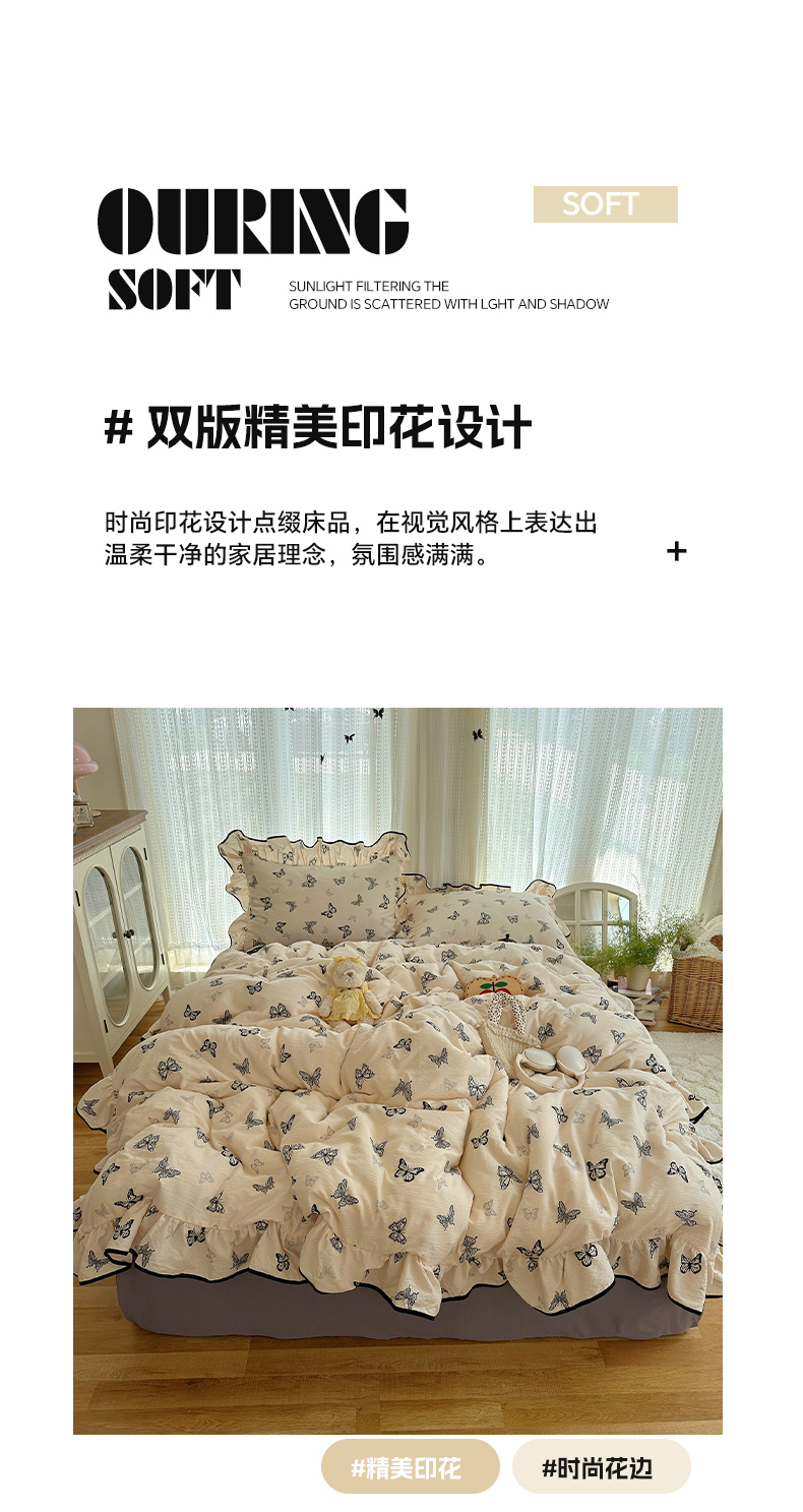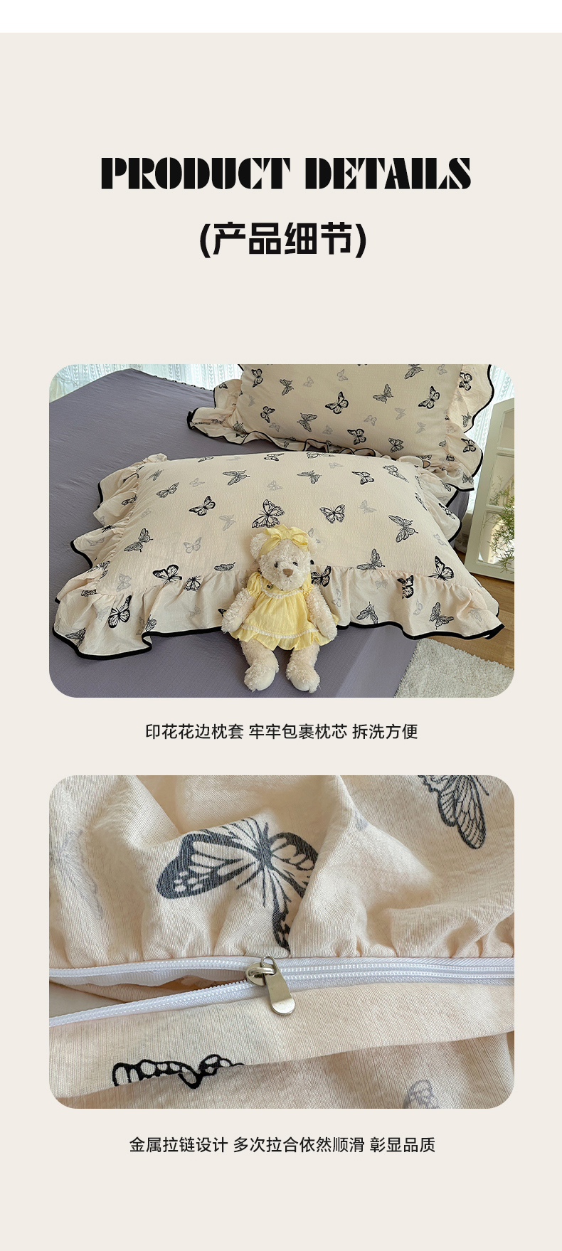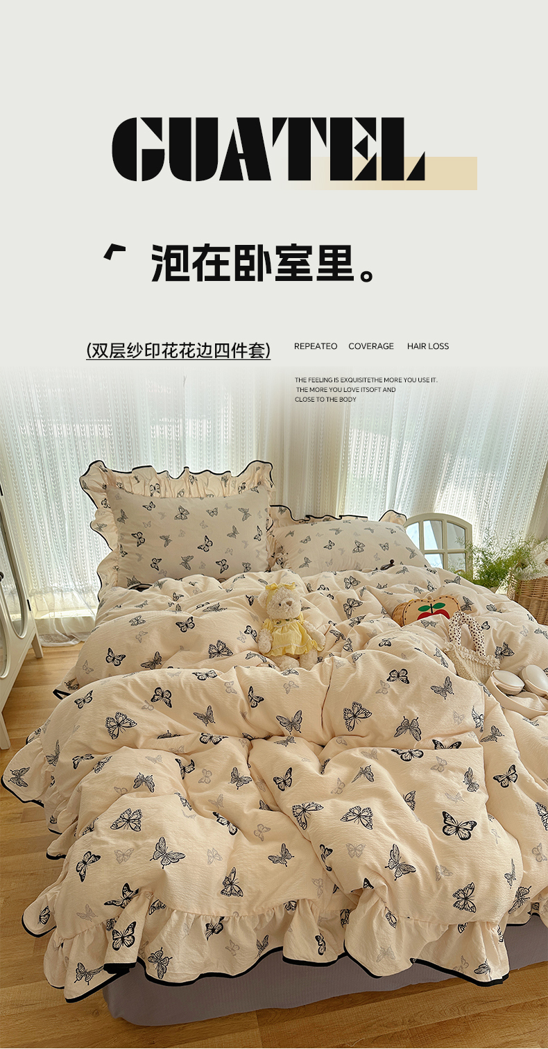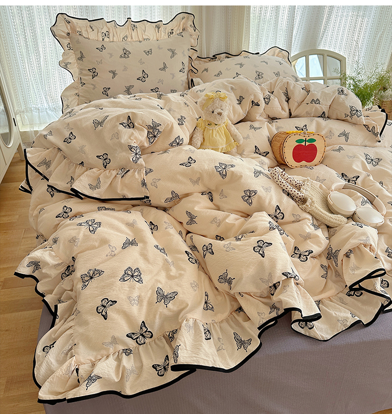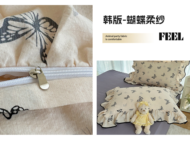商品名称:红嘴企鹅 2025新款韩版双拼花边四件套 韩版-蝴蝶柔纱