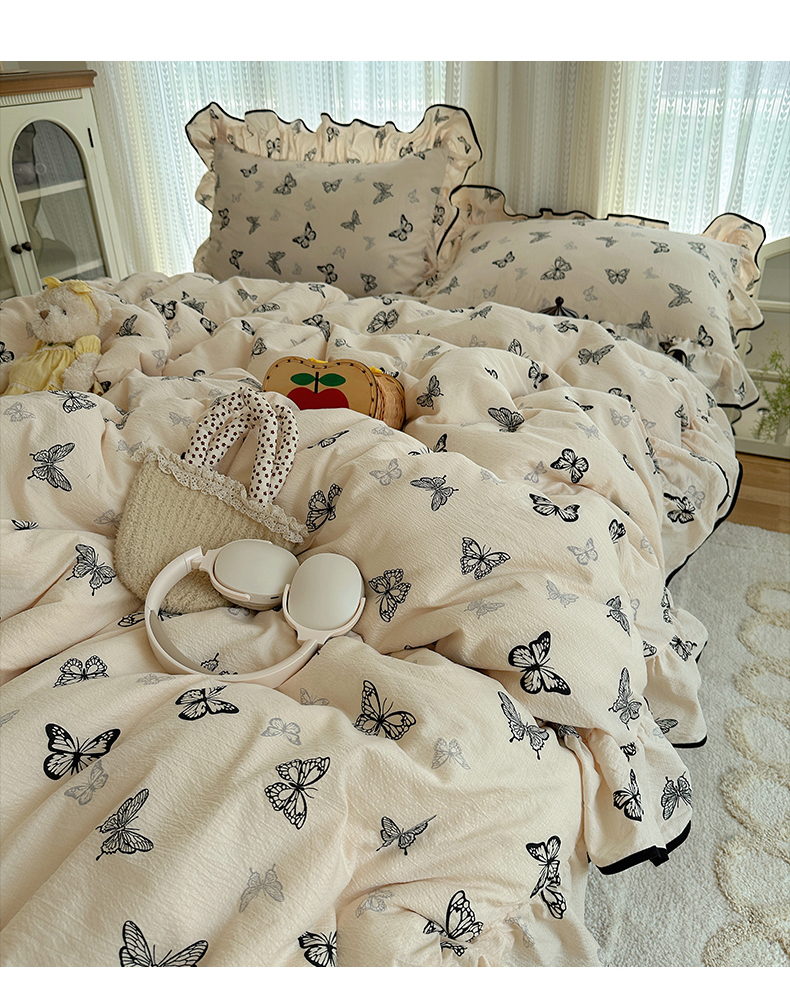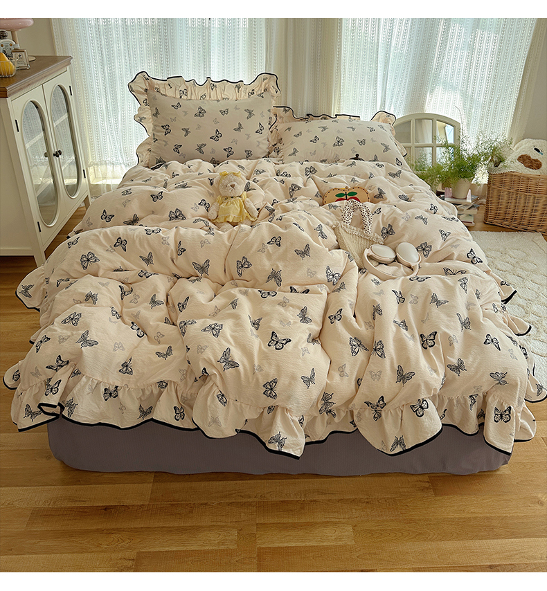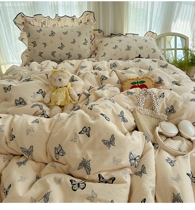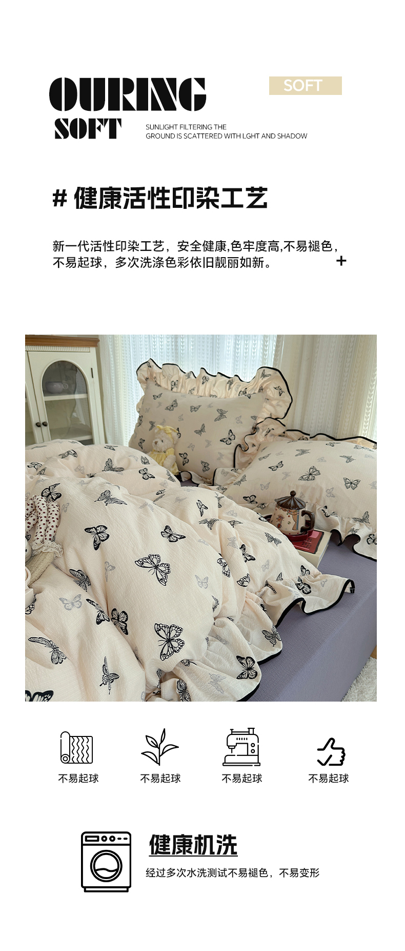 商品名称:红嘴企鹅 2025新款韩版双拼花边四件套 韩版-蝴蝶柔纱