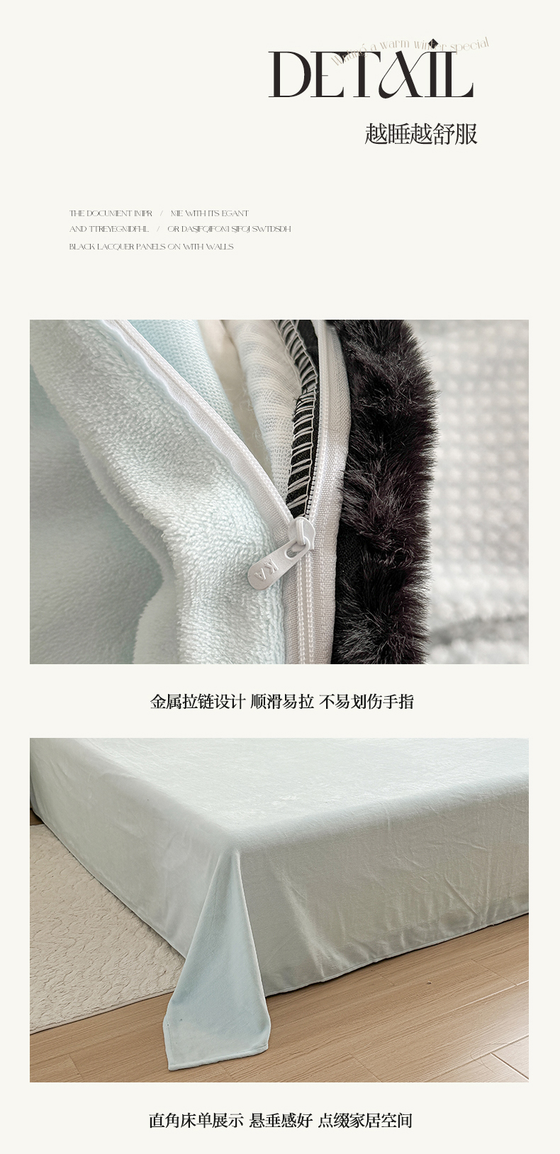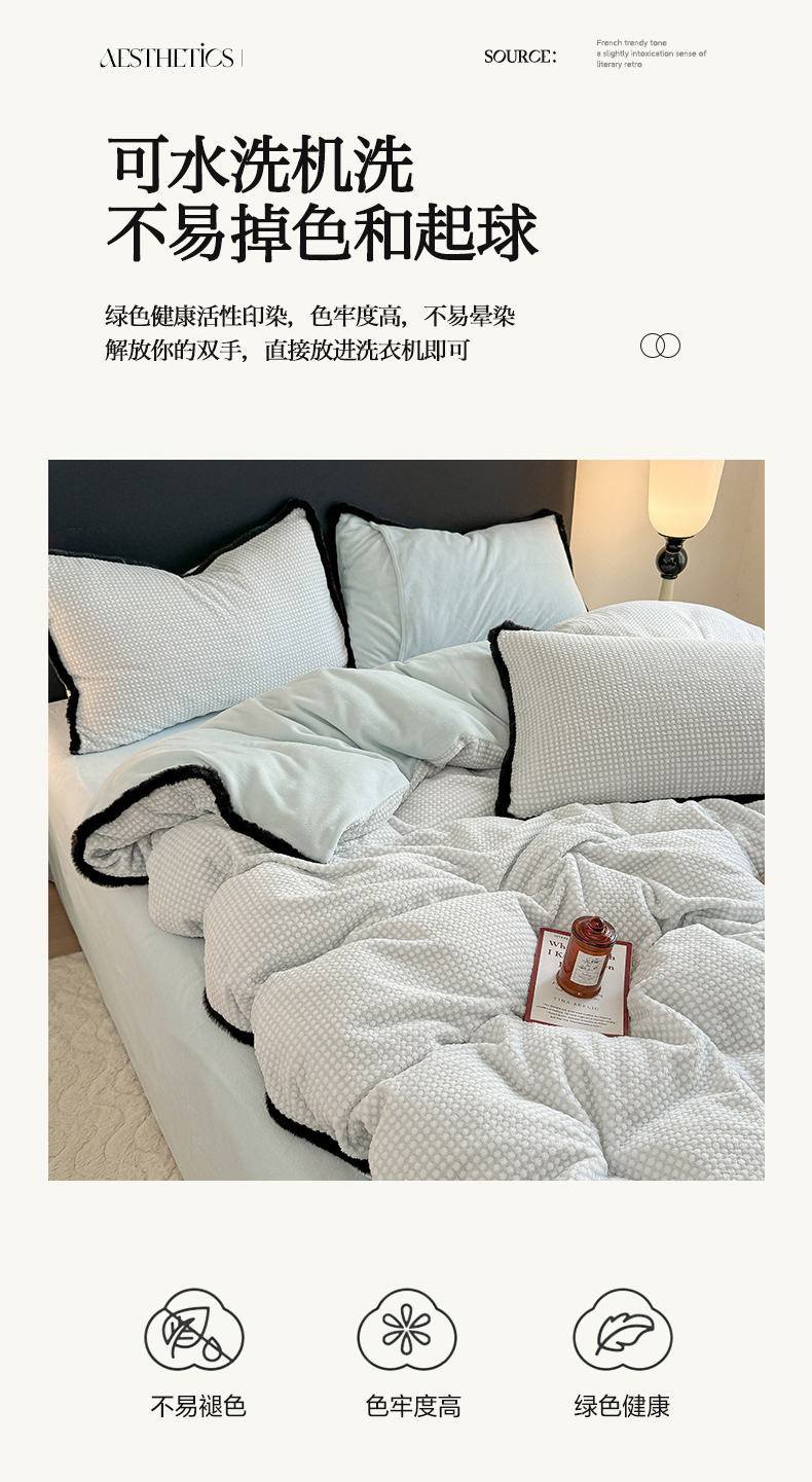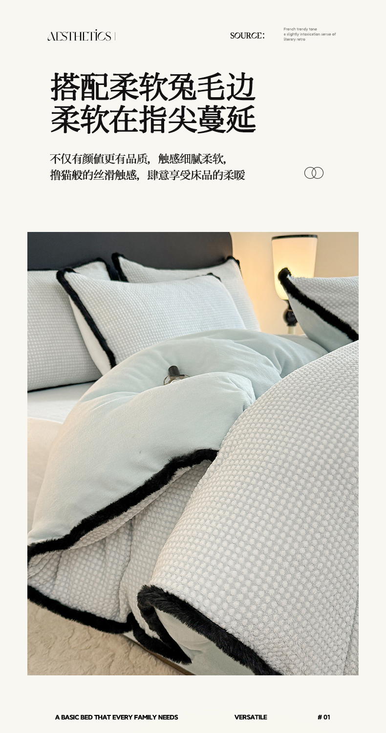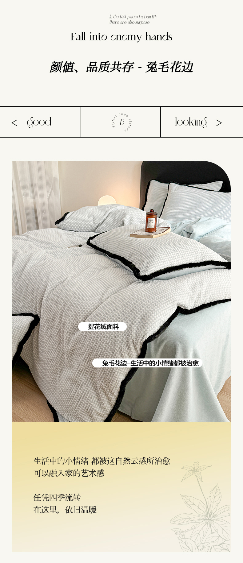 商品名称:KA家纺 2025冬兔毛边阳离子提花牛奶绒四件套 温雅系列 温雅蓝