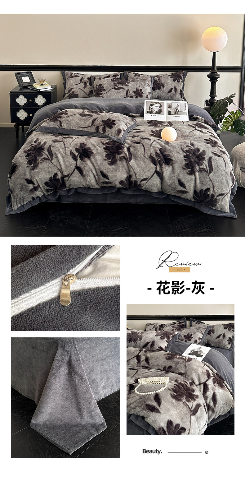 商品名称:绒世界 2025秋冬新款丹麦绒宽边牛奶绒四件套 宽边兔绒-花影-灰