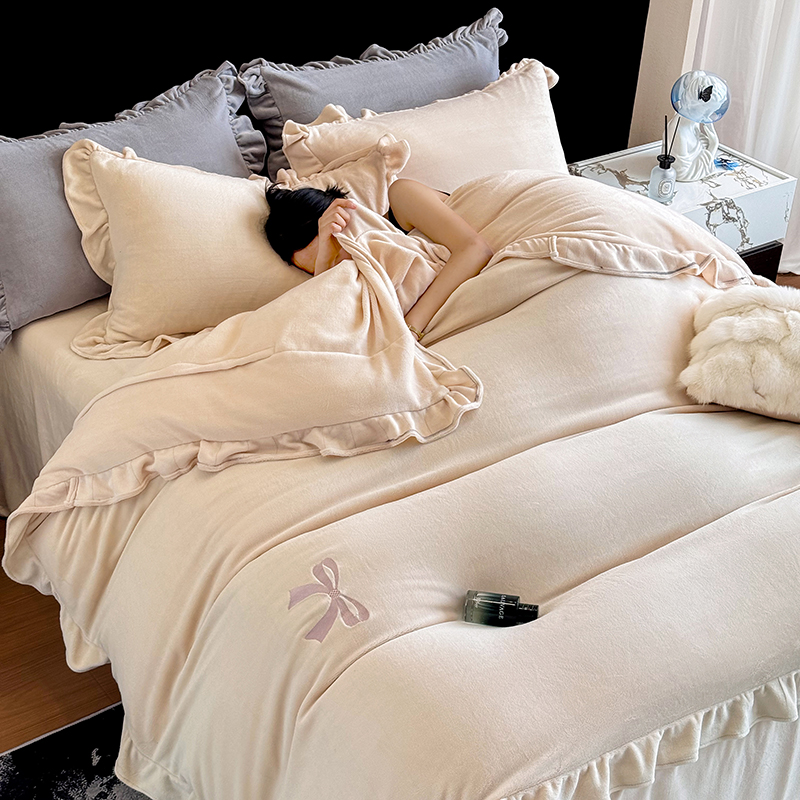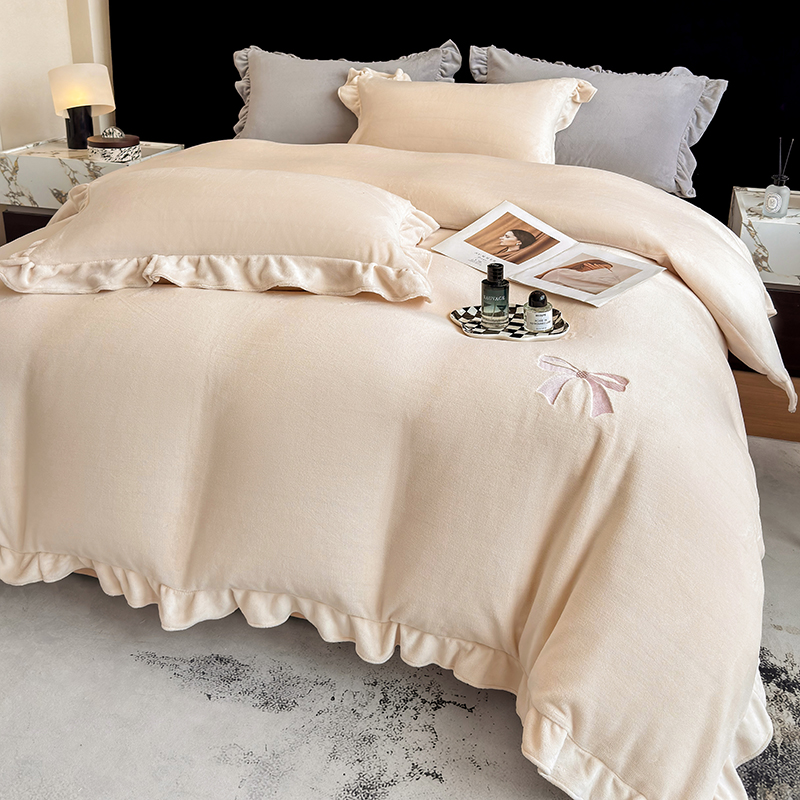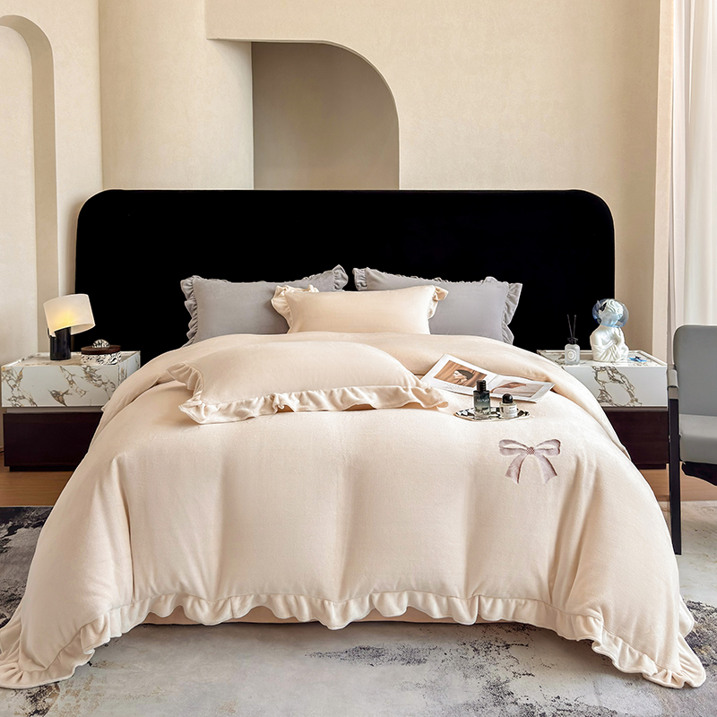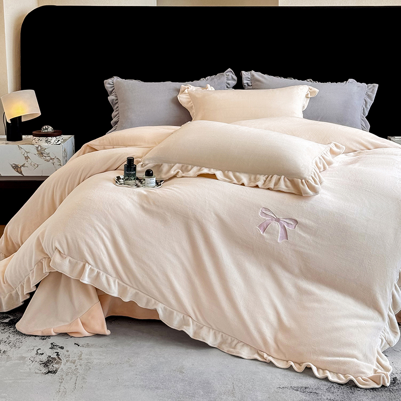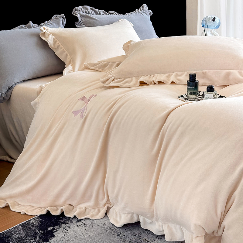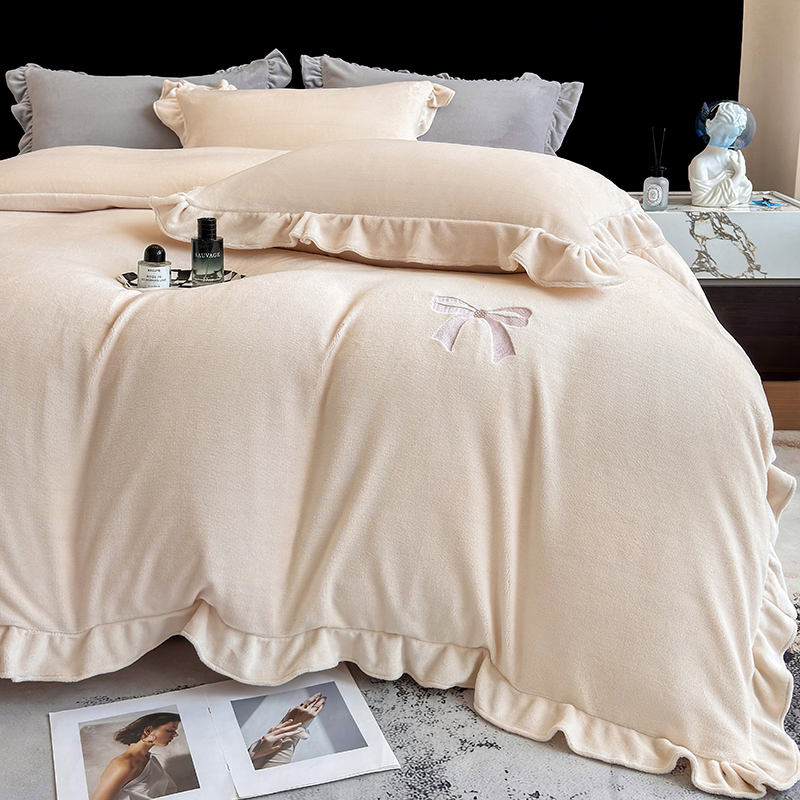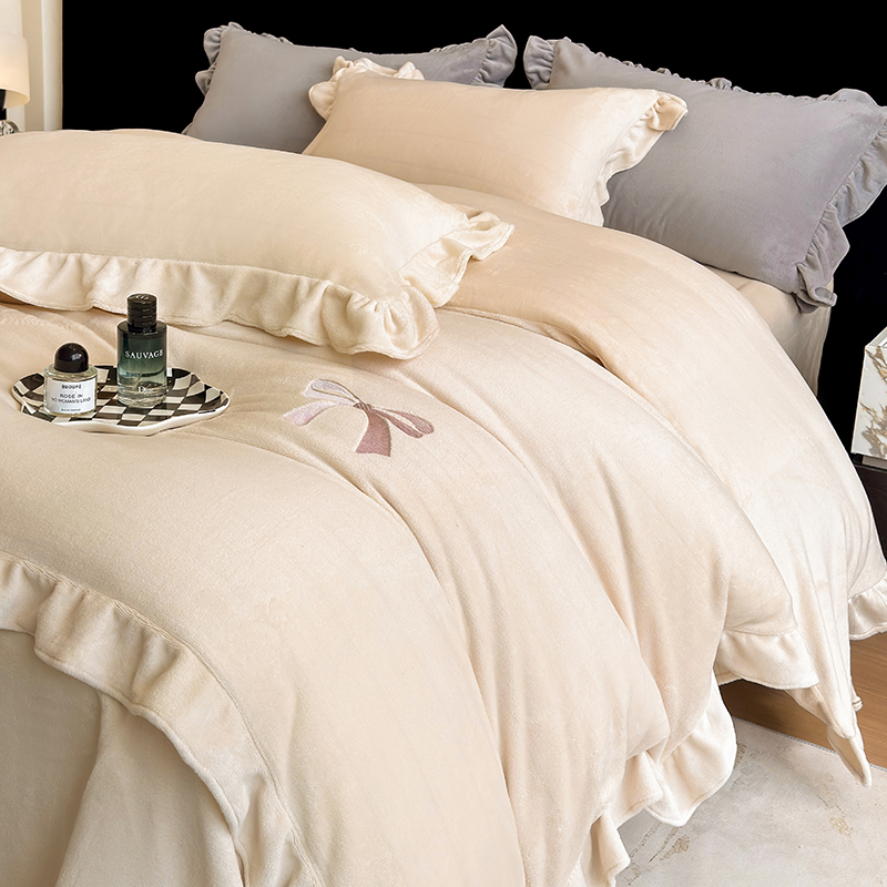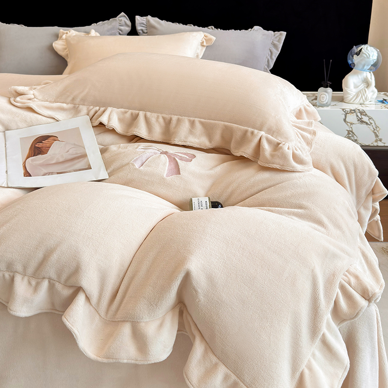 2025新款蝴蝶结绣花牛奶绒四件套 蝴蝶结-奶咖