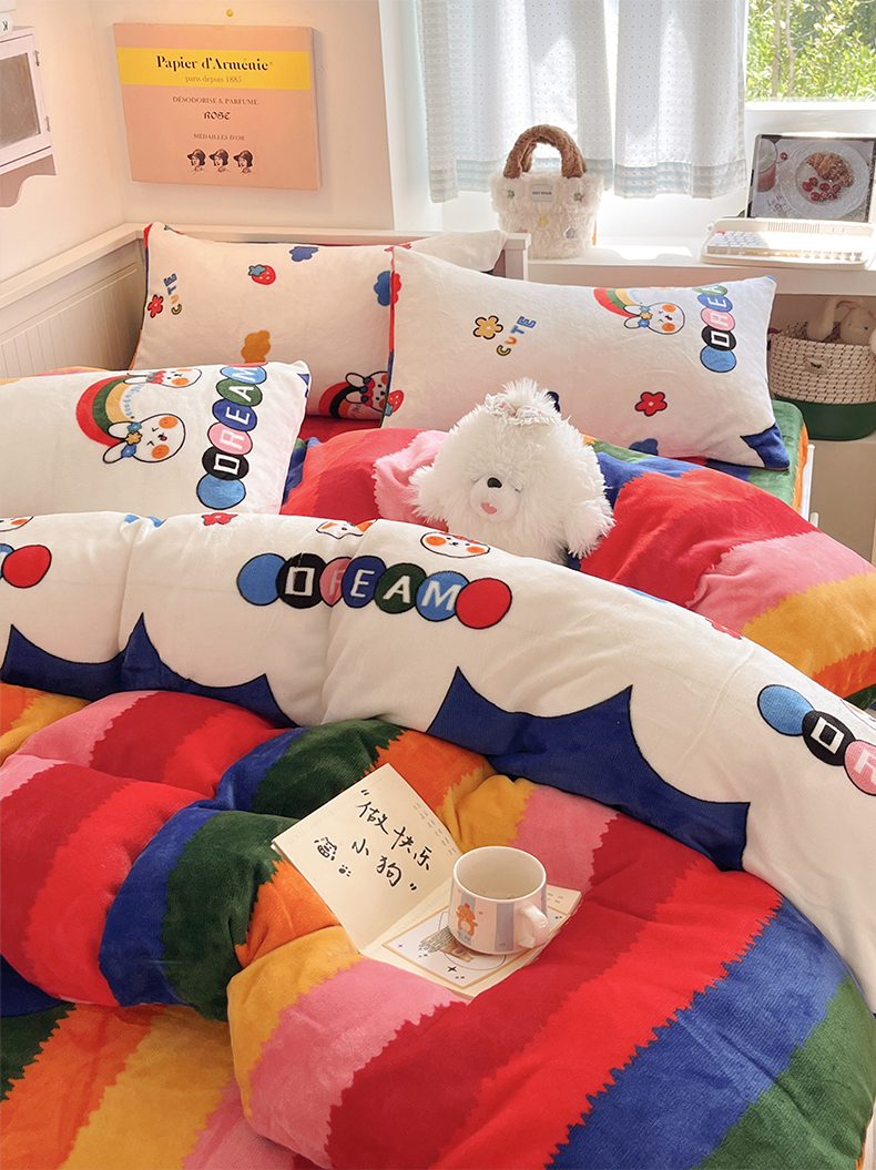 商品名称:桃子家居 2025新款A类ins小清新少女奶油卡通可爱加厚牛奶绒四件套 绒-彩虹兔