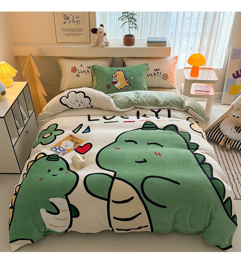 悦织湾家纺 2025新款大版卡通印花牛奶绒四件套儿童床绒套件学生宿舍单双人床上用品三四件套 熊熊零食