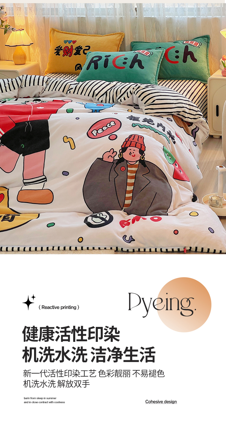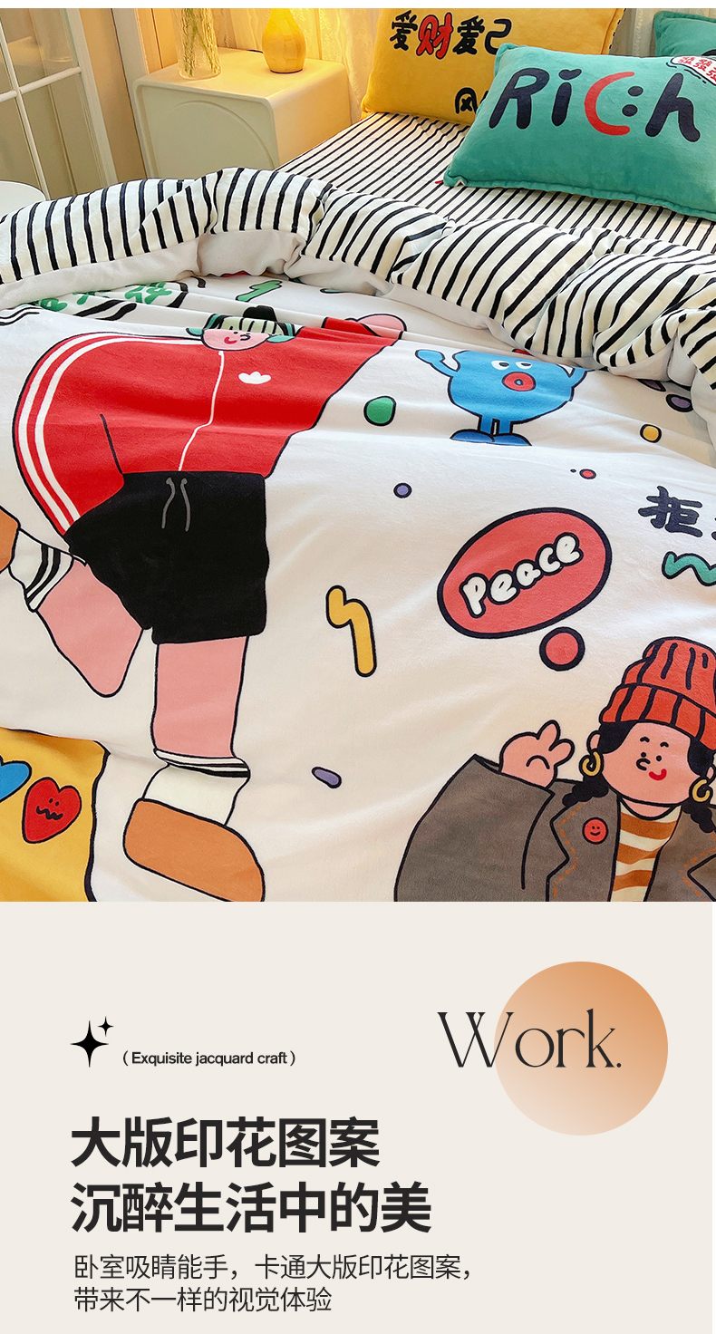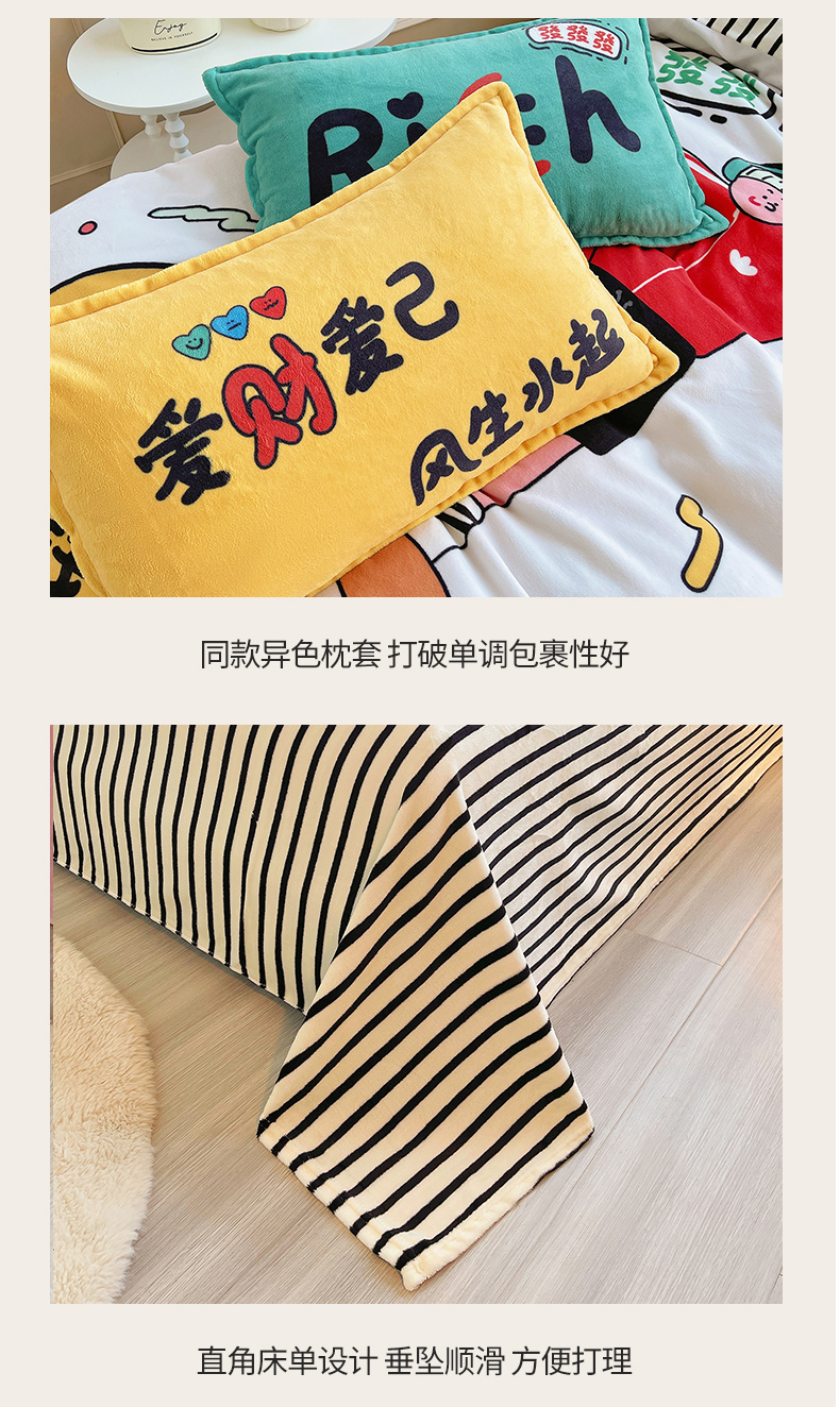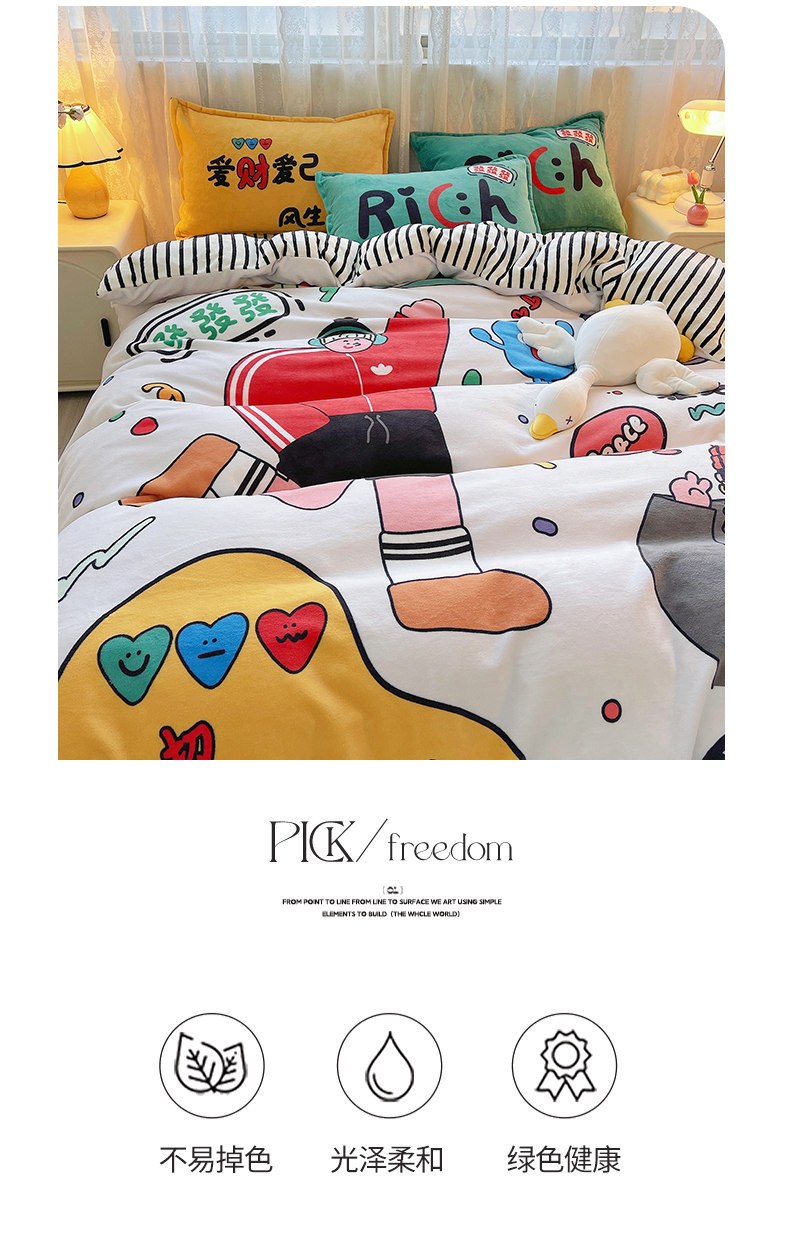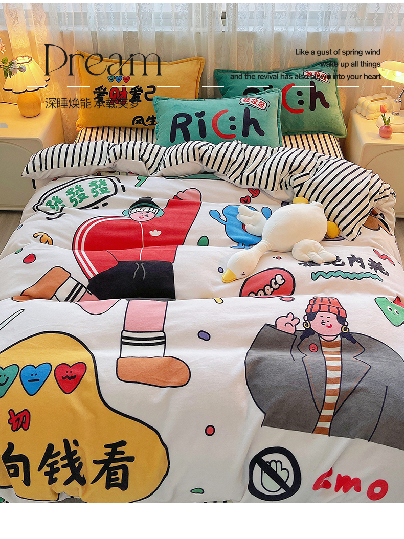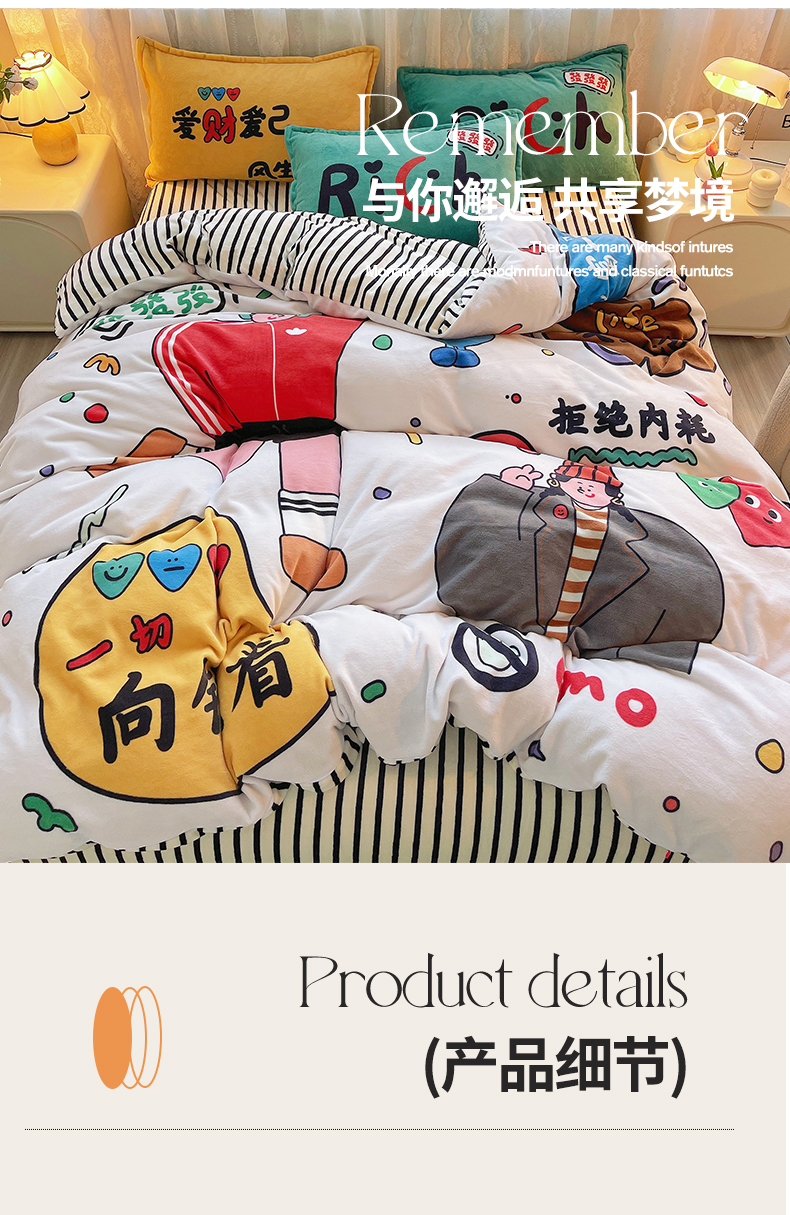 商品名称:炫拼家纺 2025新款大版数码印花卡通高克重牛奶绒四件套 向钱看