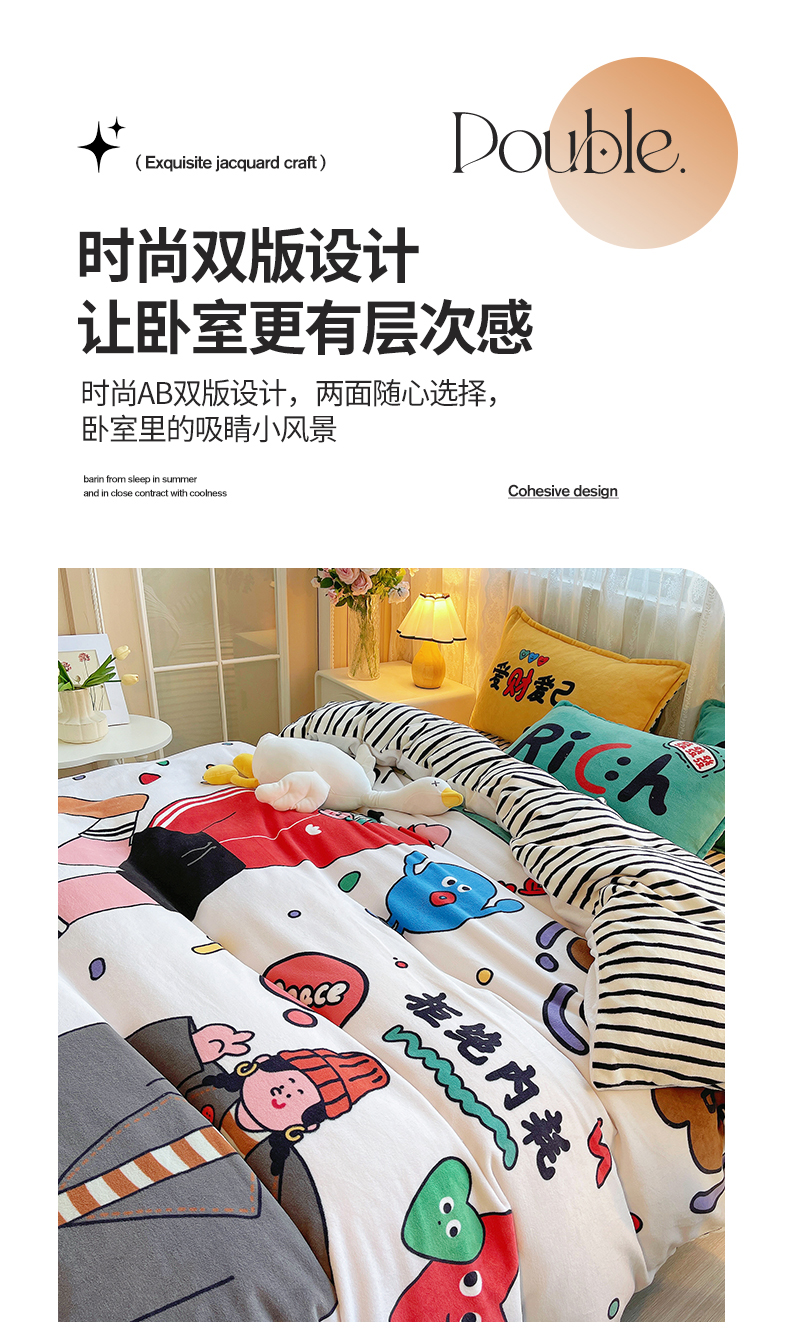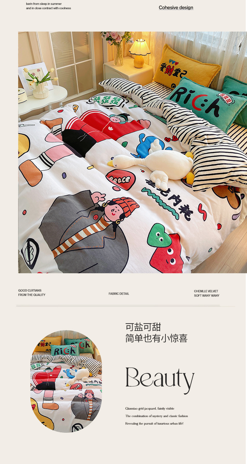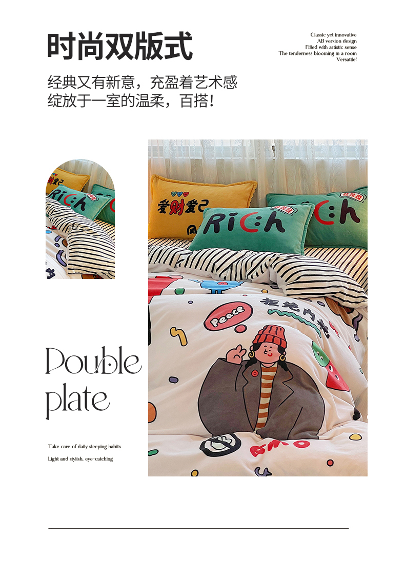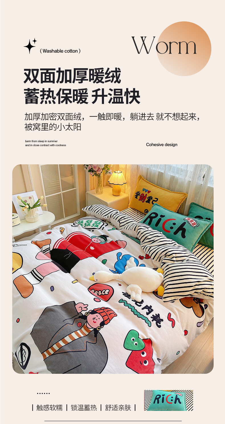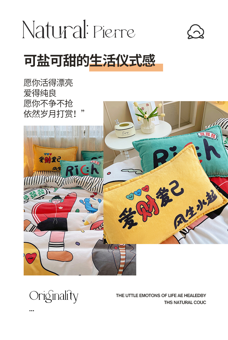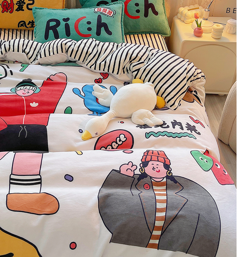 商品名称:炫拼家纺 2025新款大版数码印花卡通高克重牛奶绒四件套 向钱看