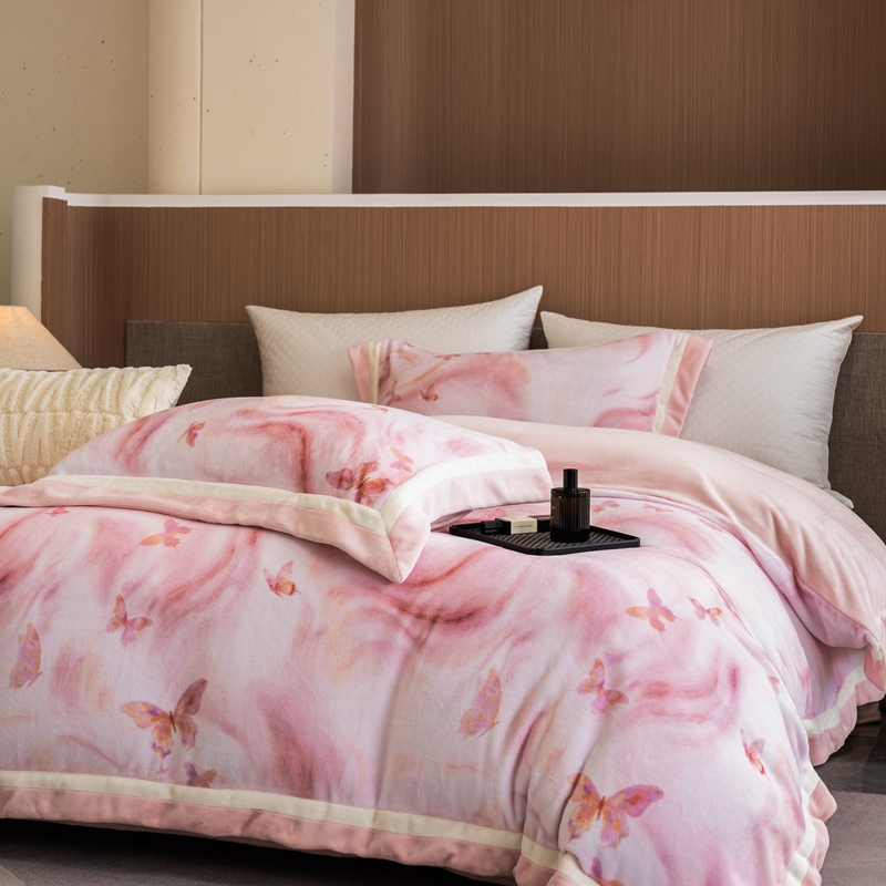 商品名称:瑞雪家居 2025新款全消光数码印花牛奶绒系列四件套 蝶舞粉
