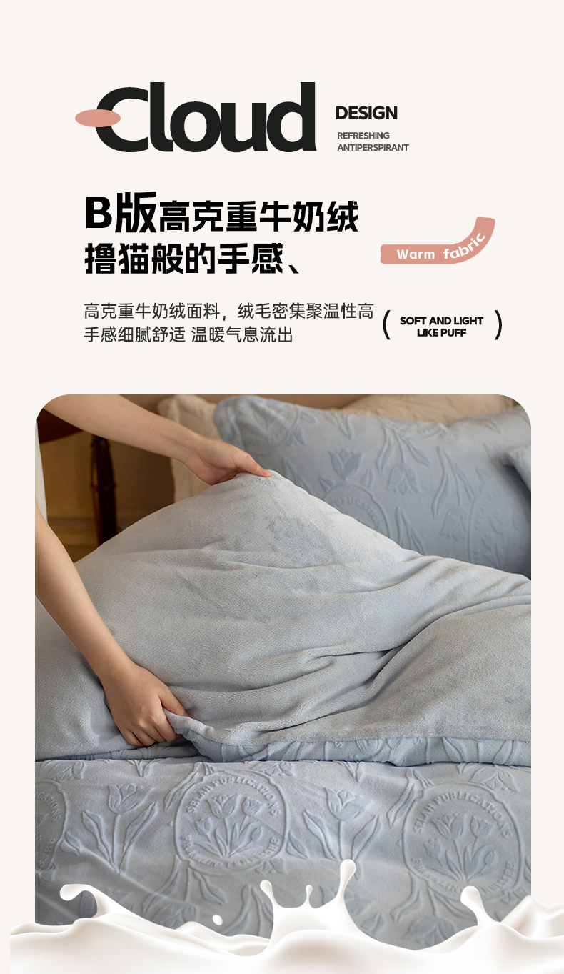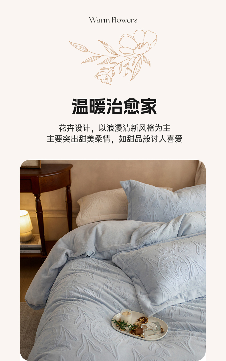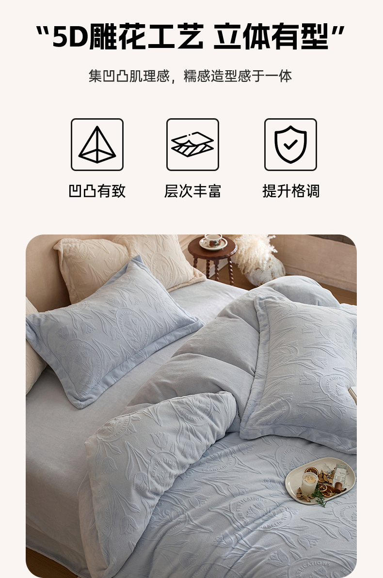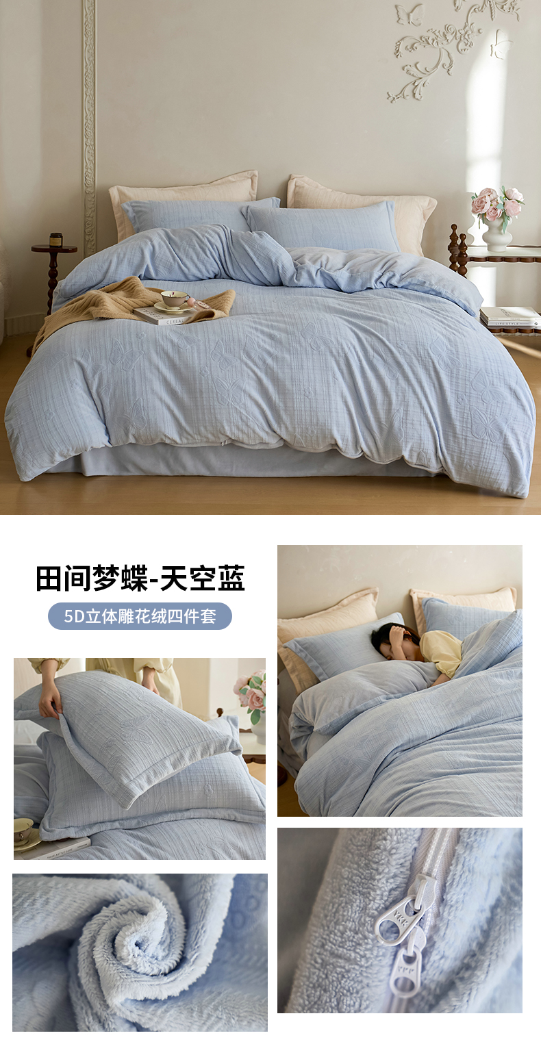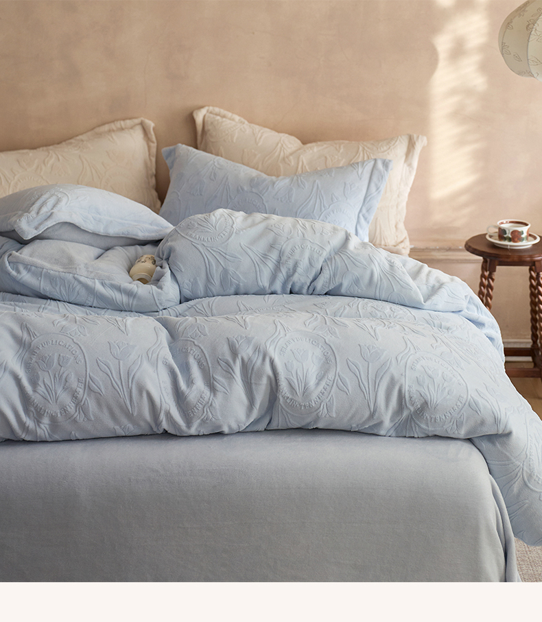 当前位置: 91家纺网 > 商品网购 > 床品套件 > 四件套 > 牛奶绒四件套 > 亿梵家居 2025秋冬新款A类全消光牛奶绒立体5D雕花绒四件套-风格一 (提供买家秀) 郁金香-天空蓝