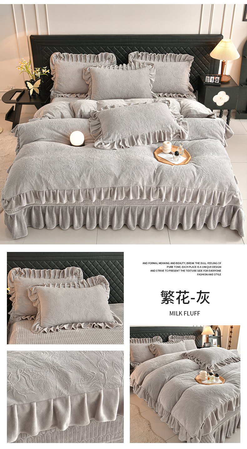 商品名称:赫本家纺 2025新款高克重纯色花边款雕花绒床盖款四件套 繁花-灰