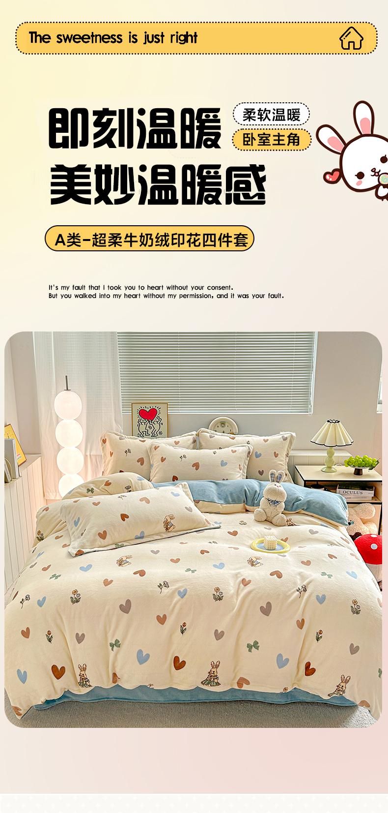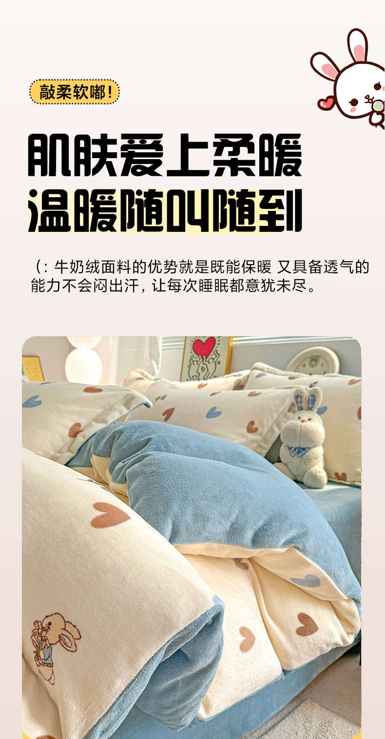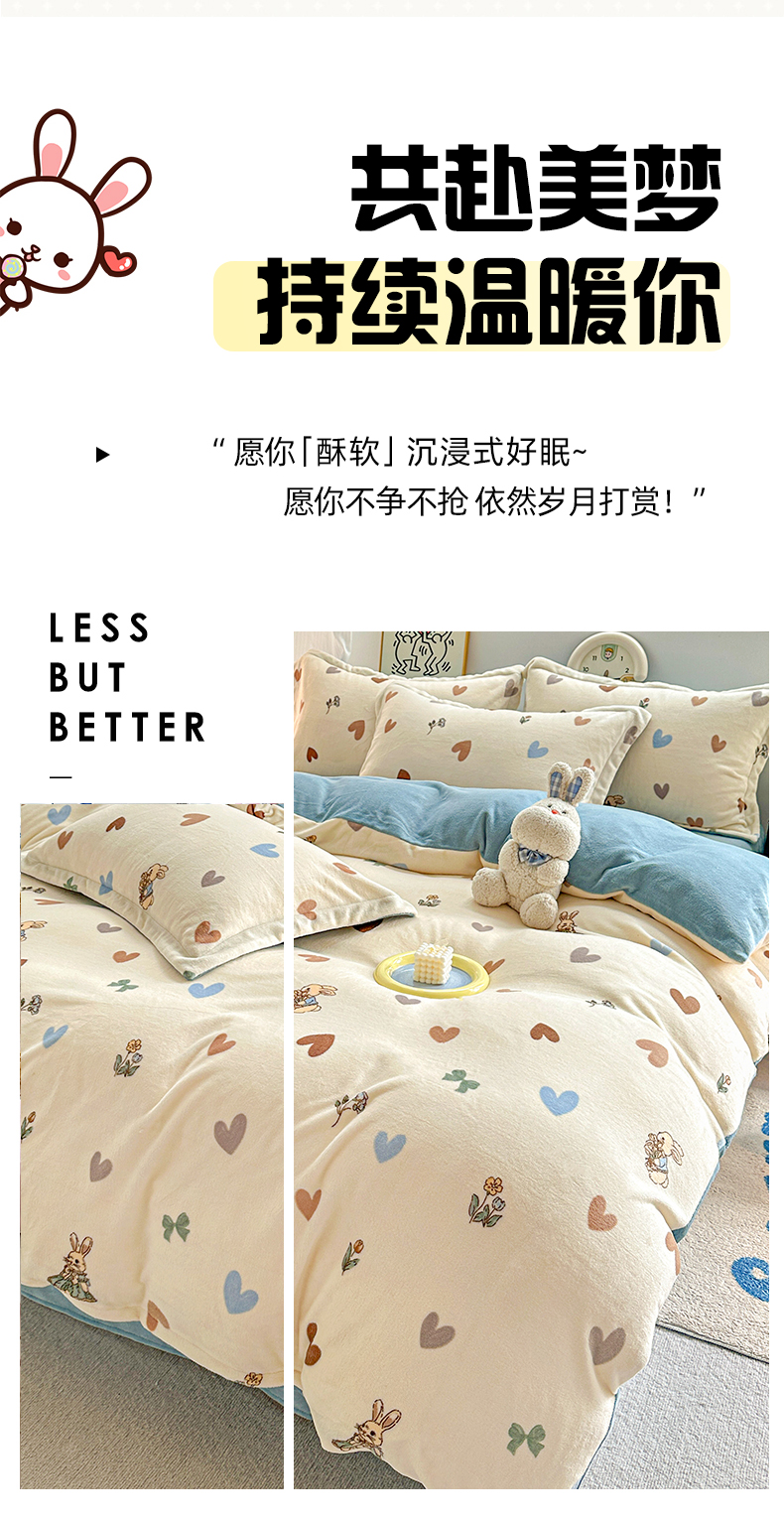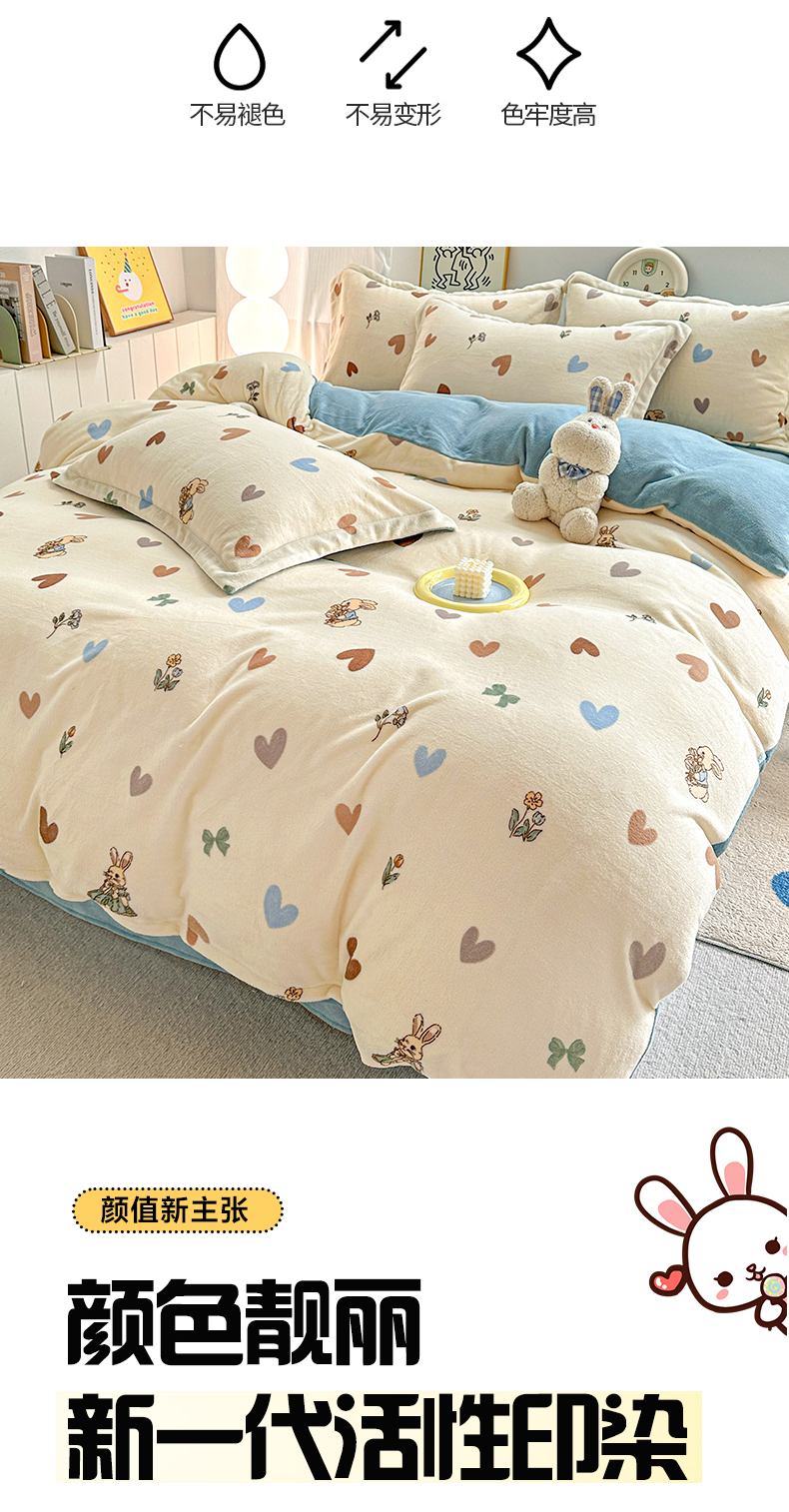 当前位置: 91家纺网 > 商品网购 > 床品套件 > 四件套 > 牛奶绒四件套 > 简一 2025新款小清新牛奶绒印花四件套-卡通系列 兔伴心河