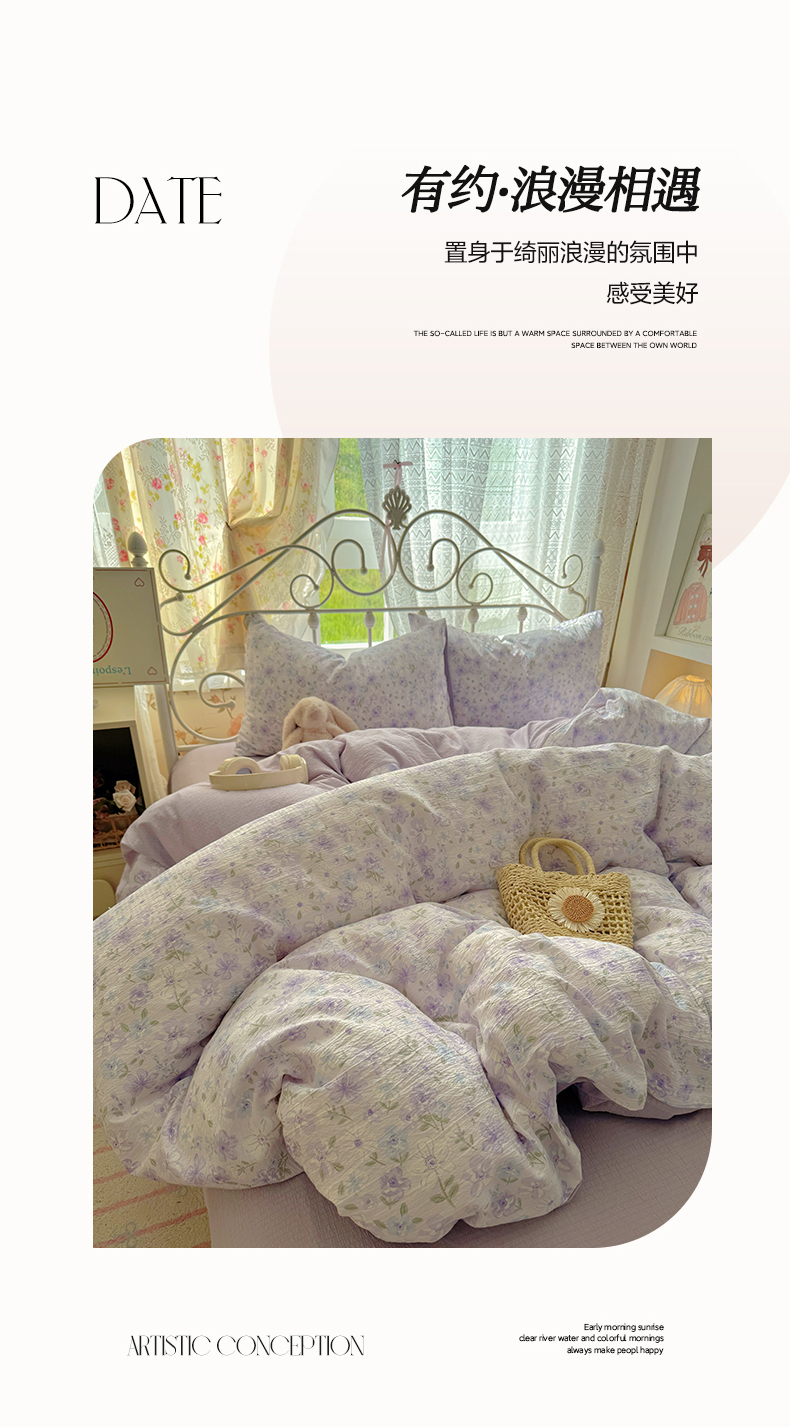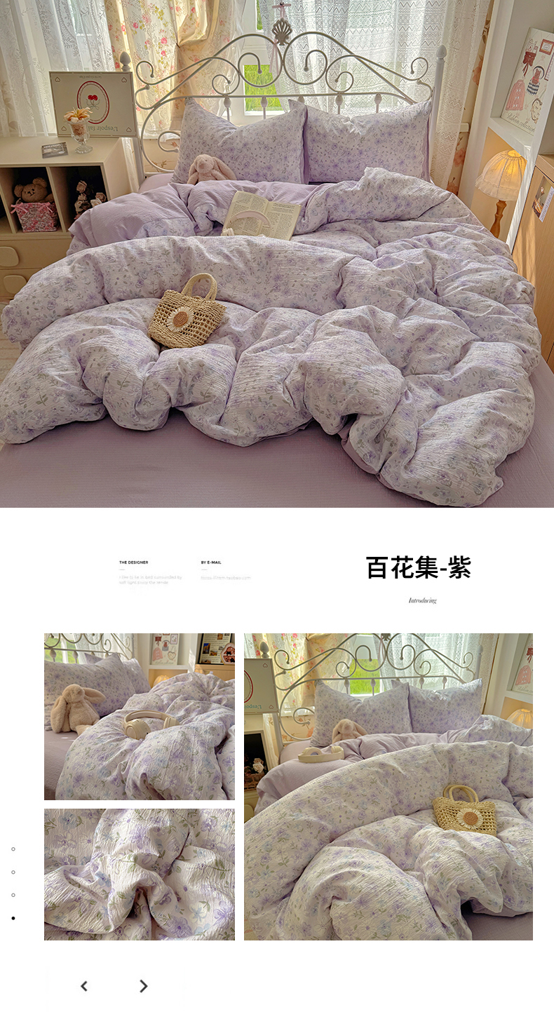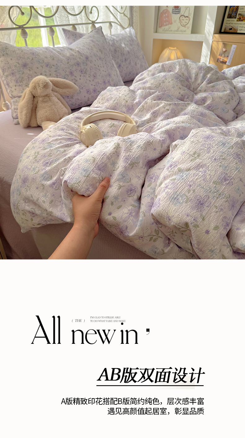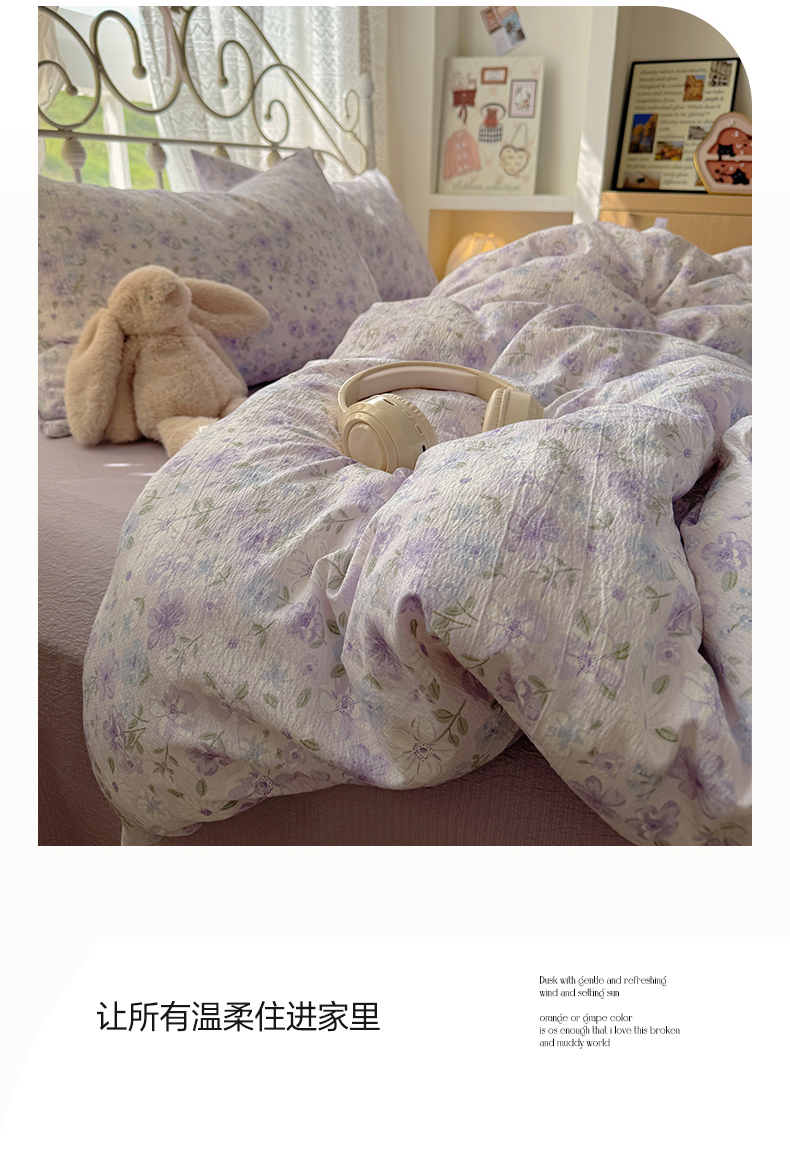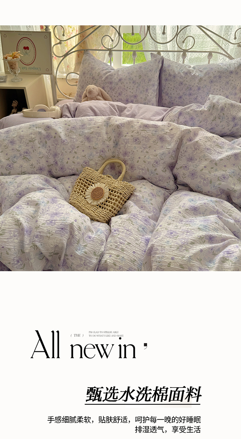 当前位置: 91家纺网 > 商品网购 > 床品套件 > 四件套 > 水洗棉四件套 > 阿曼达 2025爆款云感木m透气柔软印花可爱卡通软糯皱皱亲肤四件套 百花集-紫