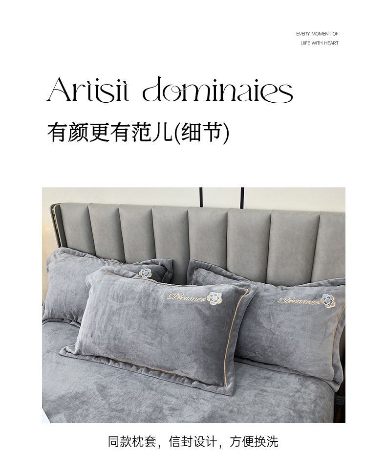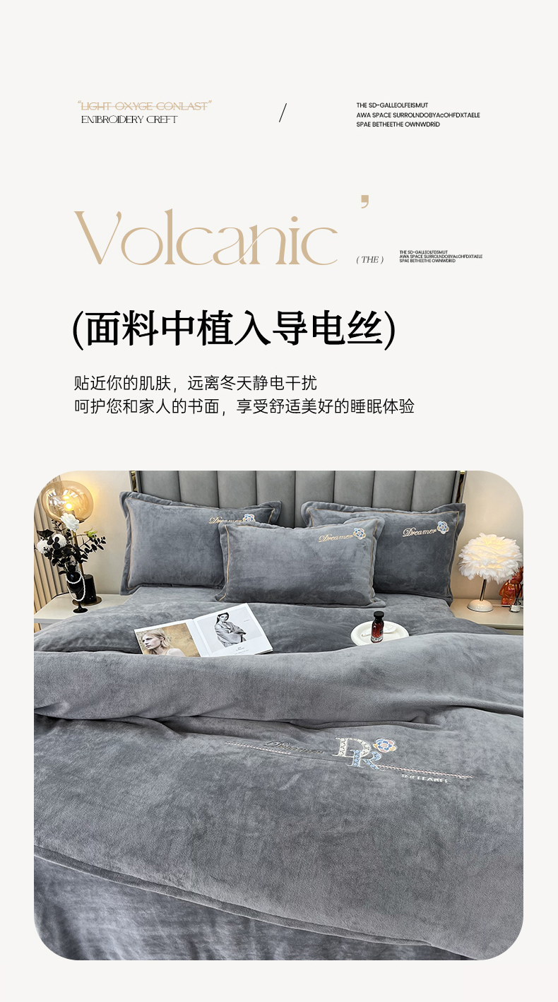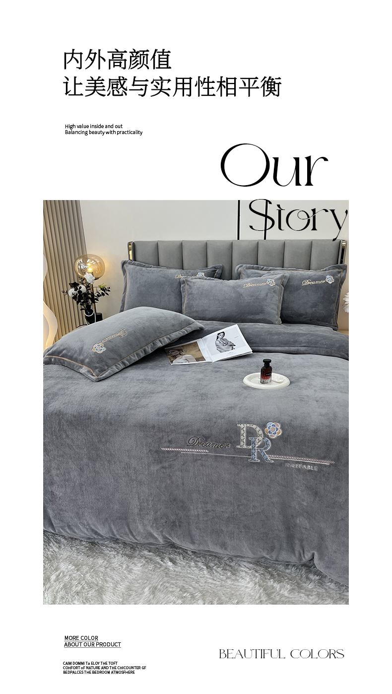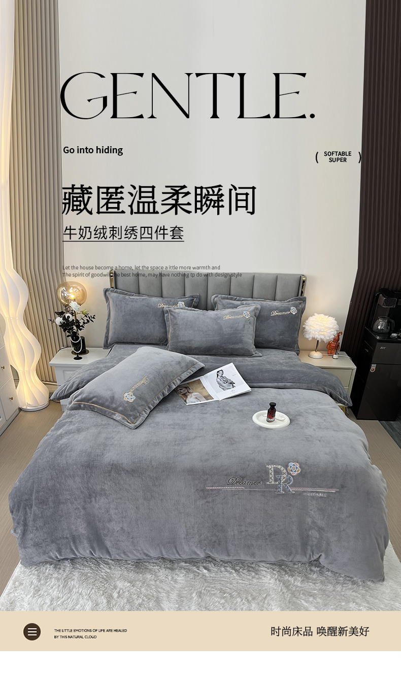 商品名称:逸林家纺《原希尔顿逸林》 2025新款牛奶绒绣花四件套-可可系列 可可-雅士灰