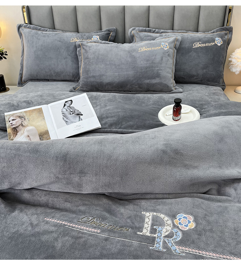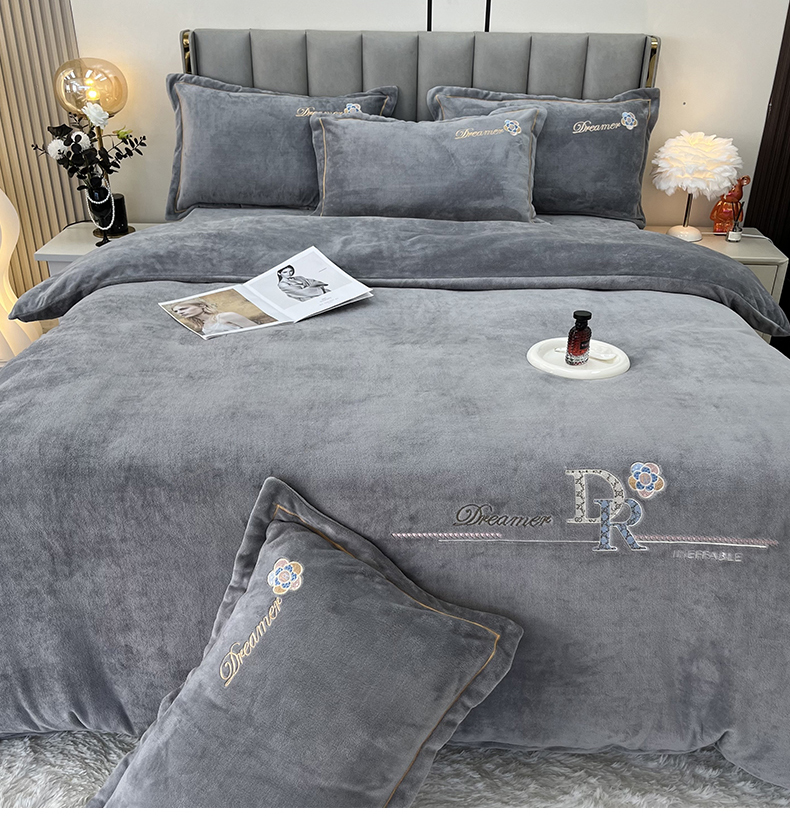 逸林家纺《原希尔顿逸林》 2025新款牛奶绒绣花四件套-可可系列 可可-雅士灰