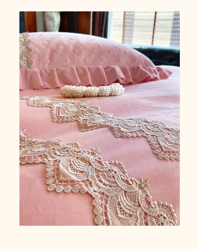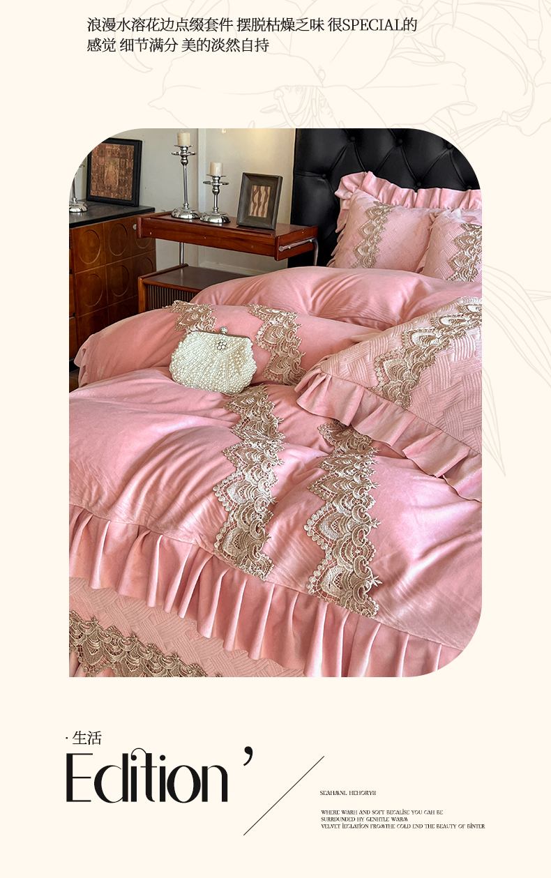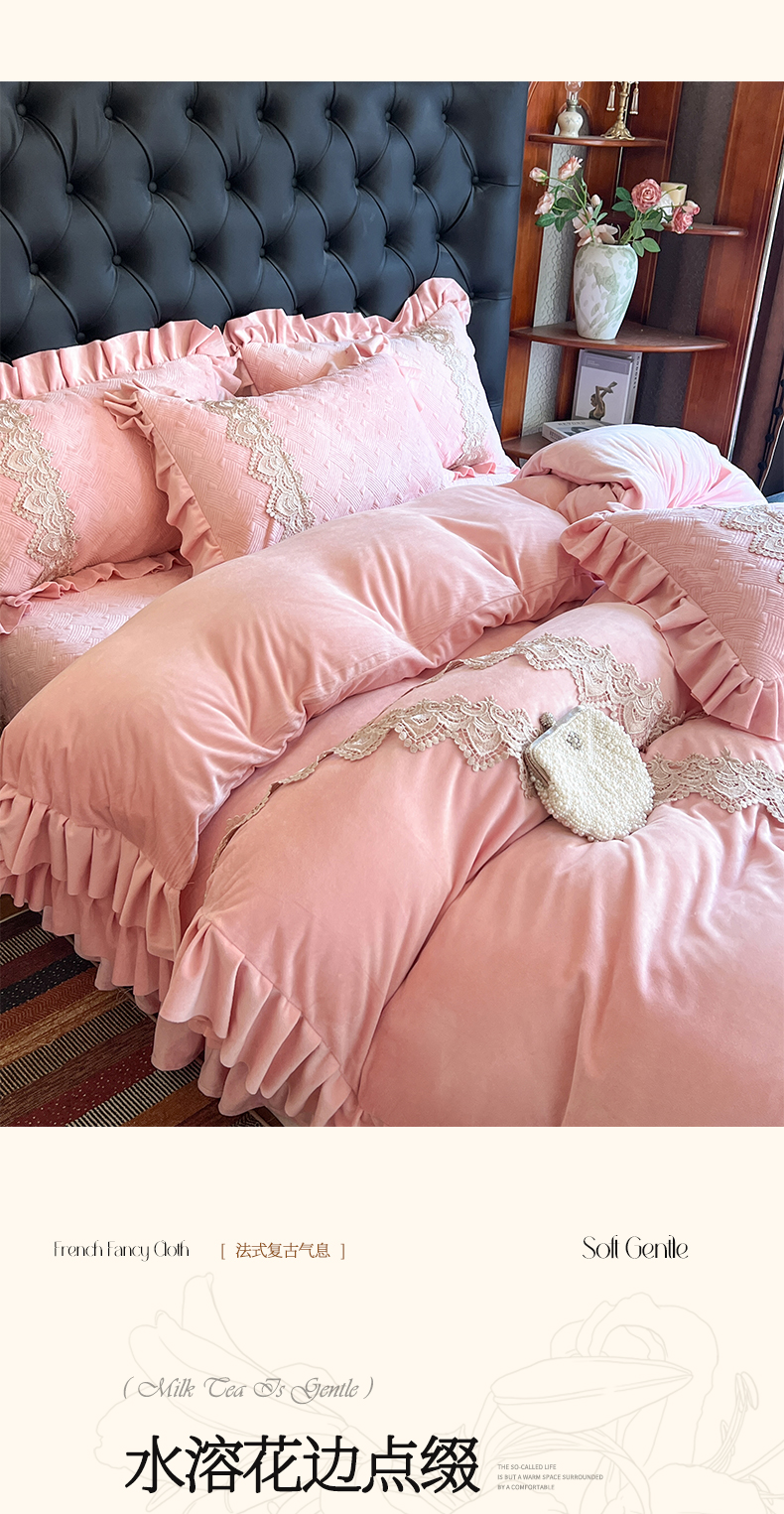 (总)瑞宝 2025新款雕花牛奶绒花边夹棉床盖四件套-莫妮卡,奶昔白,抹茶绿,奶茶咖,少女粉,雾蓝
