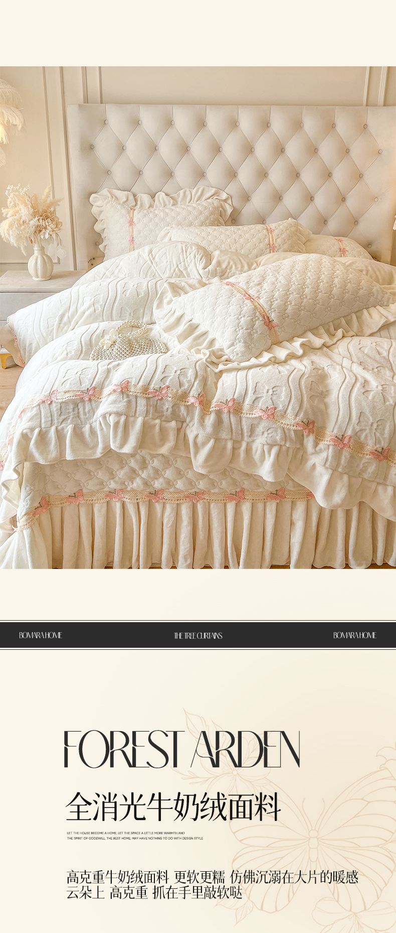 商品名称:瑞宝 2025新款牛奶绒花边床盖四件套-蝶舞花语(控价 298起 ) 蝶舞花语-奶油米