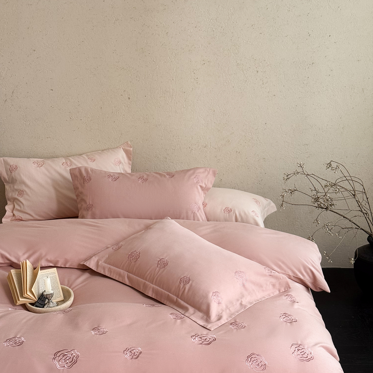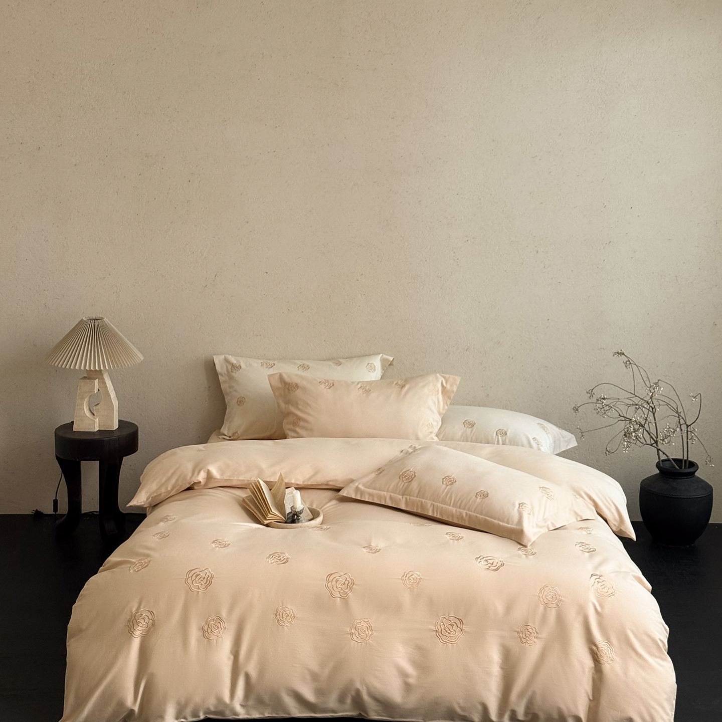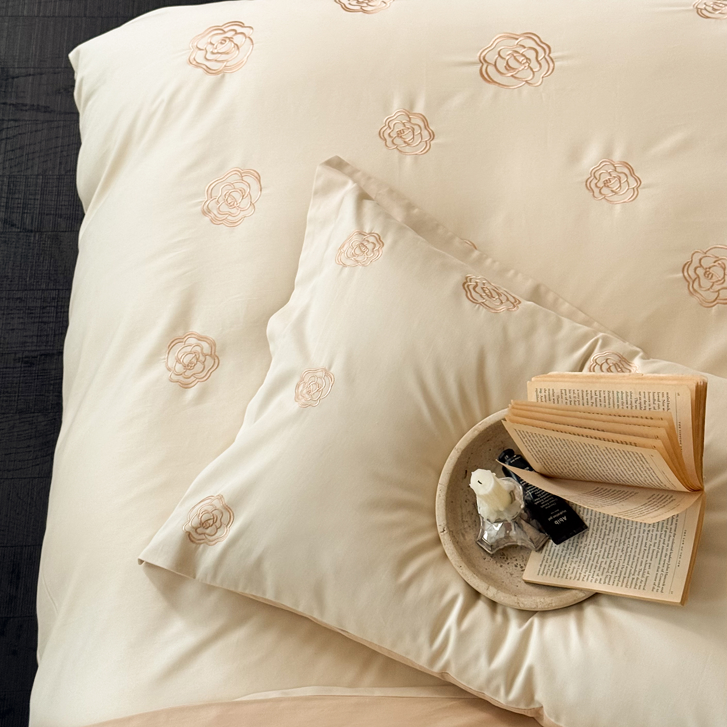 (总)佳汐蓝 2025春夏新品双层皱皱纱刺绣+织带+荷叶边四件套--白茶花,奶白,曲奇