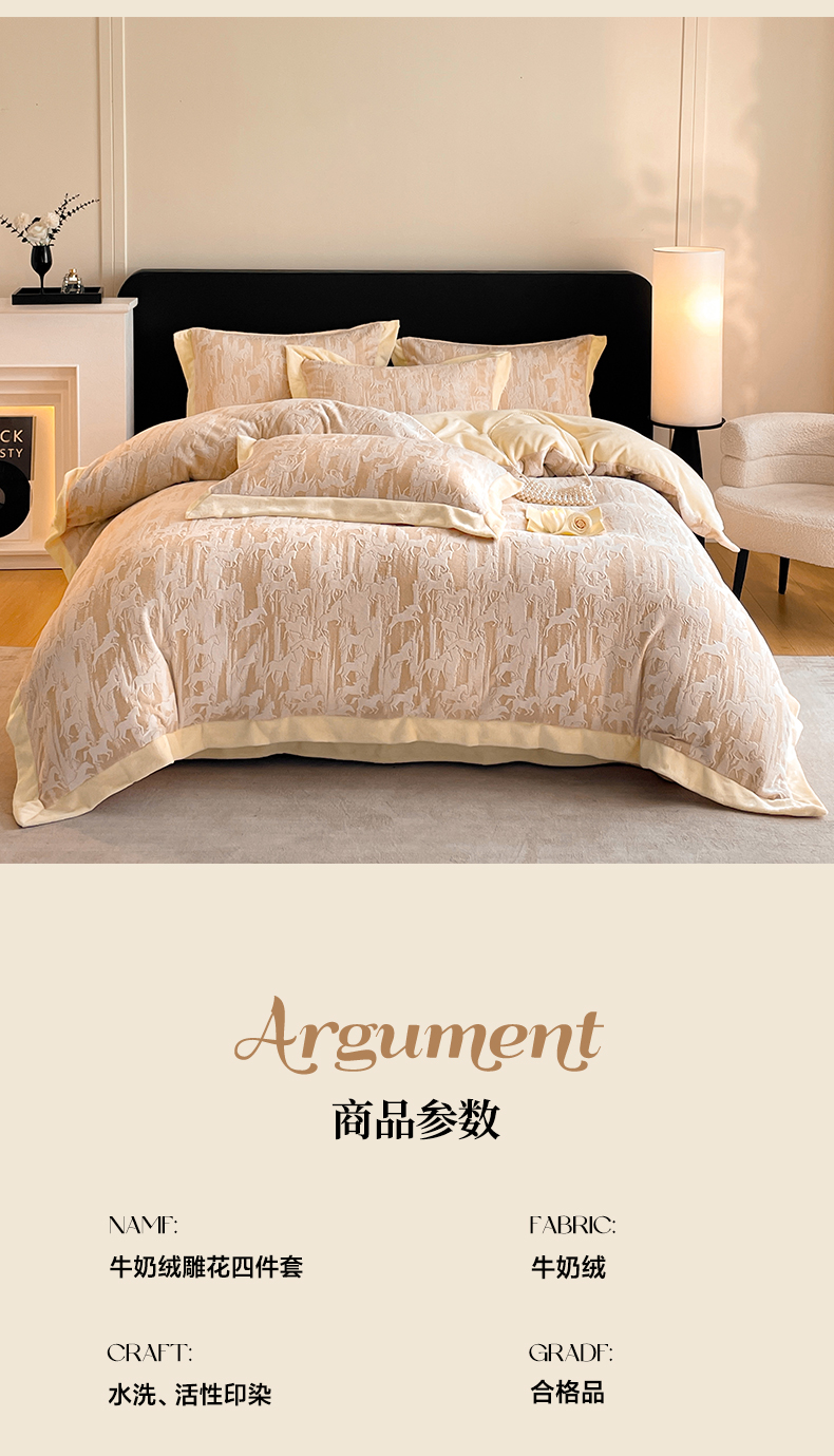 商品名称:畅畅家纺 2025新款冬季拼角雕花牛奶绒宽包边床单床笠四件套 英伦骑士-浅米咖