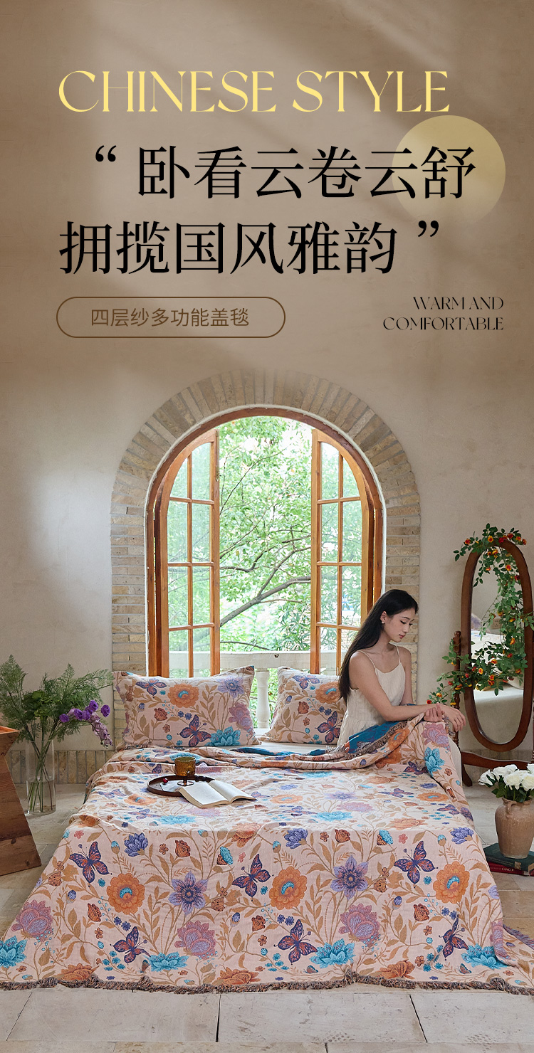 沐瑟家纺 2025新款亲肤柔软全棉纱布中国风盖毯毯子 花蝶-米