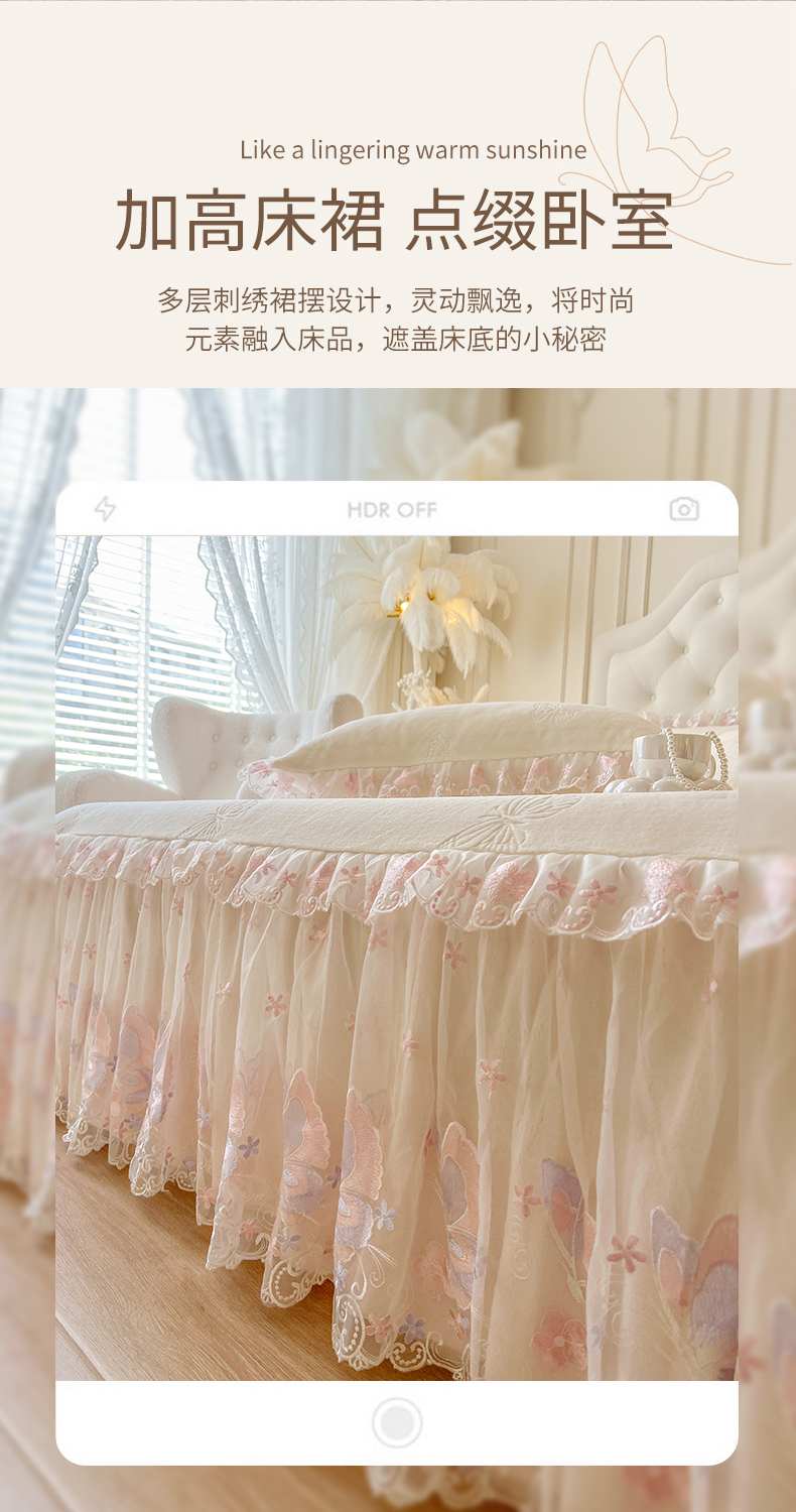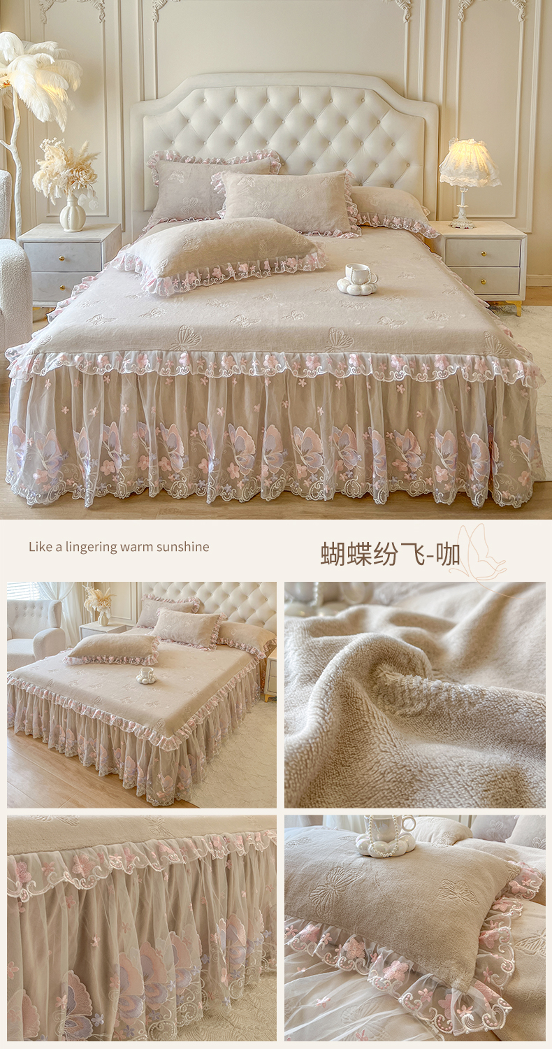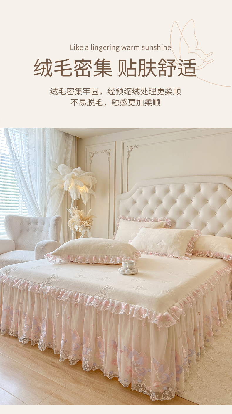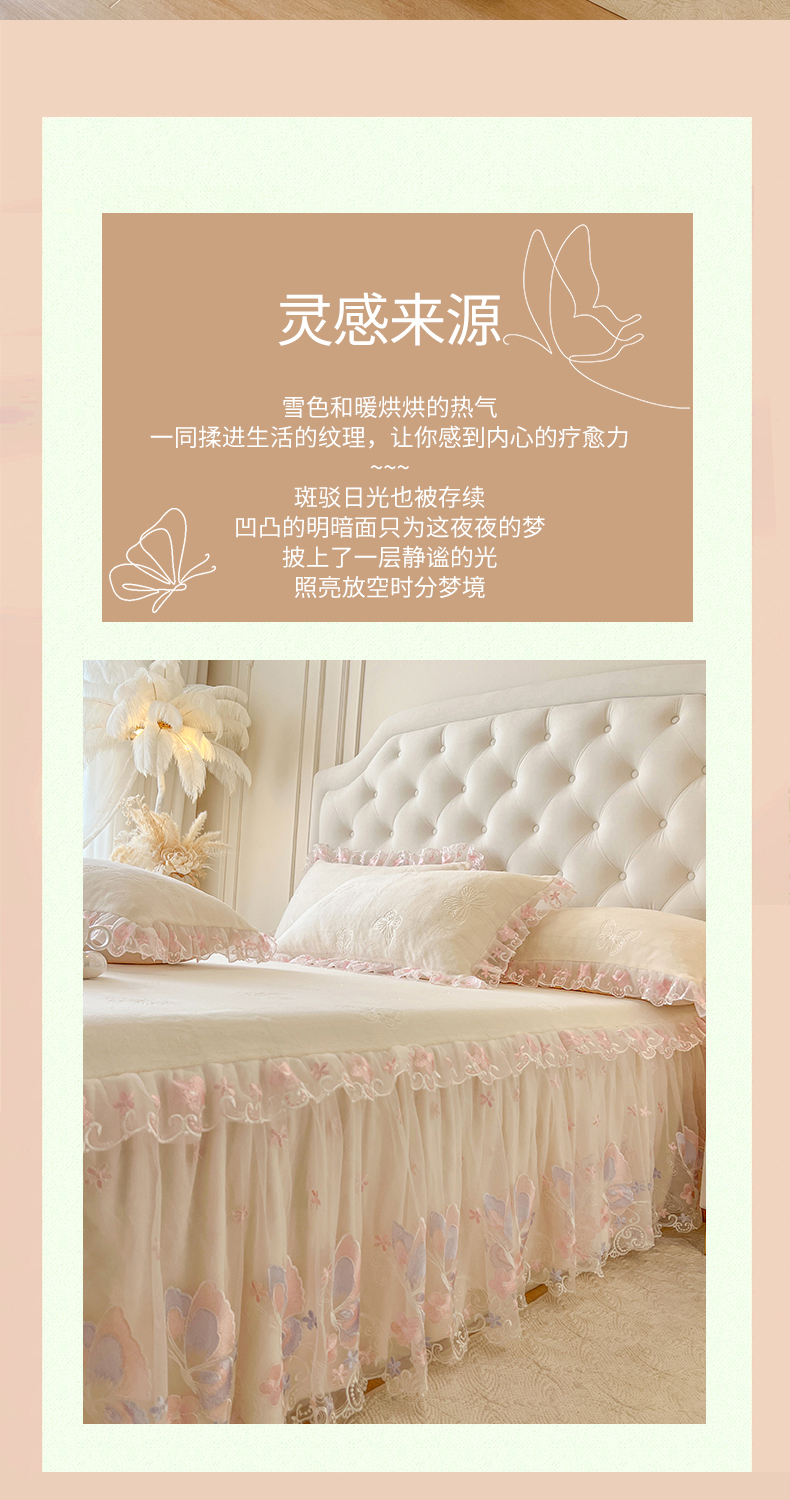 • 91家纺网 家纺一手货源 找家纺 网红馆(ck家纺) 2025新款牛奶绒刺绣单床裙 床裙单件-蝴蝶纷飞系列 蝴蝶纷飞-米