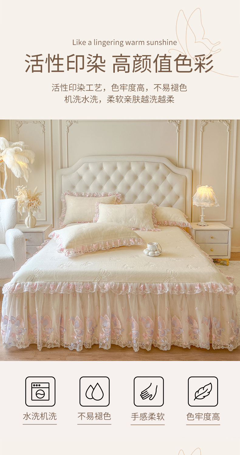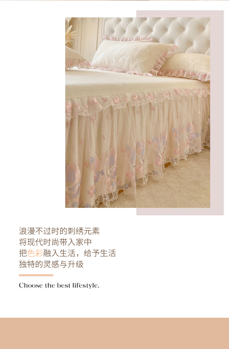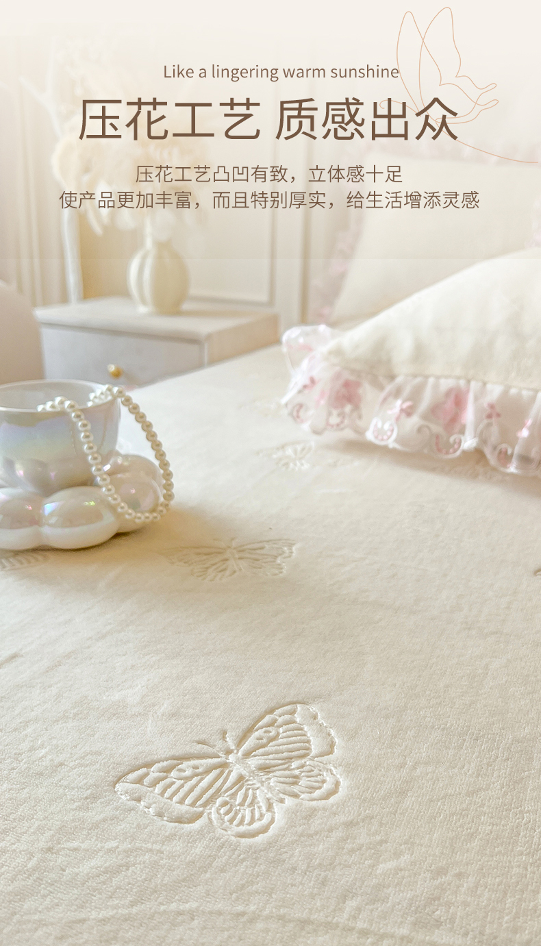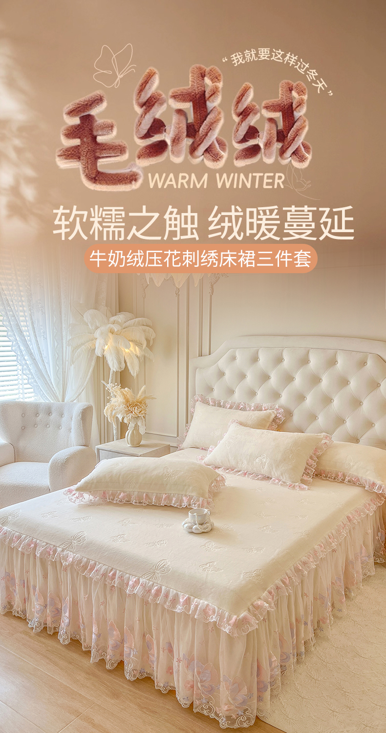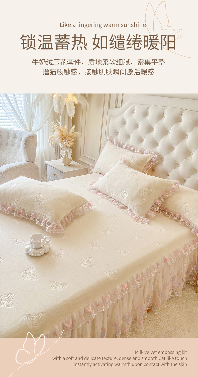 • 91家纺网 家纺一手货源 找家纺 网红馆(ck家纺) 2025新款牛奶绒刺绣单床裙 床裙单件-蝴蝶纷飞系列 蝴蝶纷飞-米
