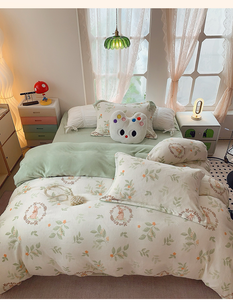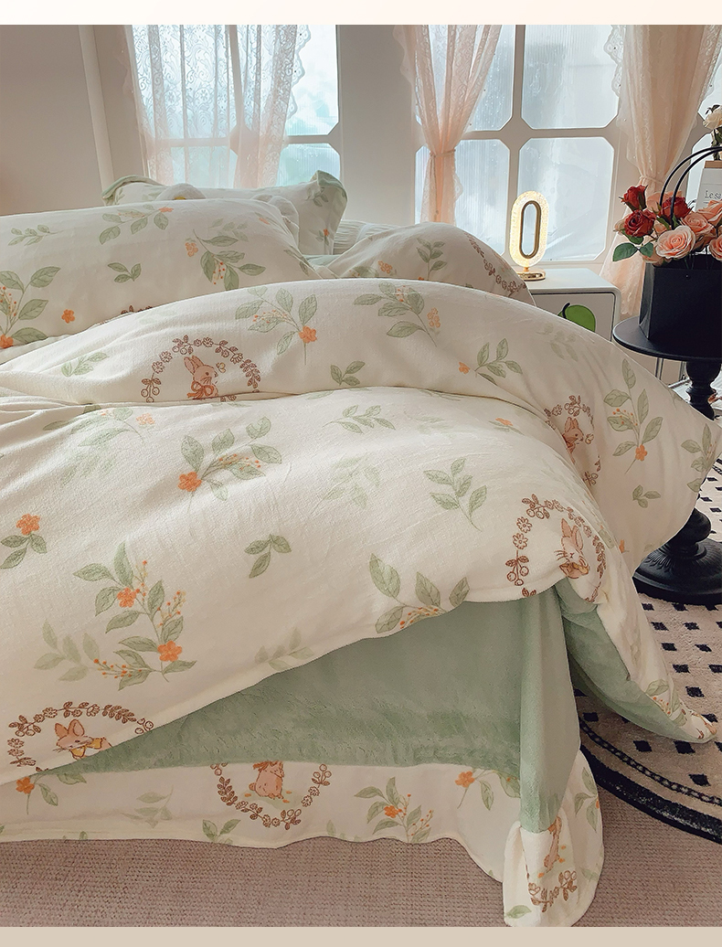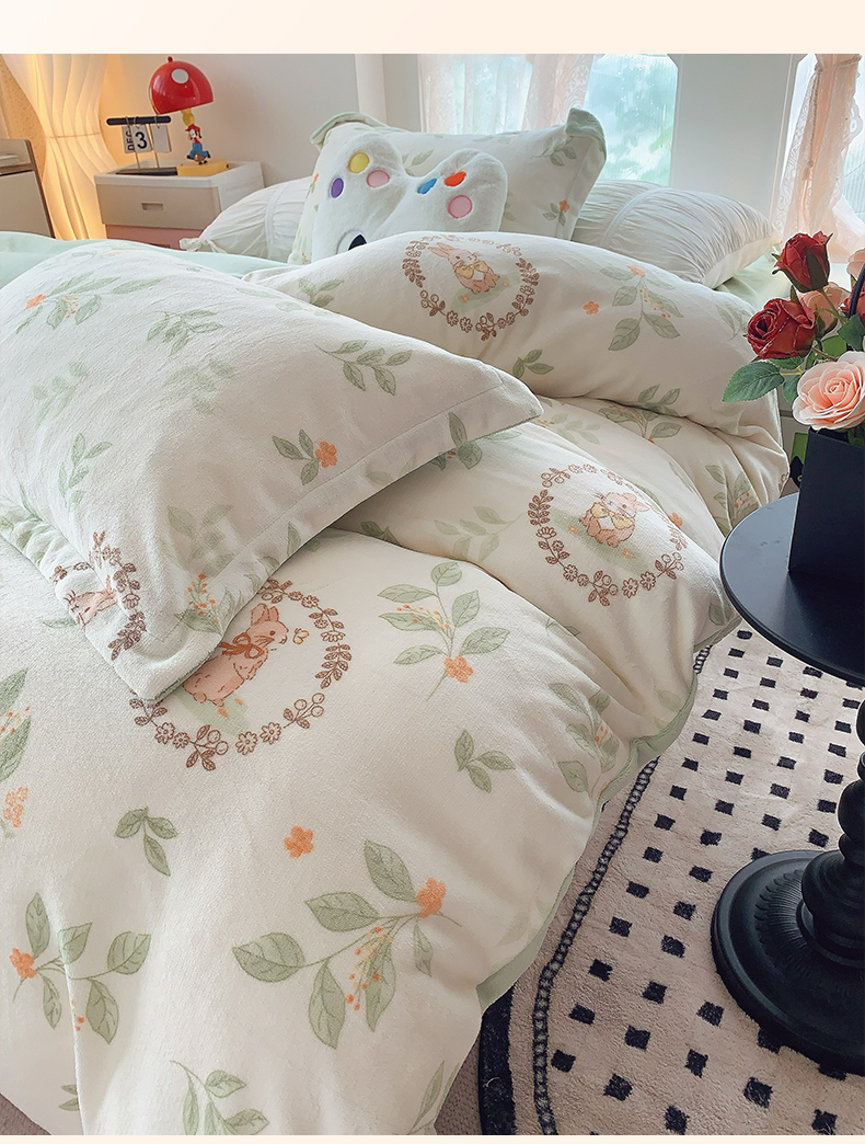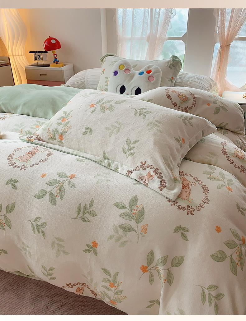 商品名称:奈萝家纺 2025新款加厚小清新印花牛奶绒三件套四件套 叶畔兔语