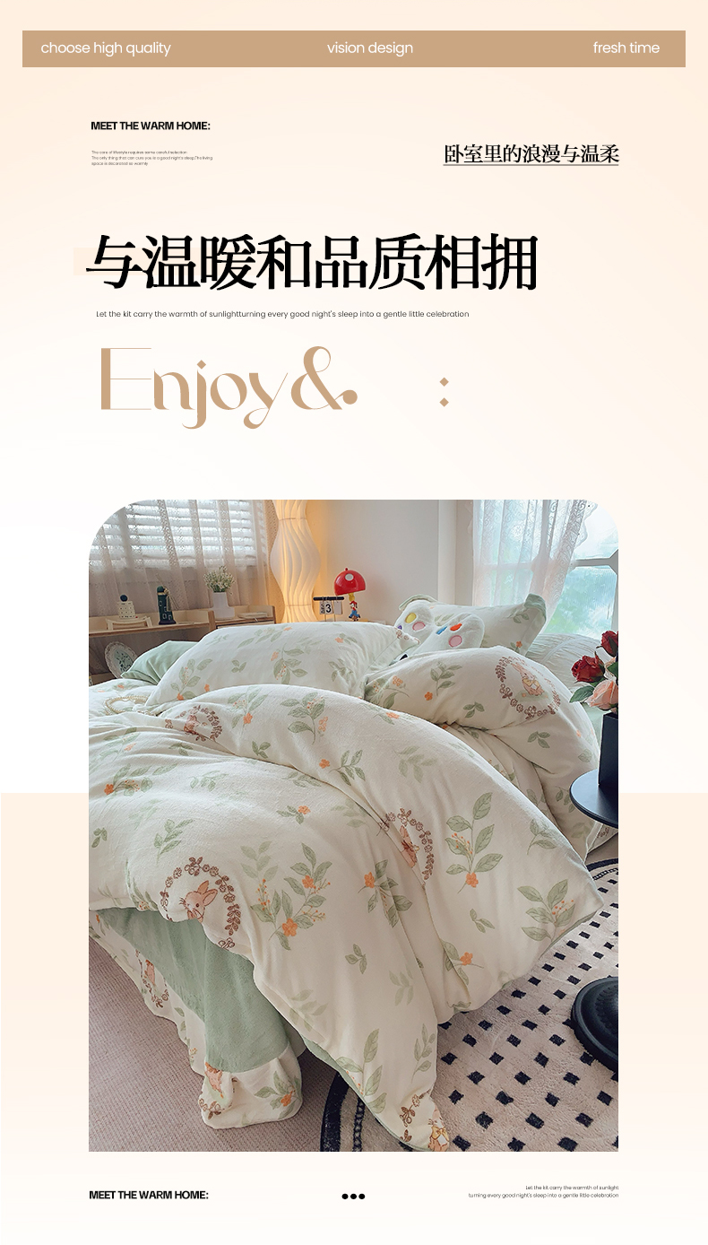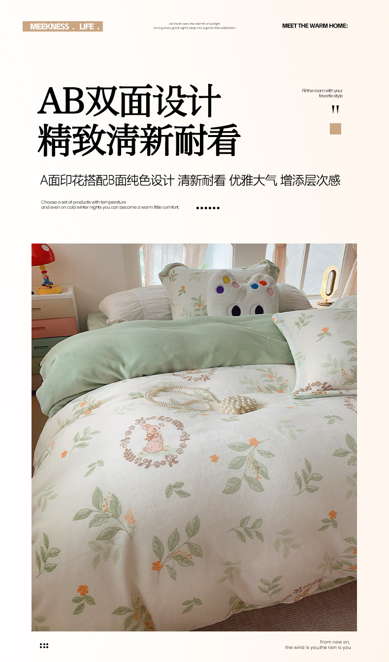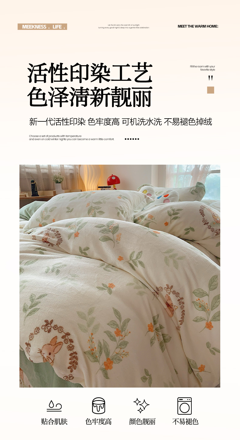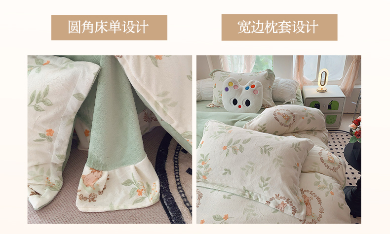 商品名称:奈萝家纺 2025新款加厚小清新印花牛奶绒三件套四件套 叶畔兔语