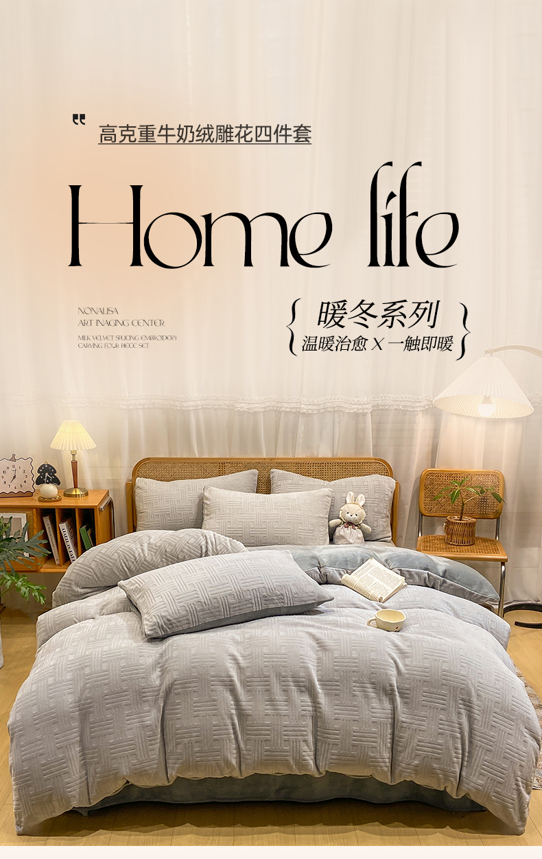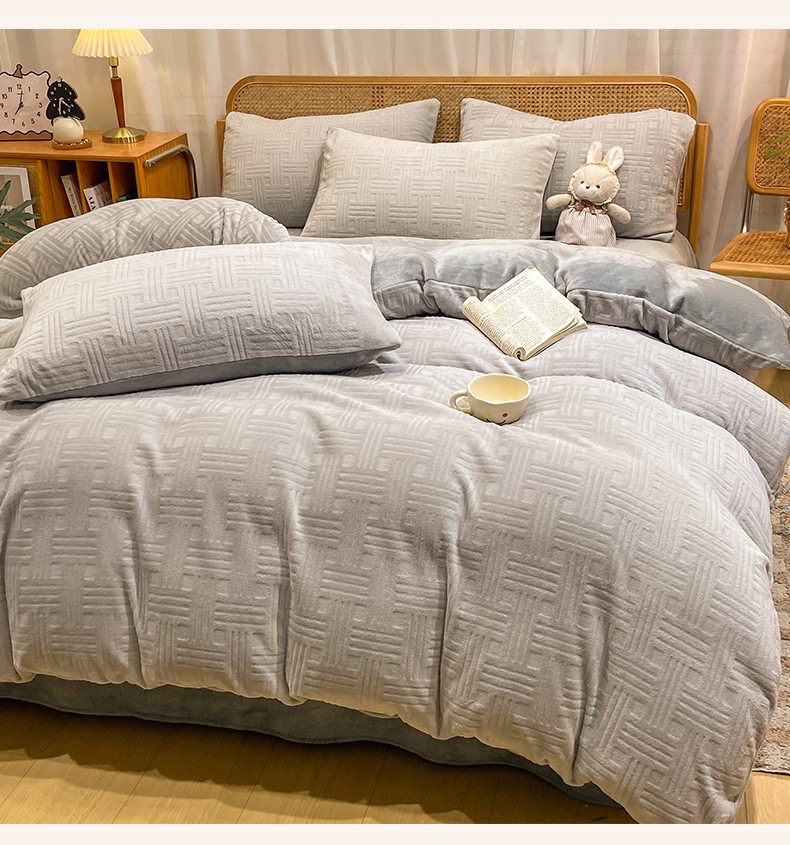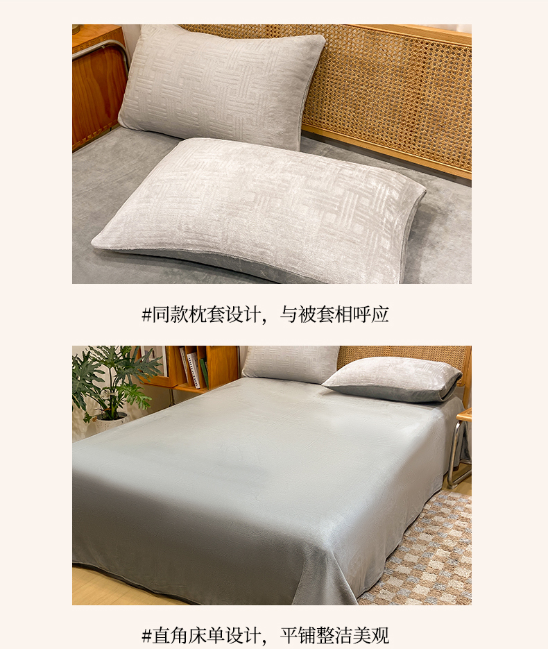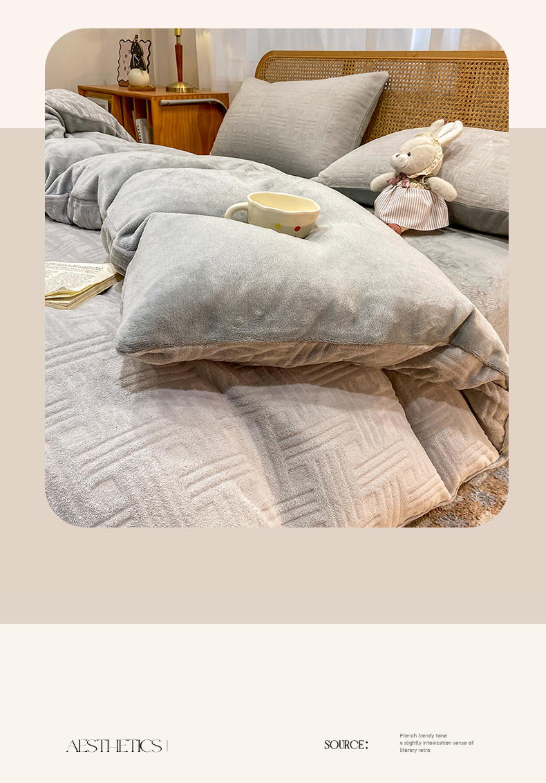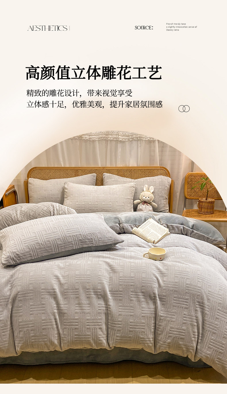 当前位置: 91家纺网 > 商品网购 > 床品套件 > 四件套 > 牛奶绒四件套 > 灰鲸 2025新款高克重牛奶绒雕花简约纯色四件套 糖果格-纳多灰+绅士灰