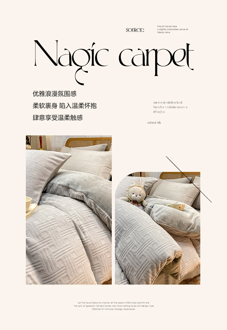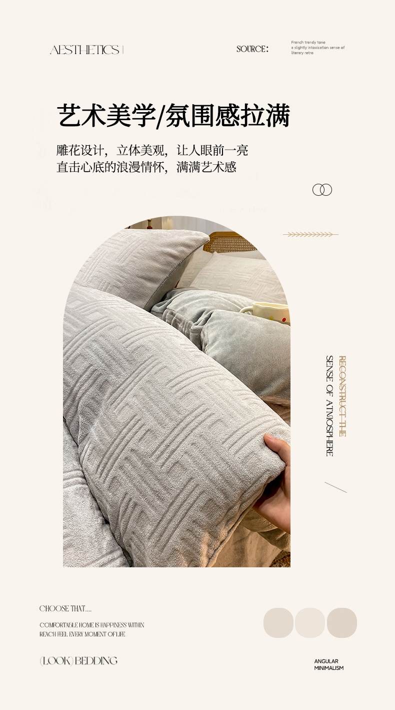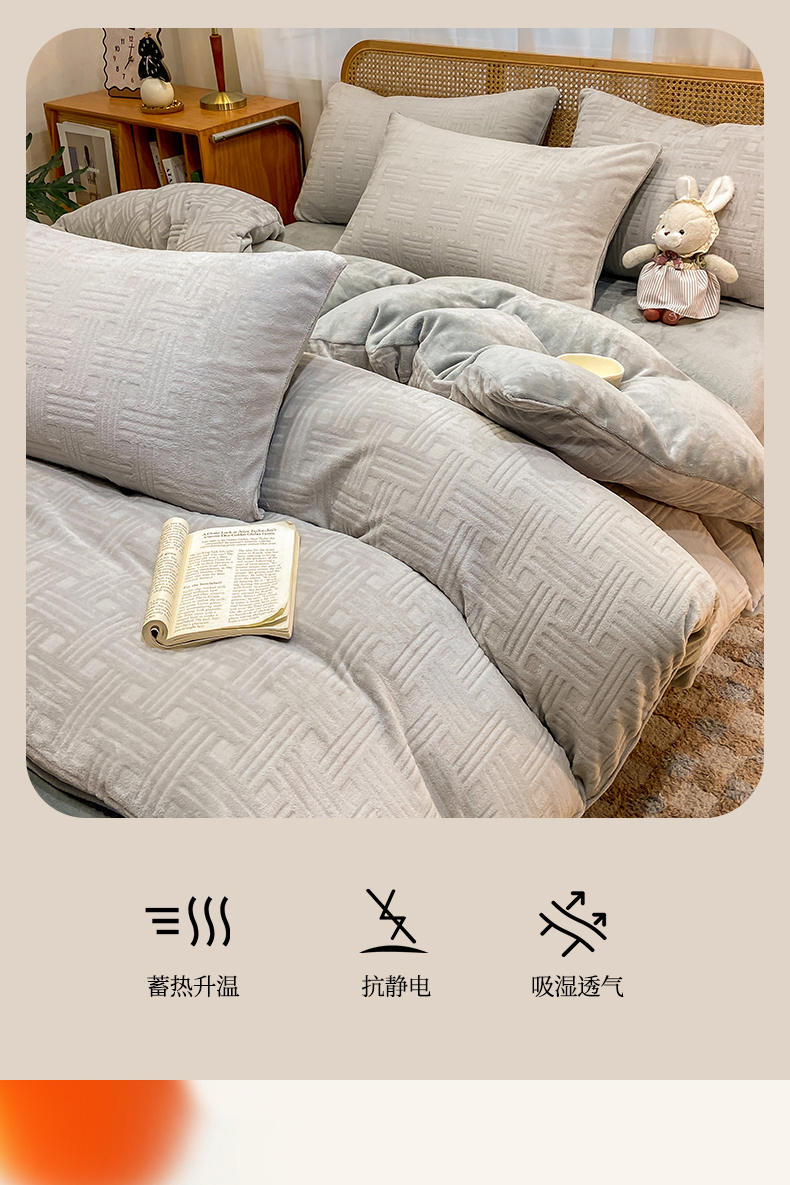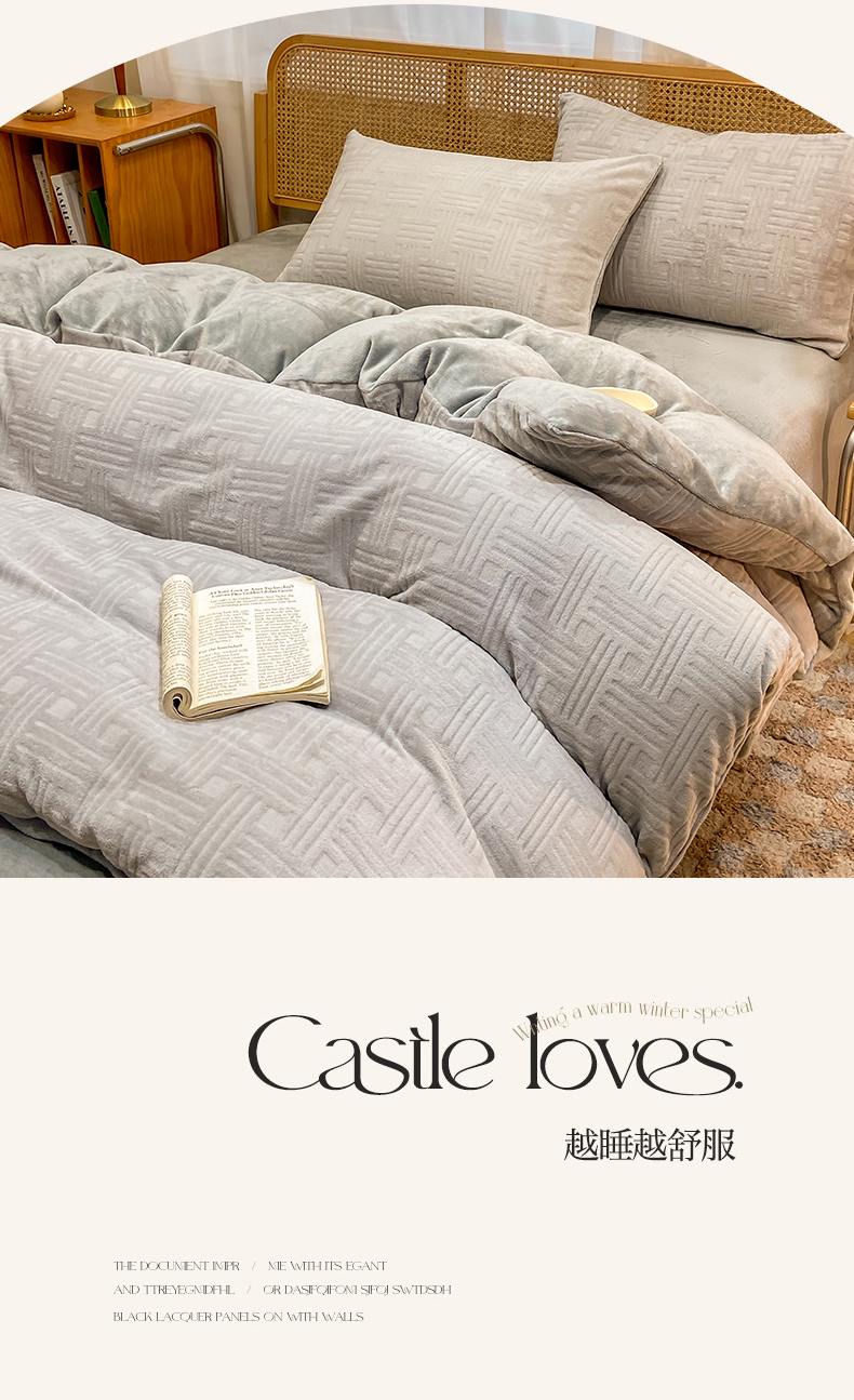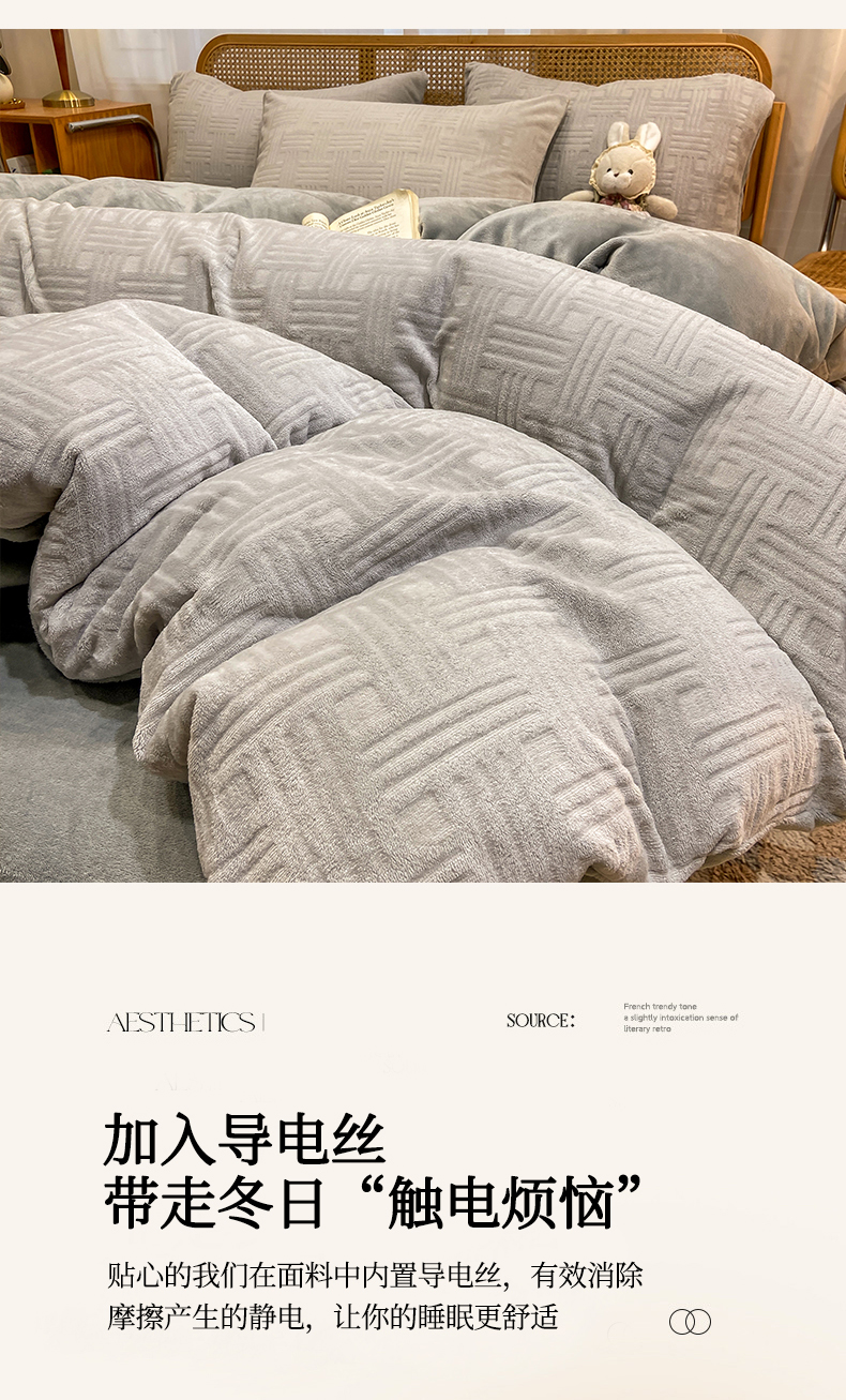 当前位置: 91家纺网 > 商品网购 > 床品套件 > 四件套 > 牛奶绒四件套 > 灰鲸 2025新款高克重牛奶绒雕花简约纯色四件套 糖果格-纳多灰+绅士灰