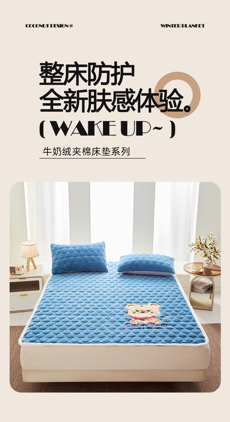 • 91家纺网 家纺一手货源 找家纺 初心家纺 2025新款卡通绣花牛奶绒夹棉床垫 可爱熊-天蓝