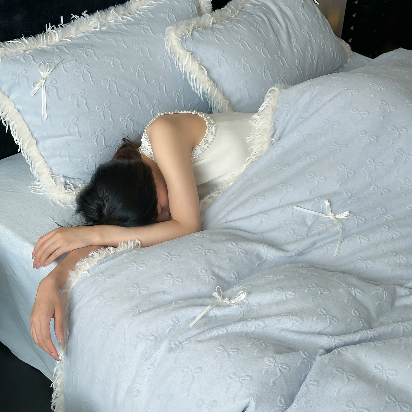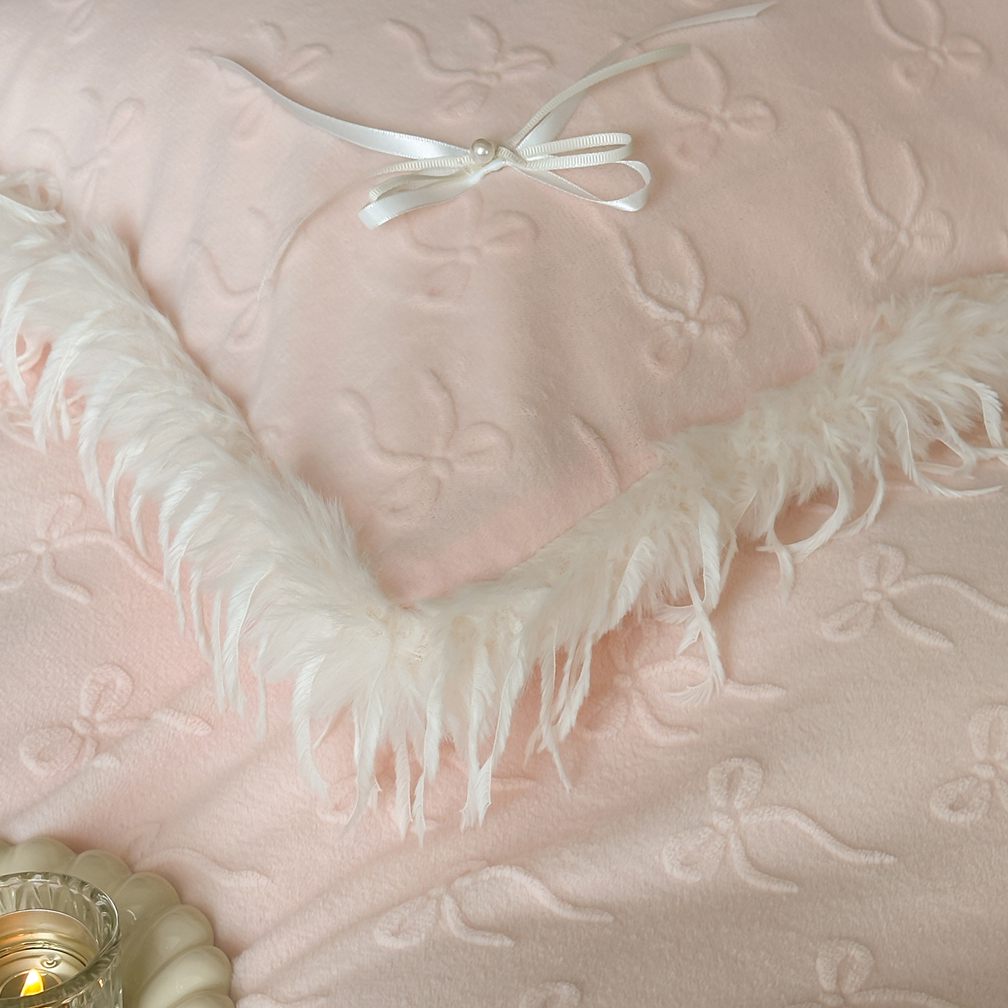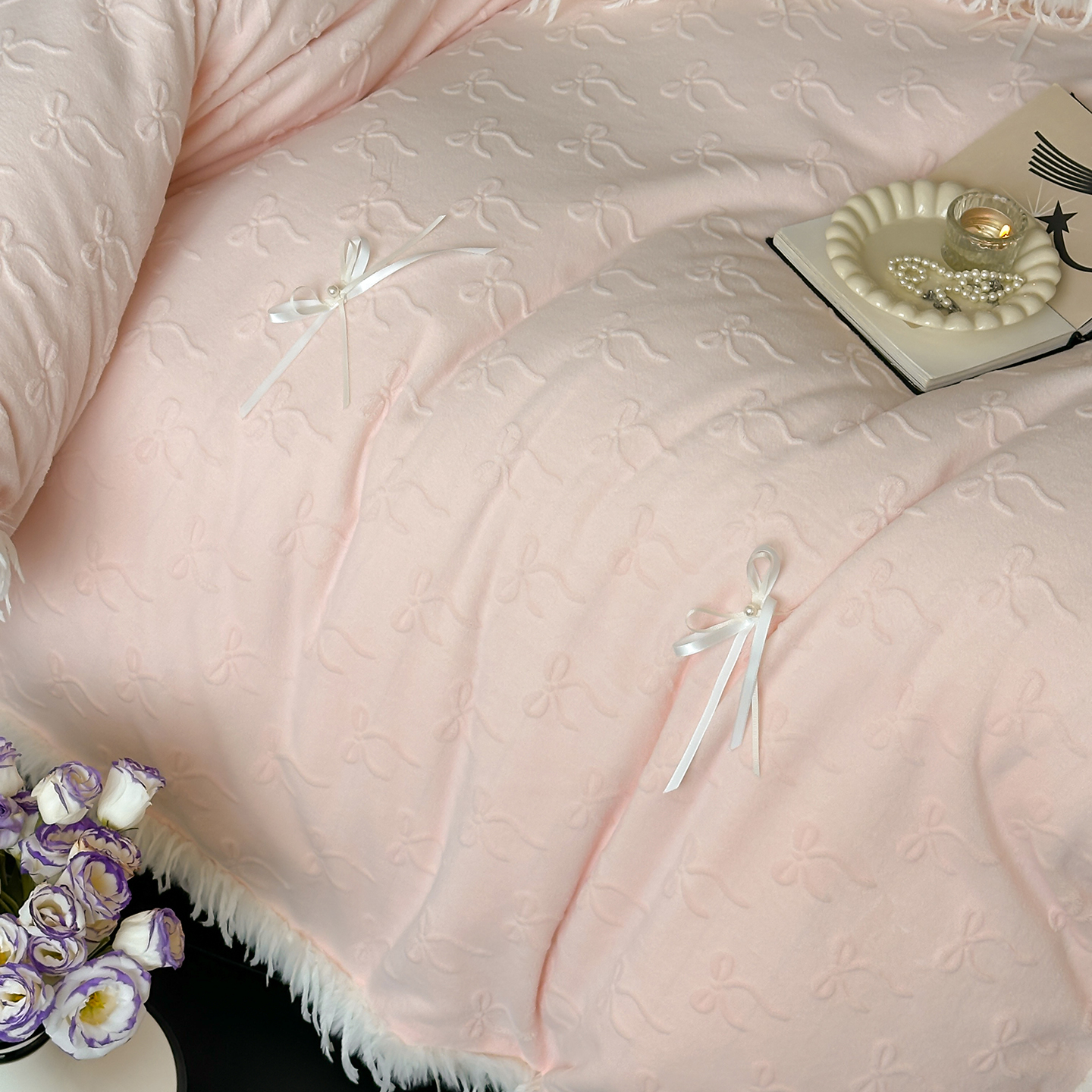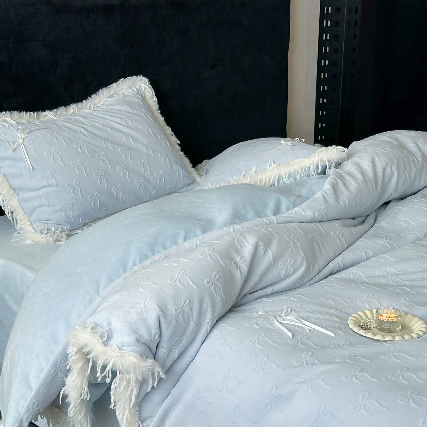 (总)佳汐蓝家纺 2025秋冬新款230g牛奶绒雕花+立体蝴蝶结+韩式羽毛花边四件套--维密