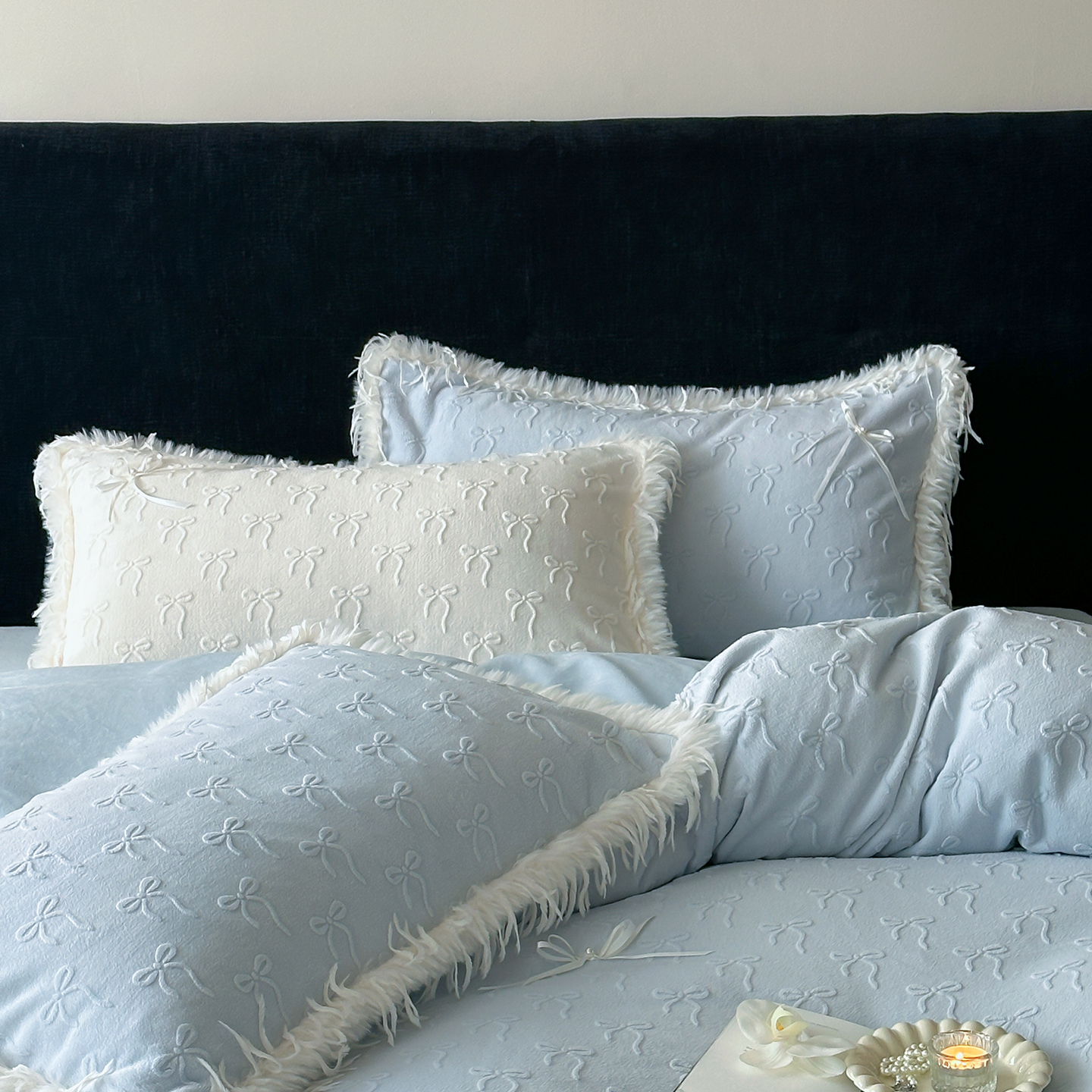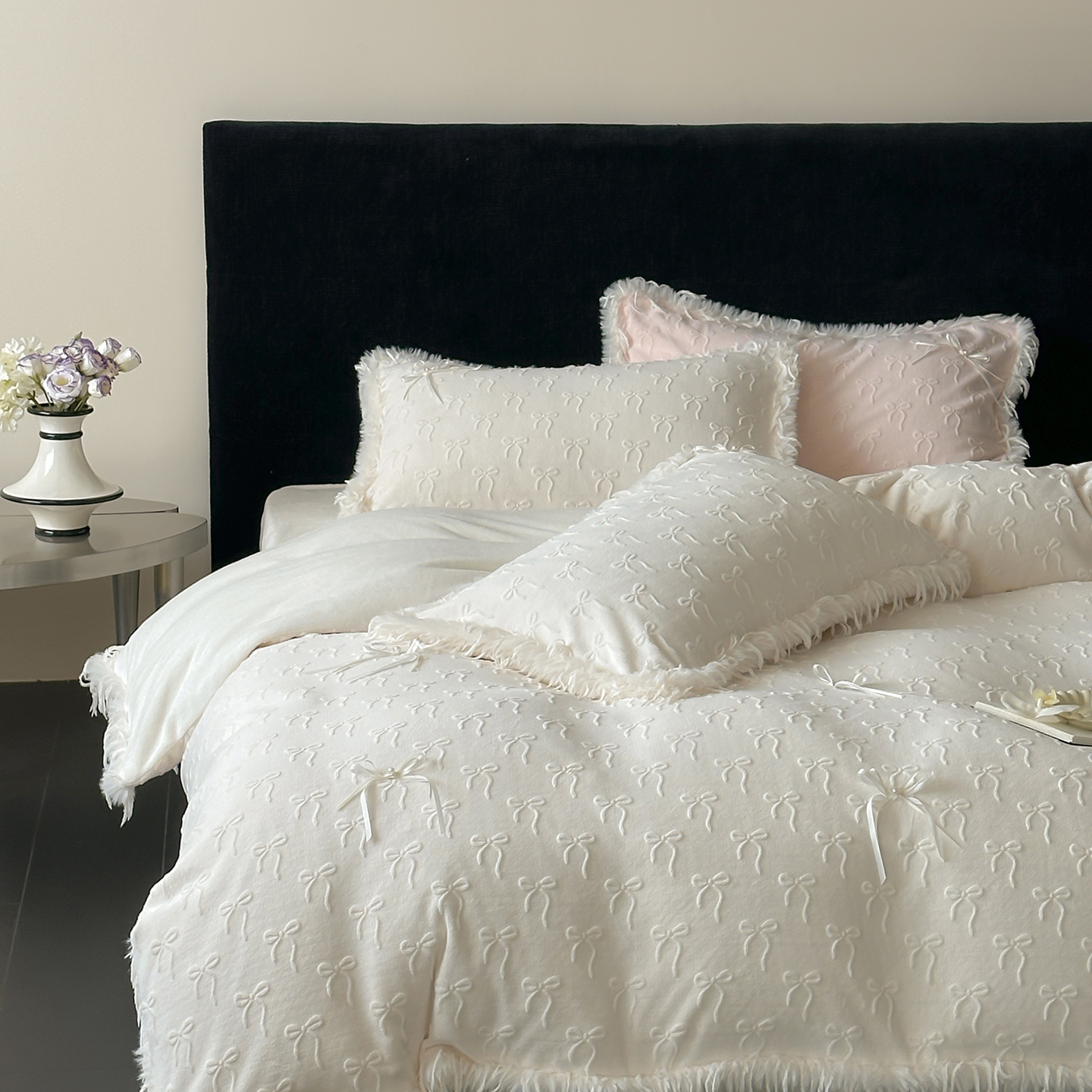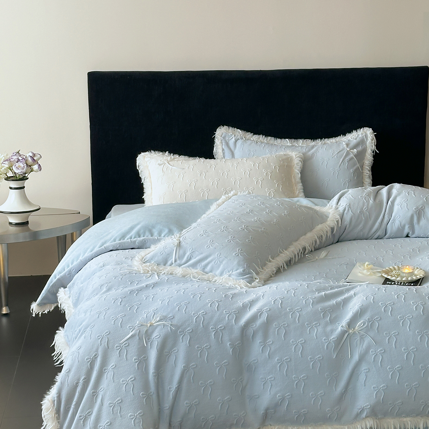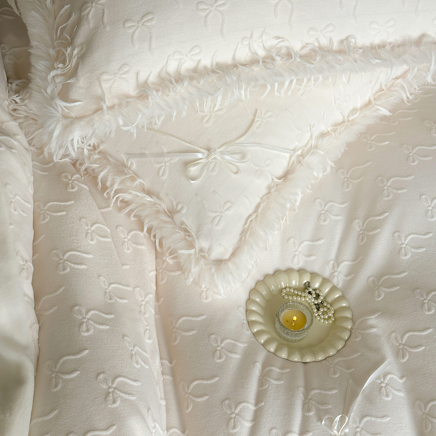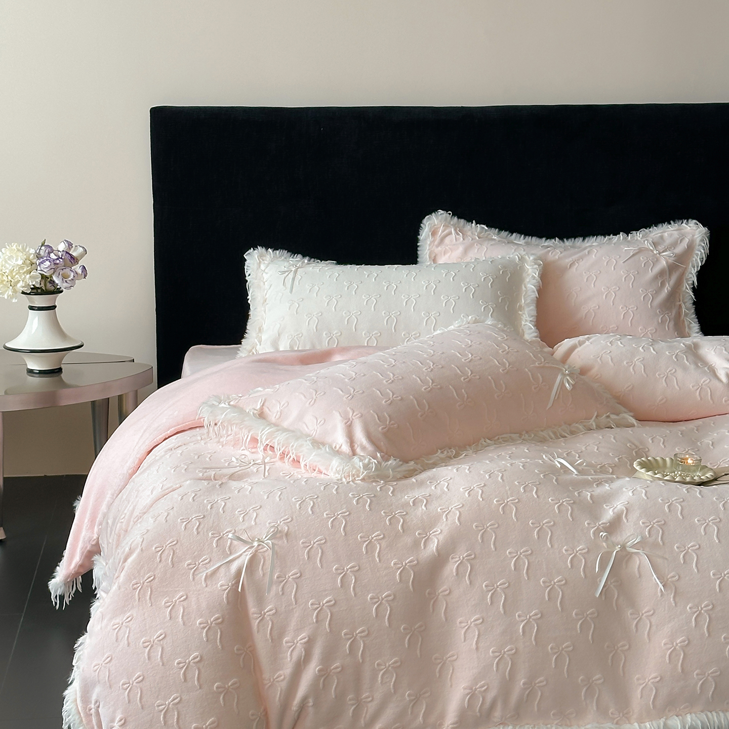 (总)佳汐蓝家纺 2025秋冬新款230g牛奶绒雕花+立体蝴蝶结+韩式羽毛花边四件套--维密