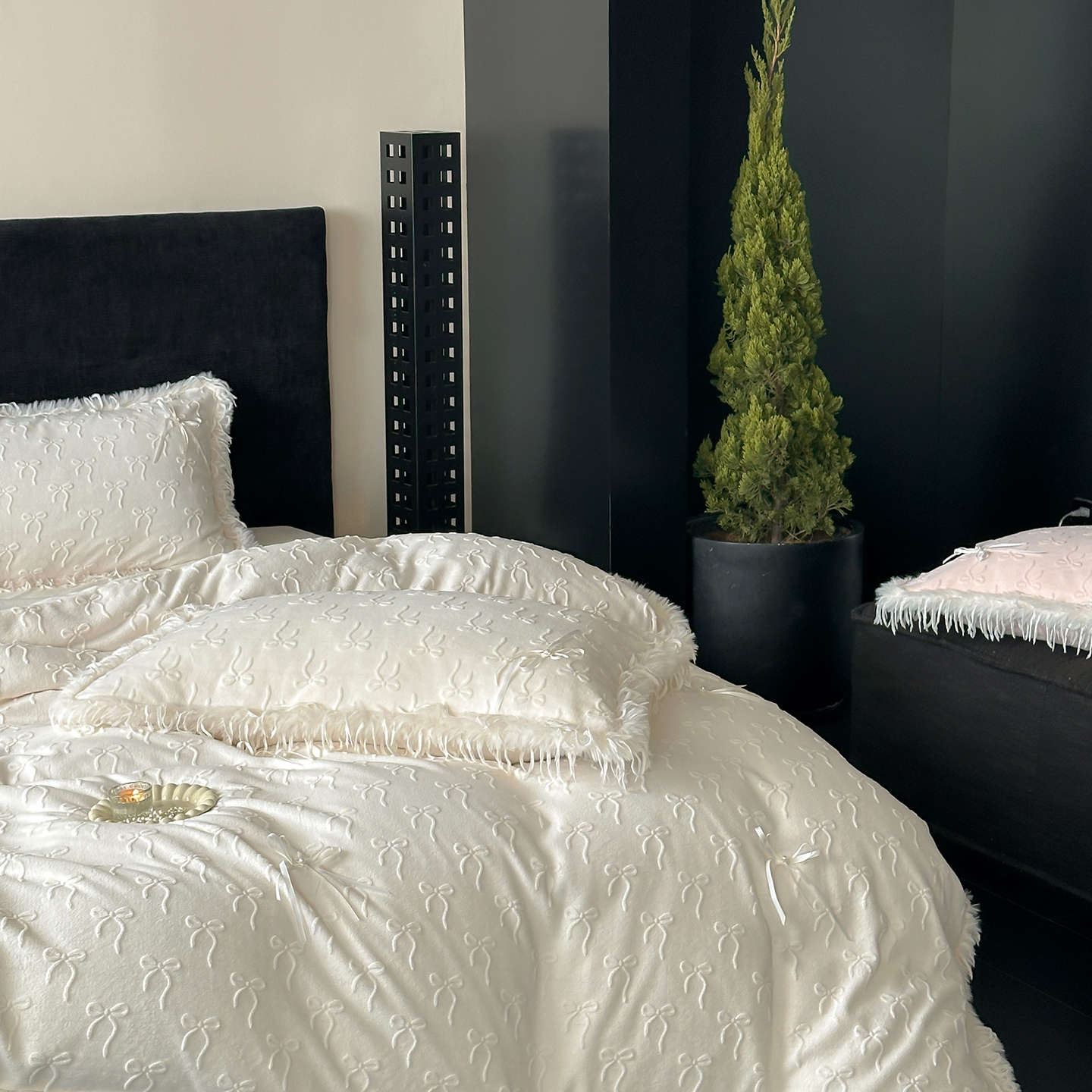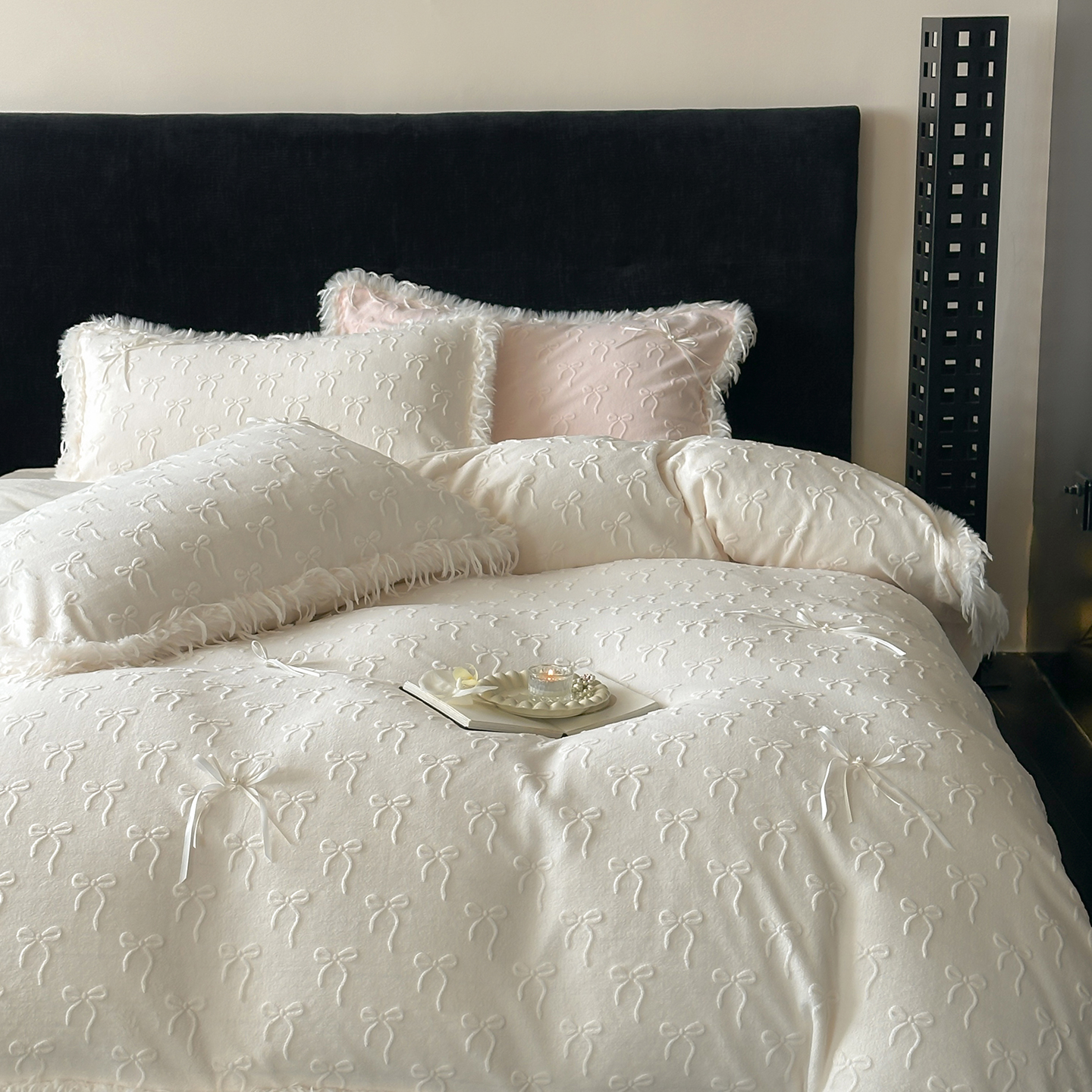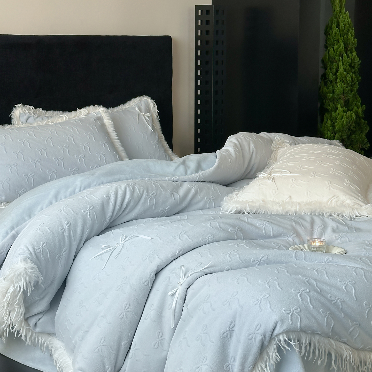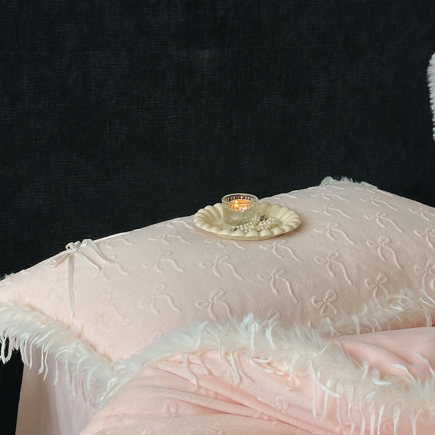 (总)佳汐蓝家纺 2025秋冬新款230g牛奶绒雕花+立体蝴蝶结+韩式羽毛花边四件套--维密