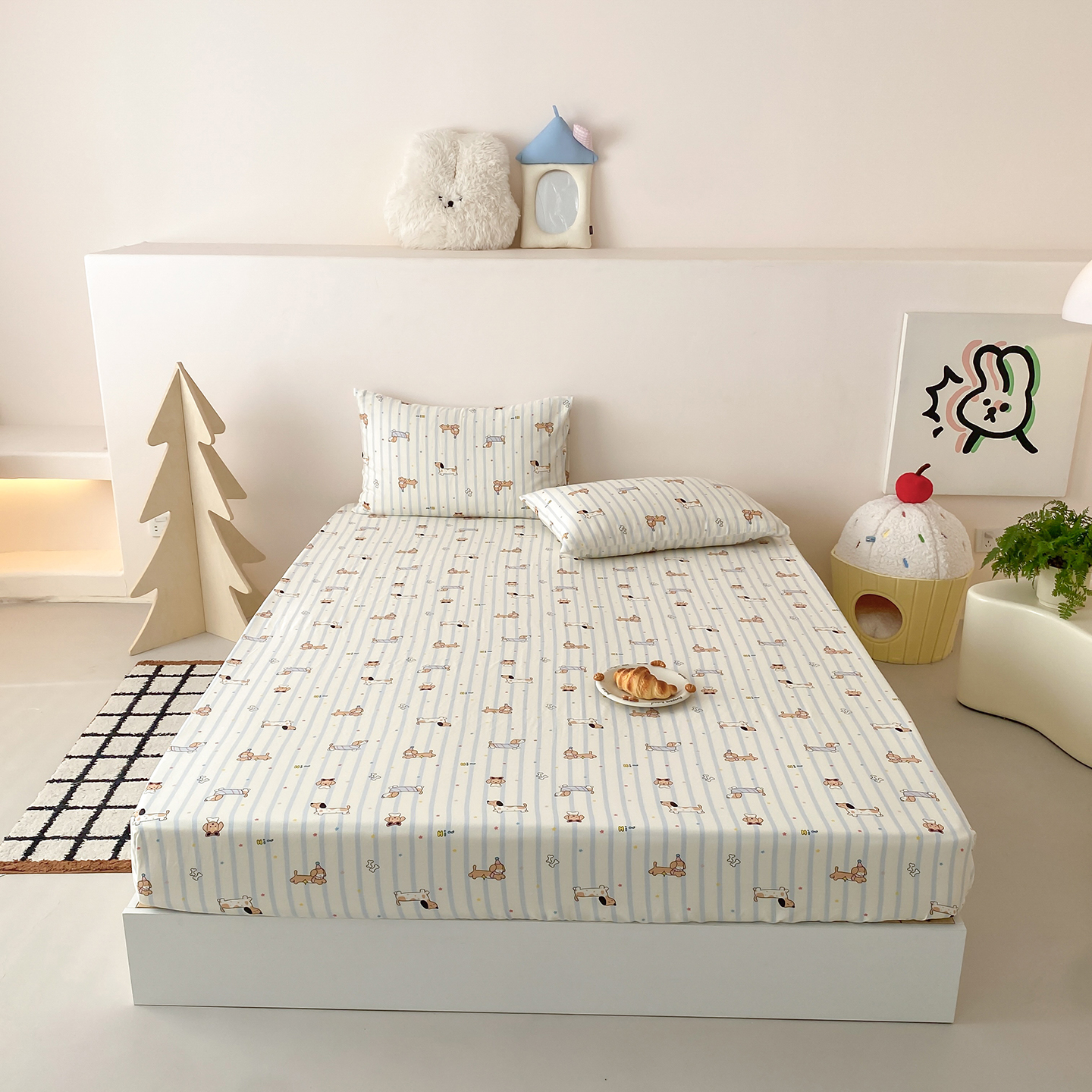 8小时家纺 2025新款40s天然肌理双层纱单品床笠 快乐小狗