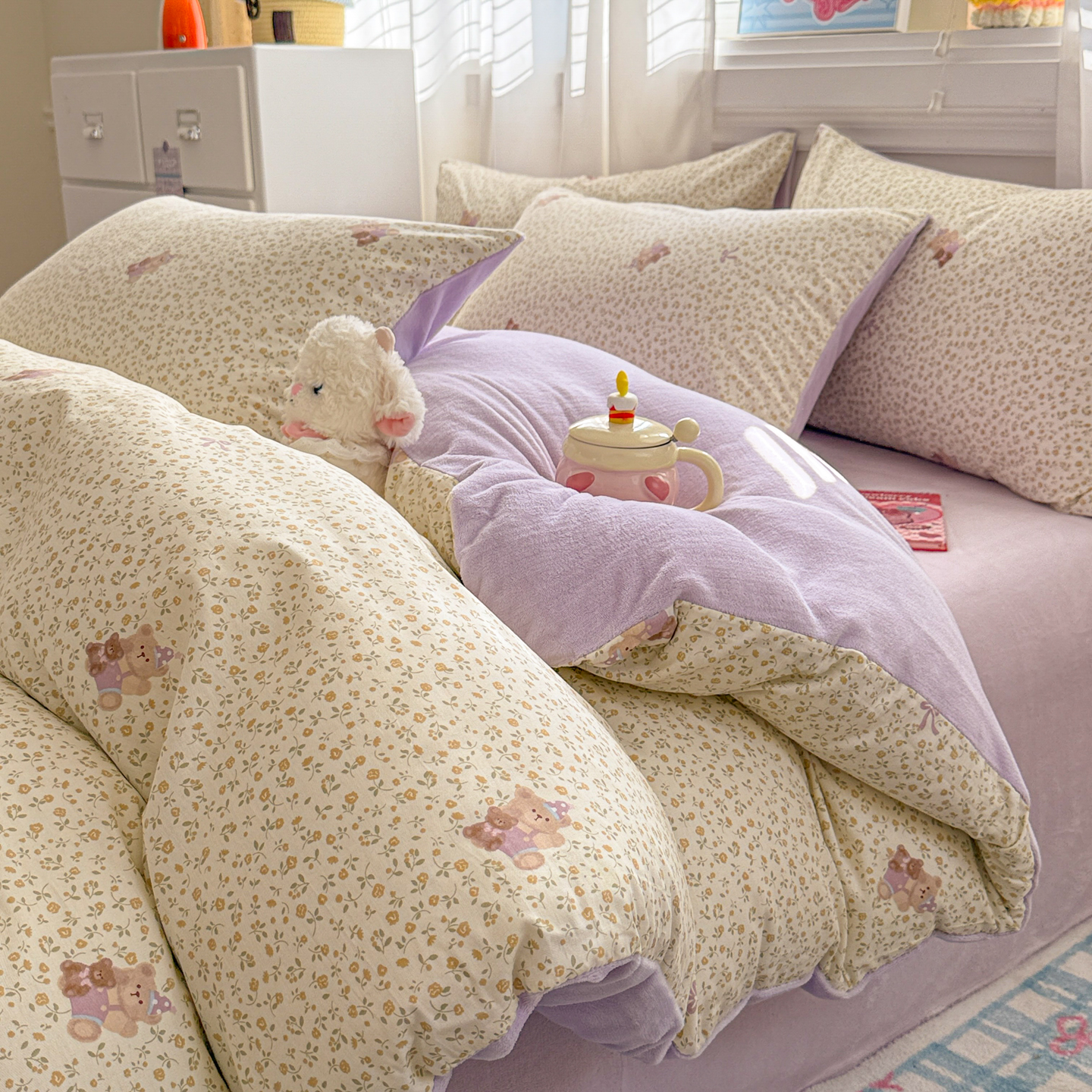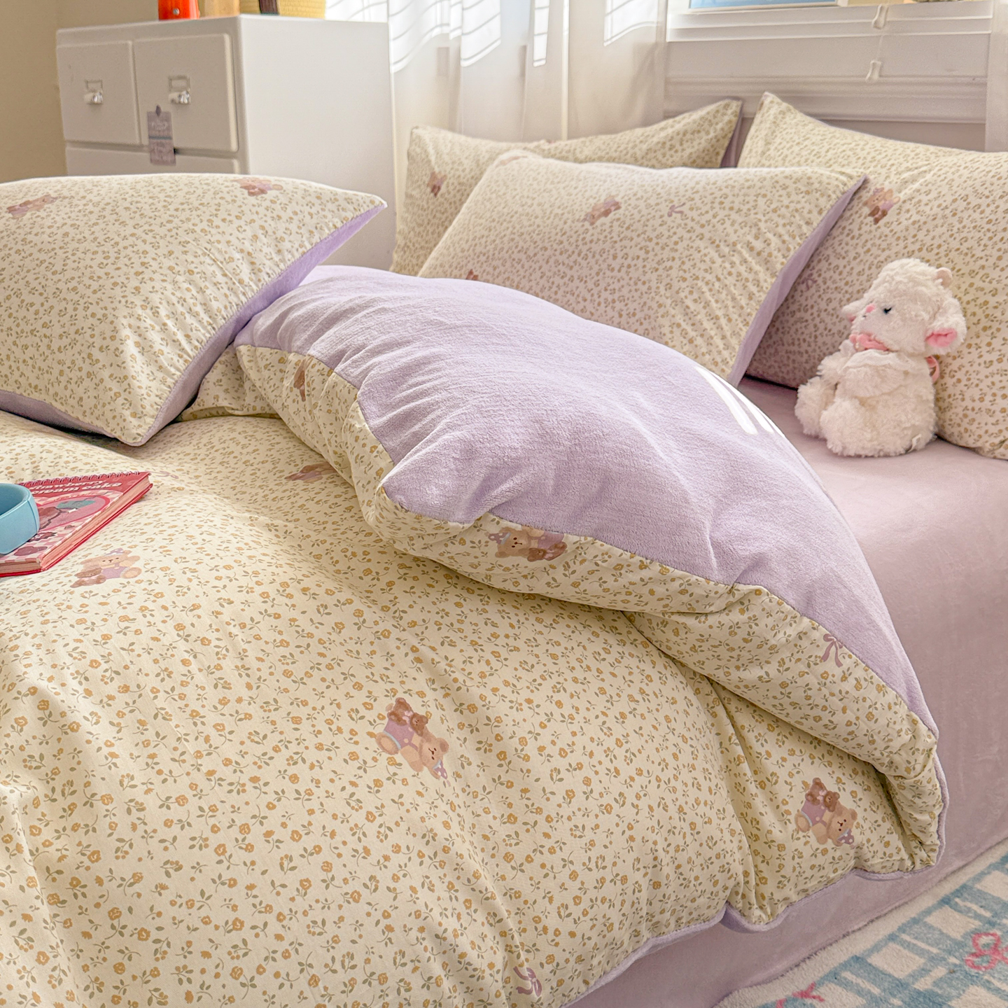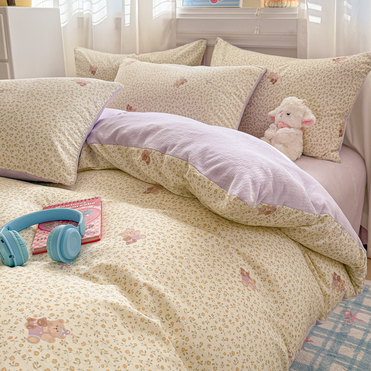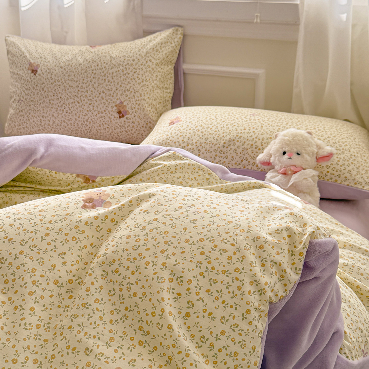 呗旺鹿 2025新款卡通棉+绒牛奶绒棉绒四件套 闹钟麦田