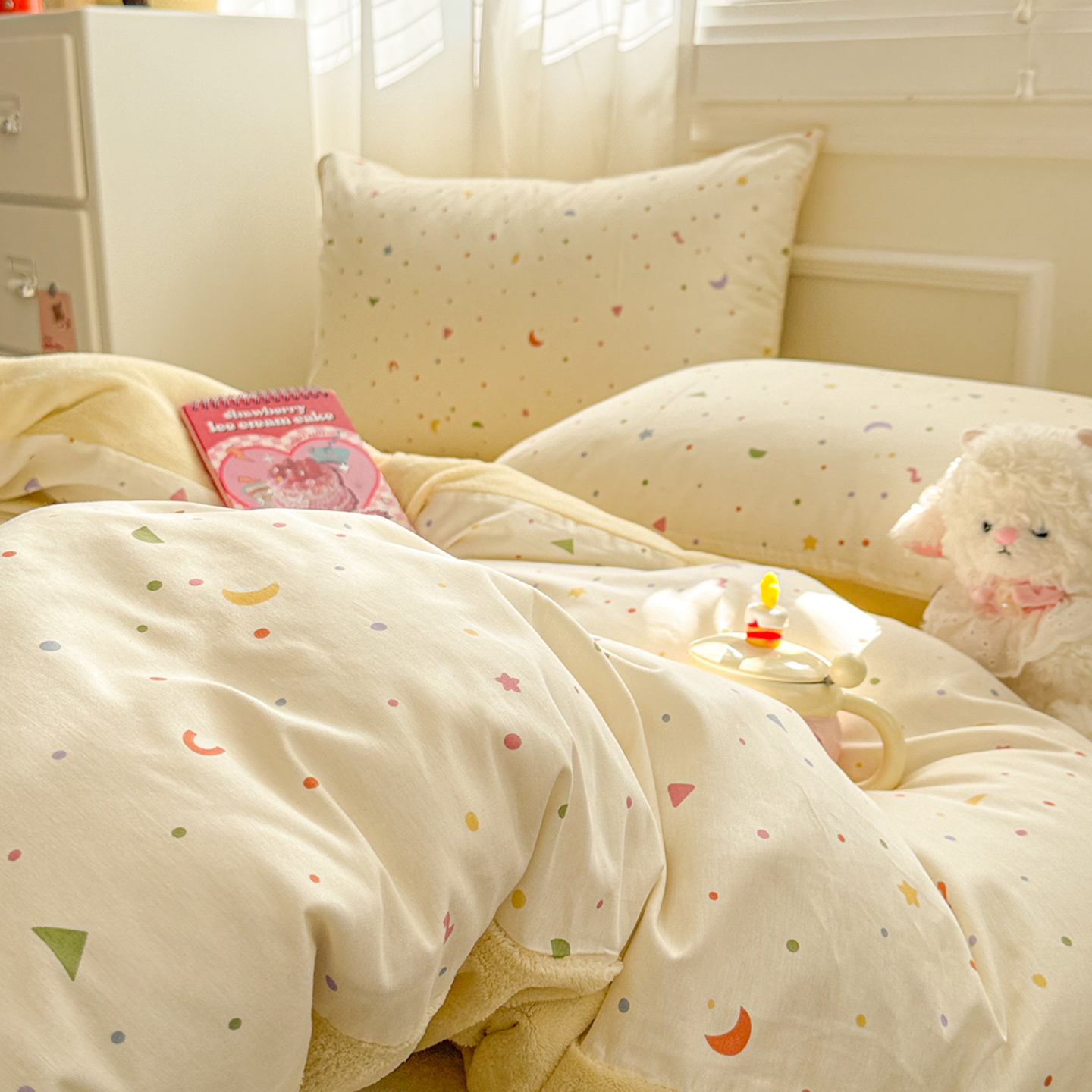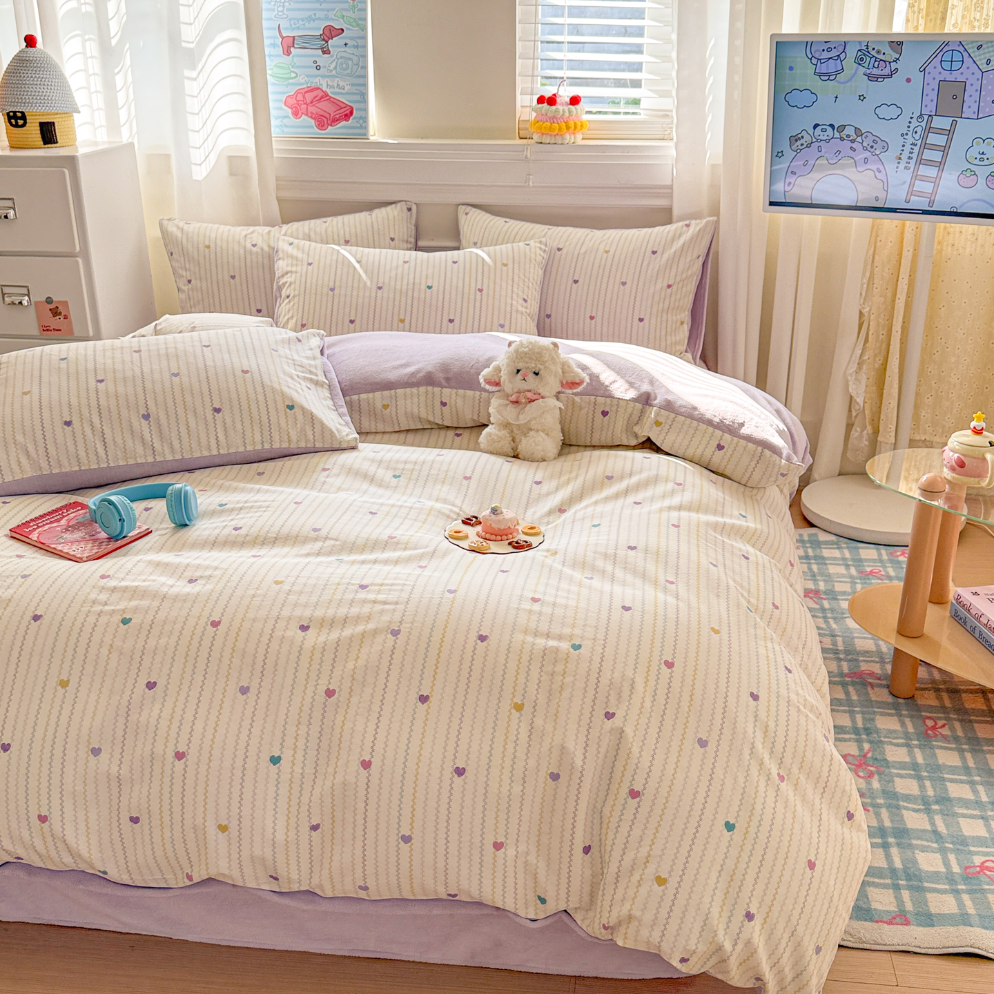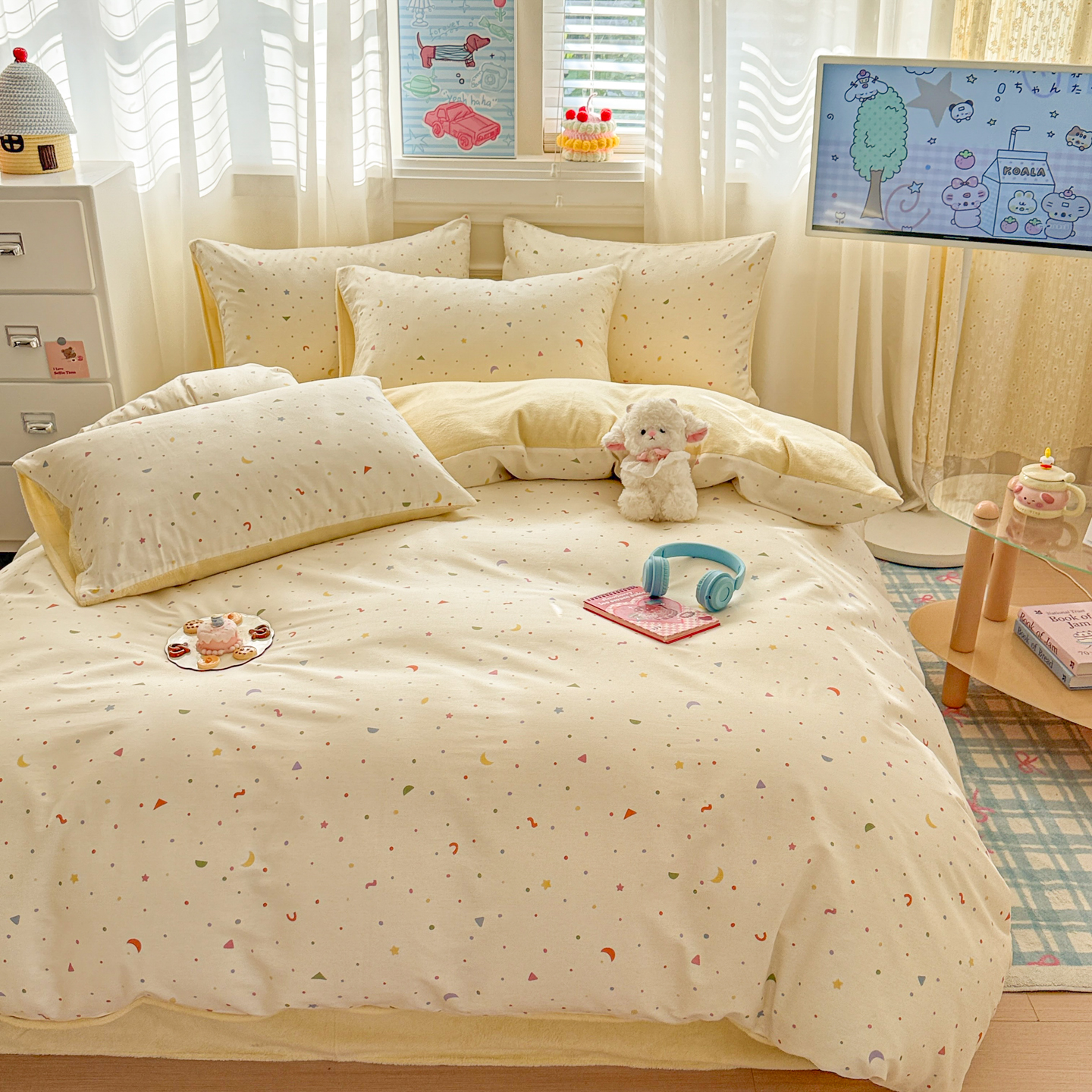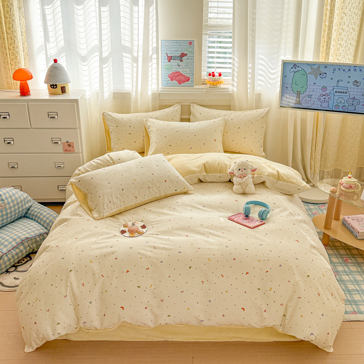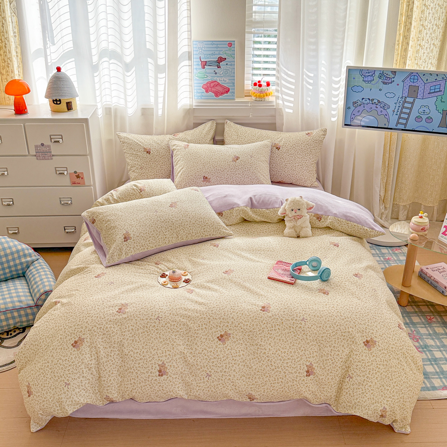 (总)呗旺鹿 2026新款全棉纯棉40支13070卡通印花四件套-场景二,萌星,鼻涕狗,果子象,机灵猫,可爱星人,幸福小熊