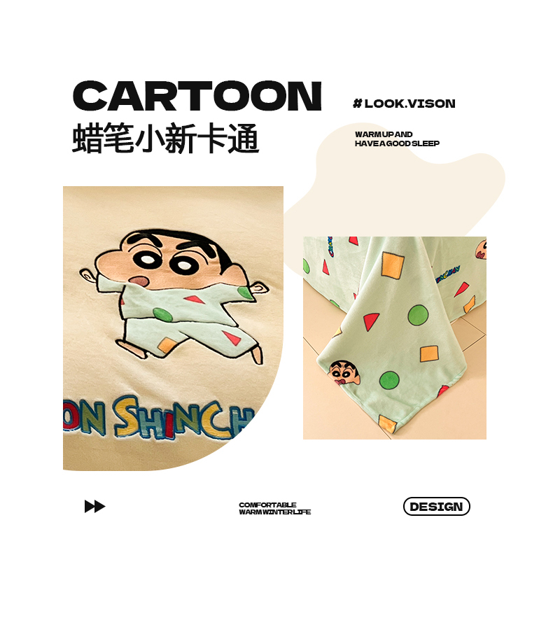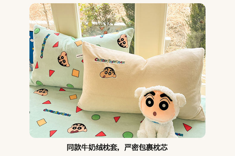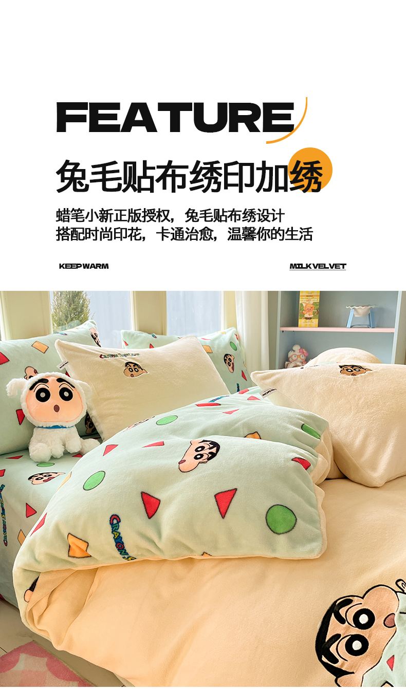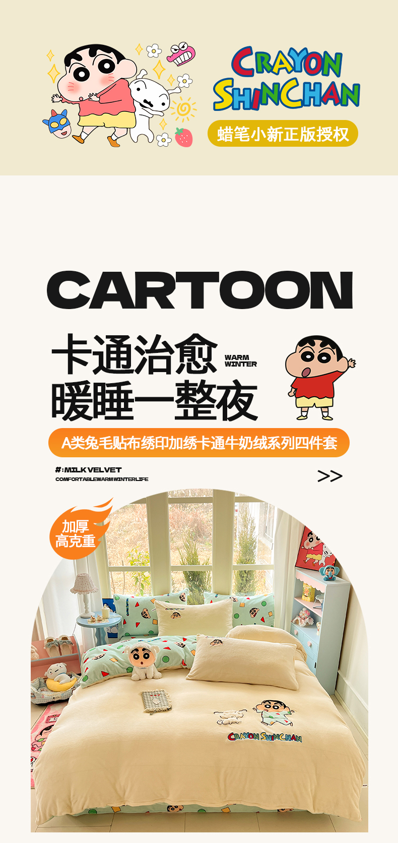 商品名称:(总)桃子家居 2026新款A类蜡笔小新授权兔毛贴布绣毛巾绣印加绣卡通加厚牛奶绒系列四件套