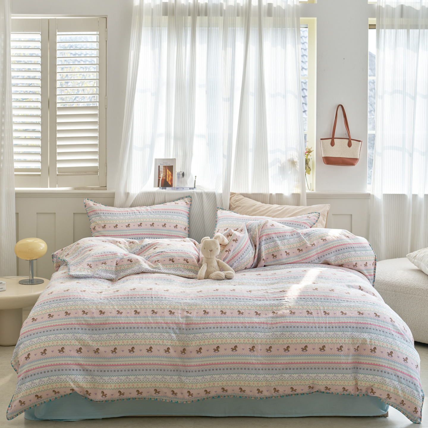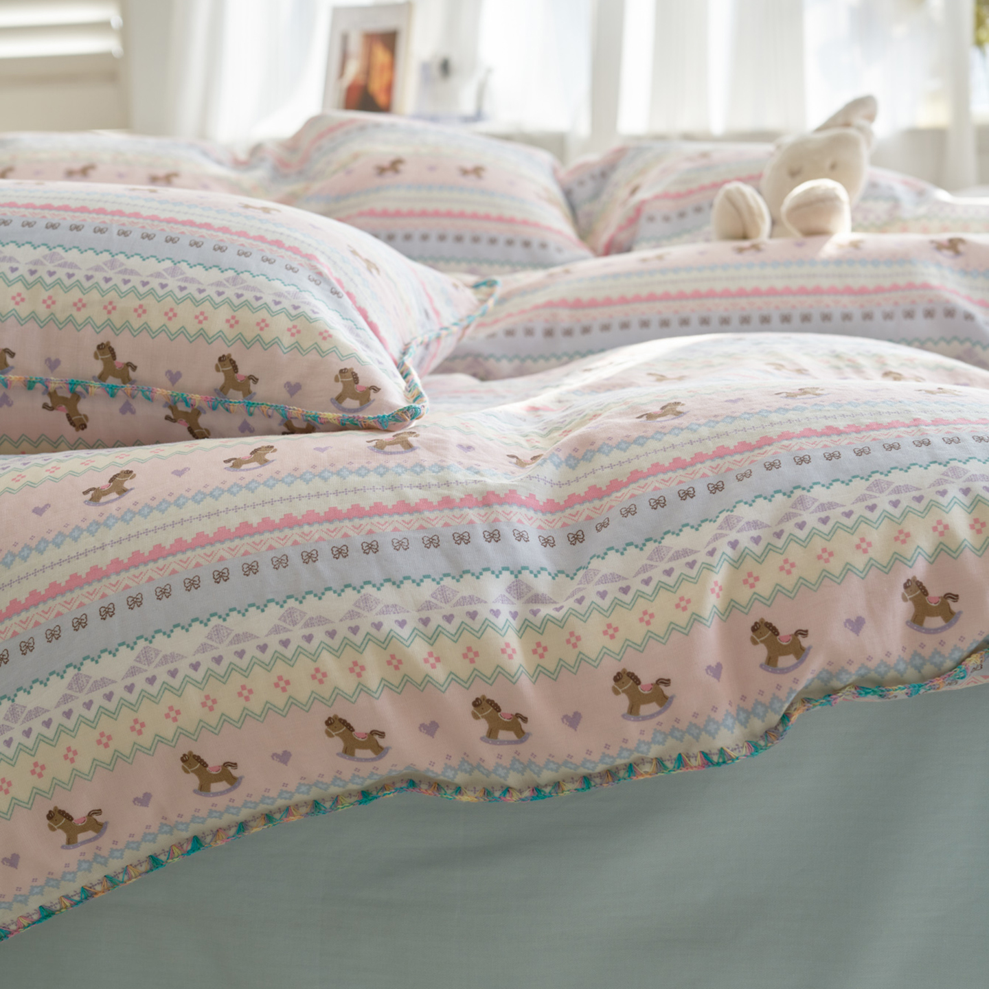 (总)洋铭区(原狠狠爱) 2026新款春季全棉彩边双层纱四件套,爱心宝莉,波斯小懒狗,繁花兔兔,格格小熊,海蓝小木马,红格小马,红枣小兔,花朵兔兔,焦糖小熊,兰花香,绿芽小马,萌宠小分队,奶茶蝴蝶结,奶糕熊熊,汽车派对,桃桃粉花,甜果小象,图图小狮子,幸运小可爱,熊猫嘟嘟,遇见粉花,月光宝宝