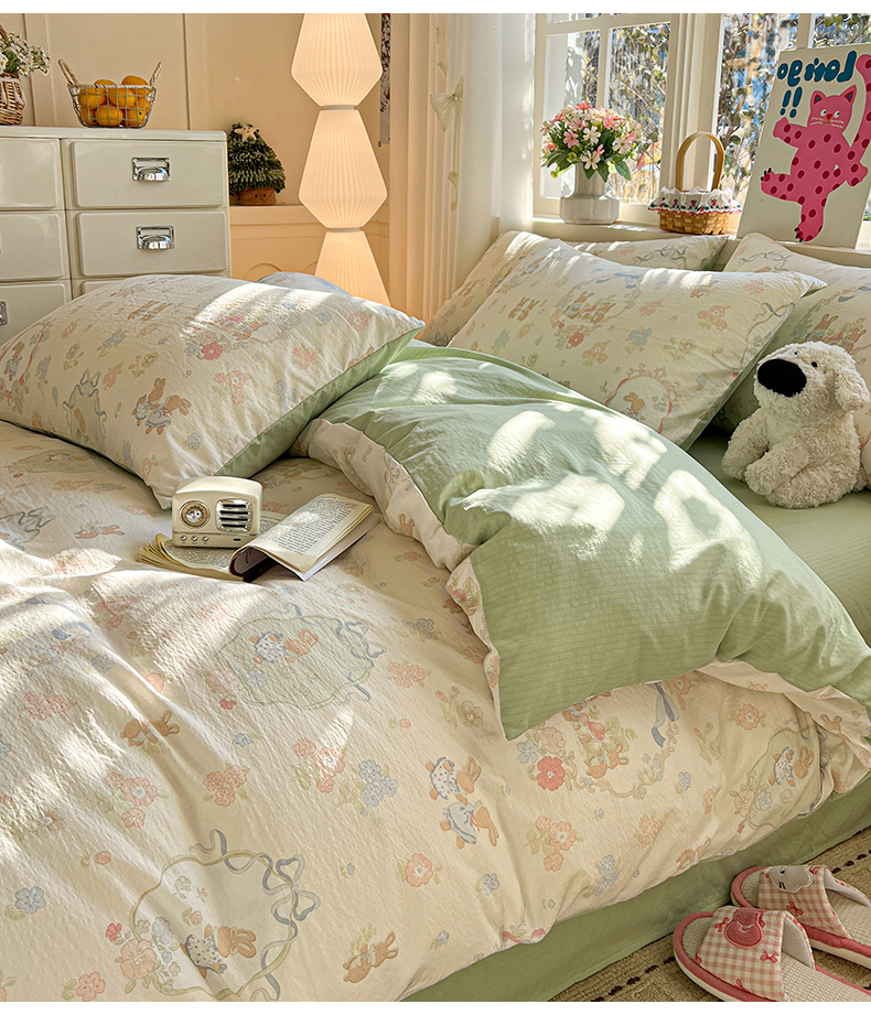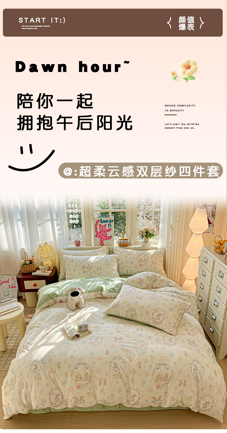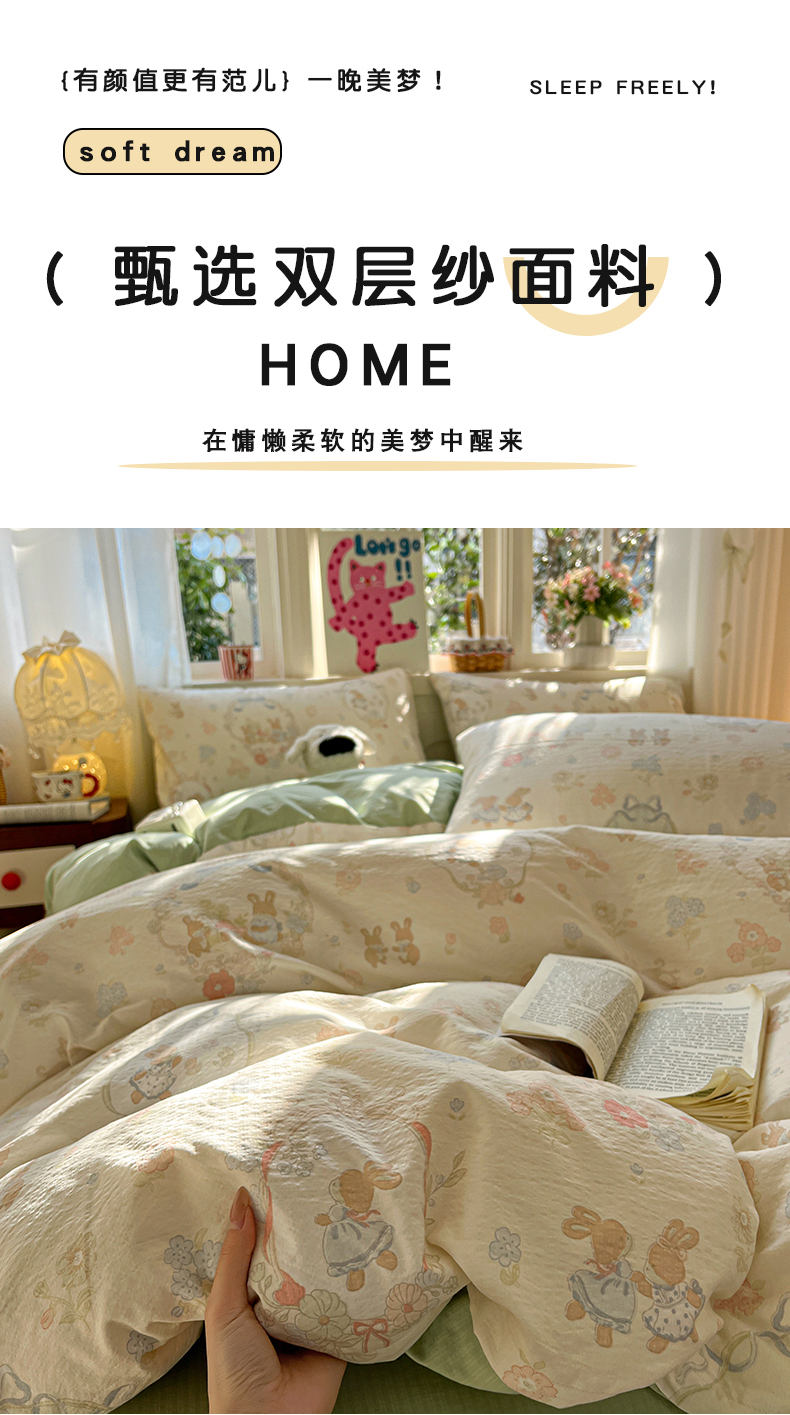 当前位置: 91家纺网 > 商品网购 > 床品套件 > 四件套 > 双层纱四件套 > 水木坊 2026春夏新款云感双层纱可爱系列四件套 梦境小兔