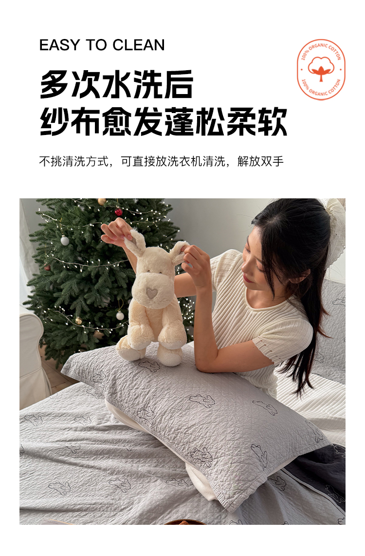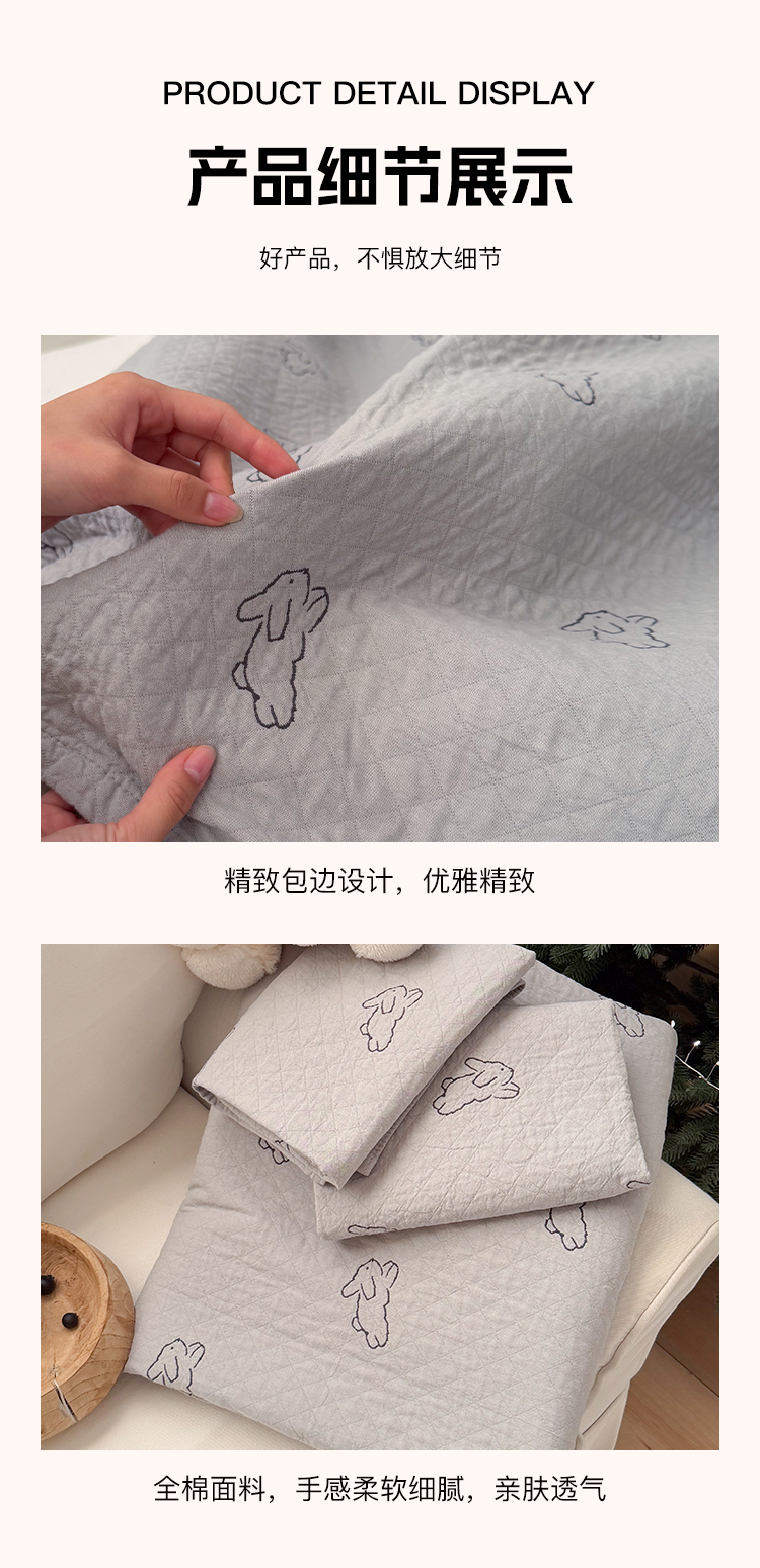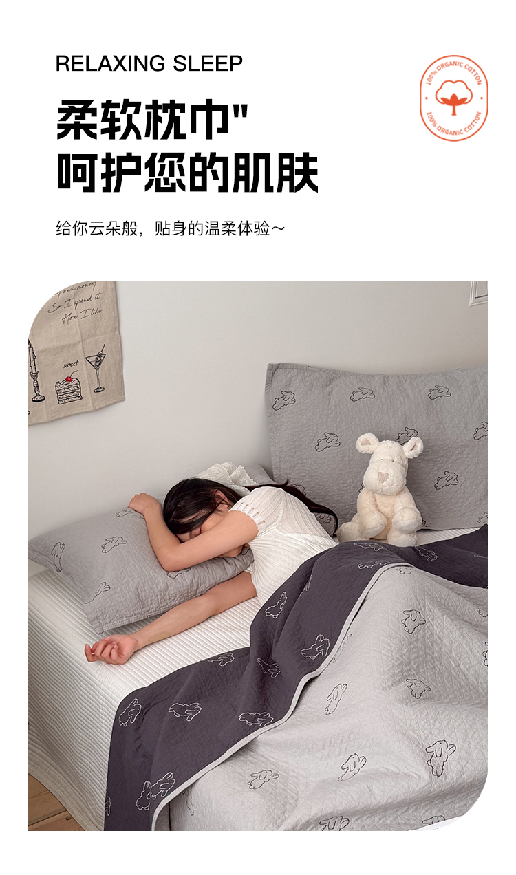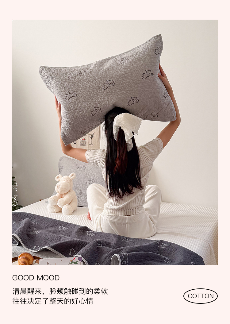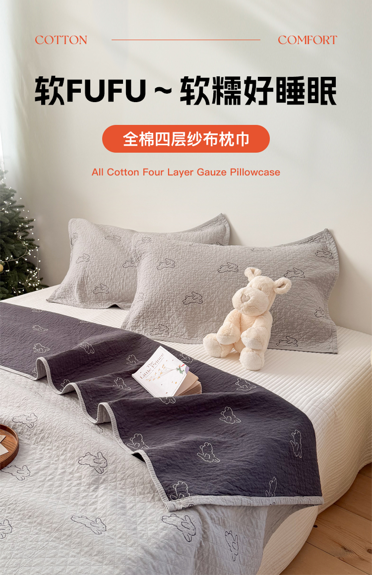 商品名称:沐瑟家纺 2026新款纯棉四层纱布枕巾-叮叮狗和浅跳兔 浅跳兔-灰色