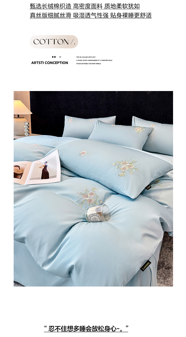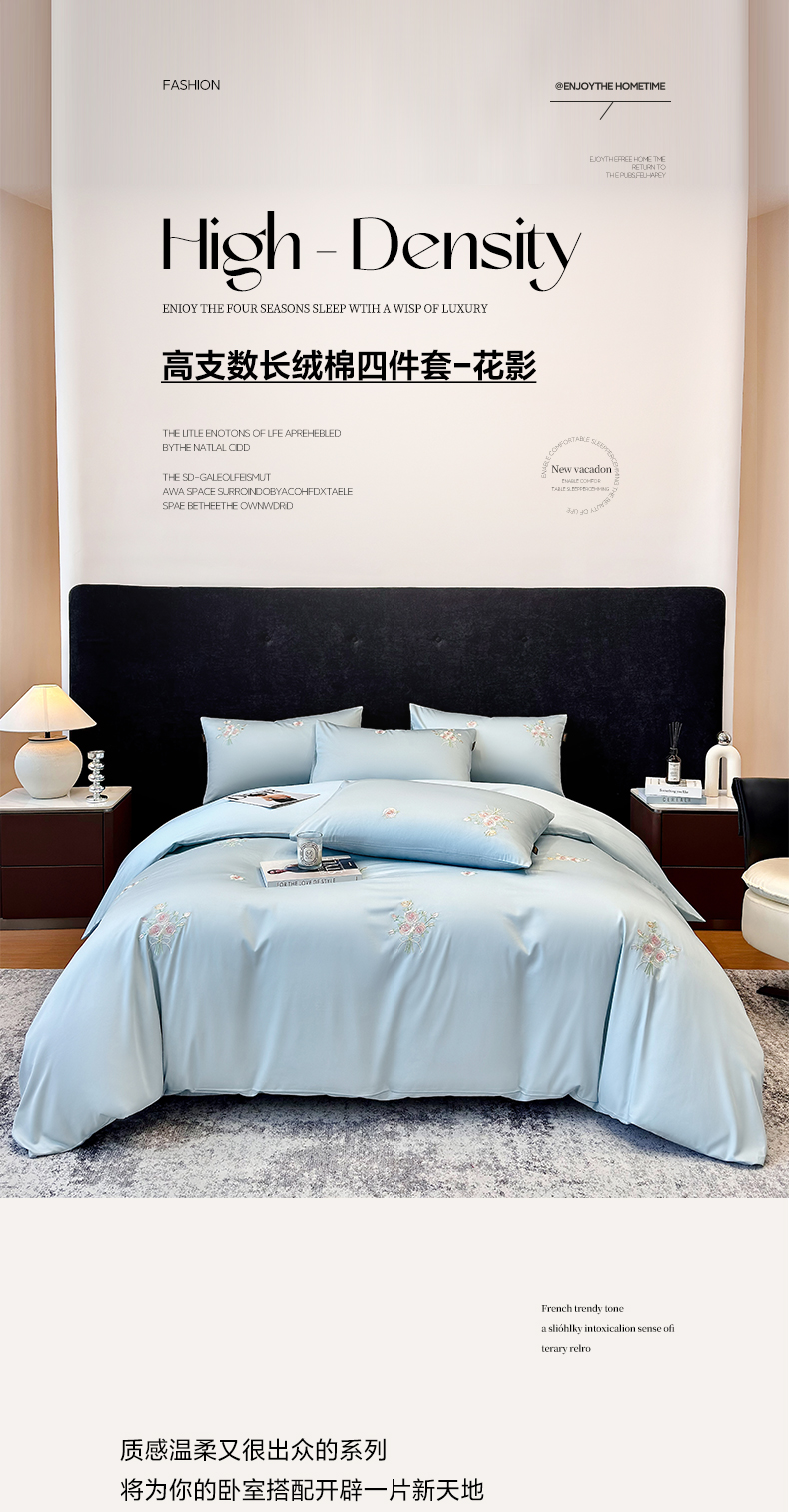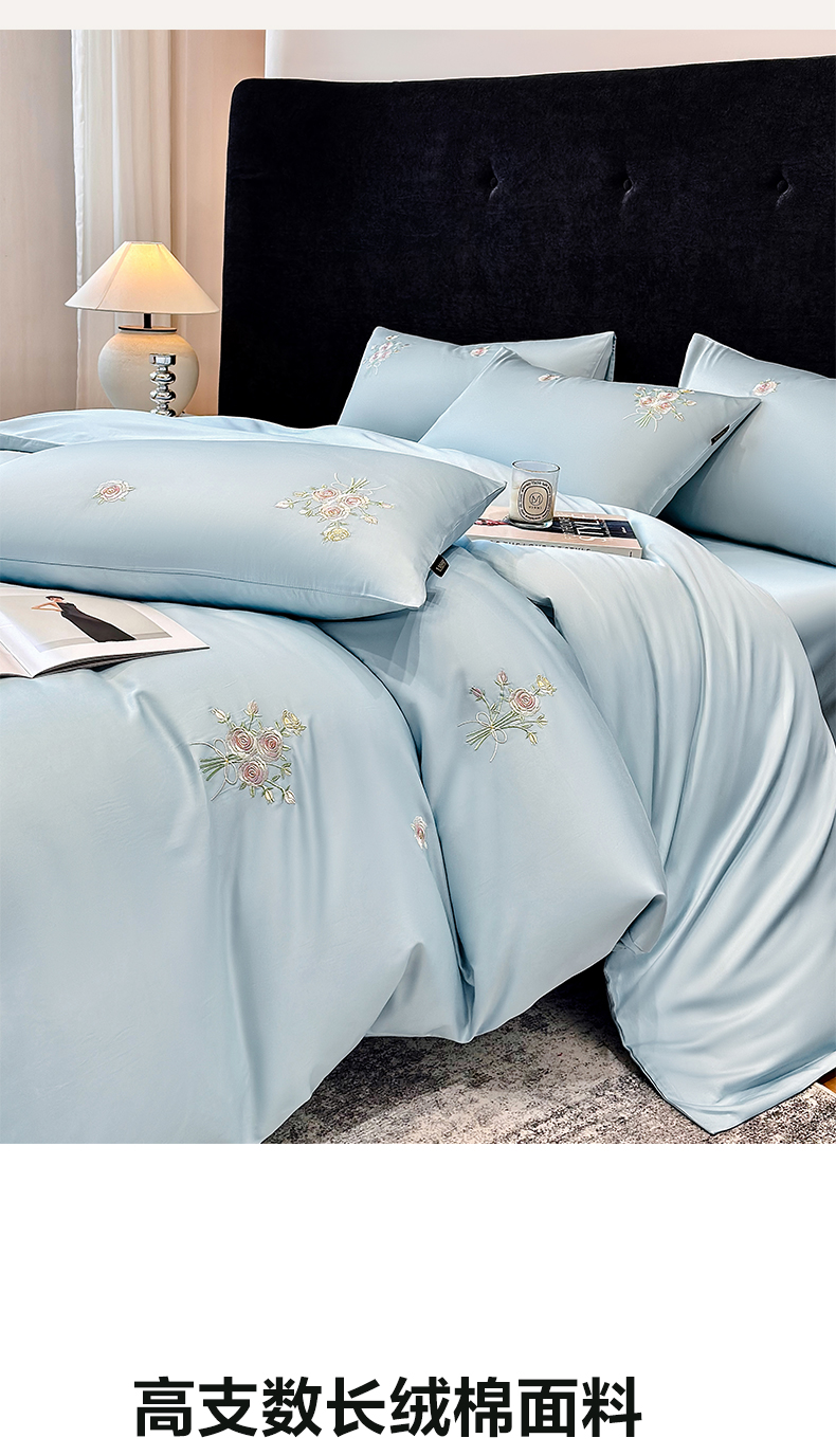 欣宜家纺 2026新款50s纯棉全棉贡缎长绒棉刺绣绣花床上四件套【含高端礼盒】-花影系列 花影-天空蓝