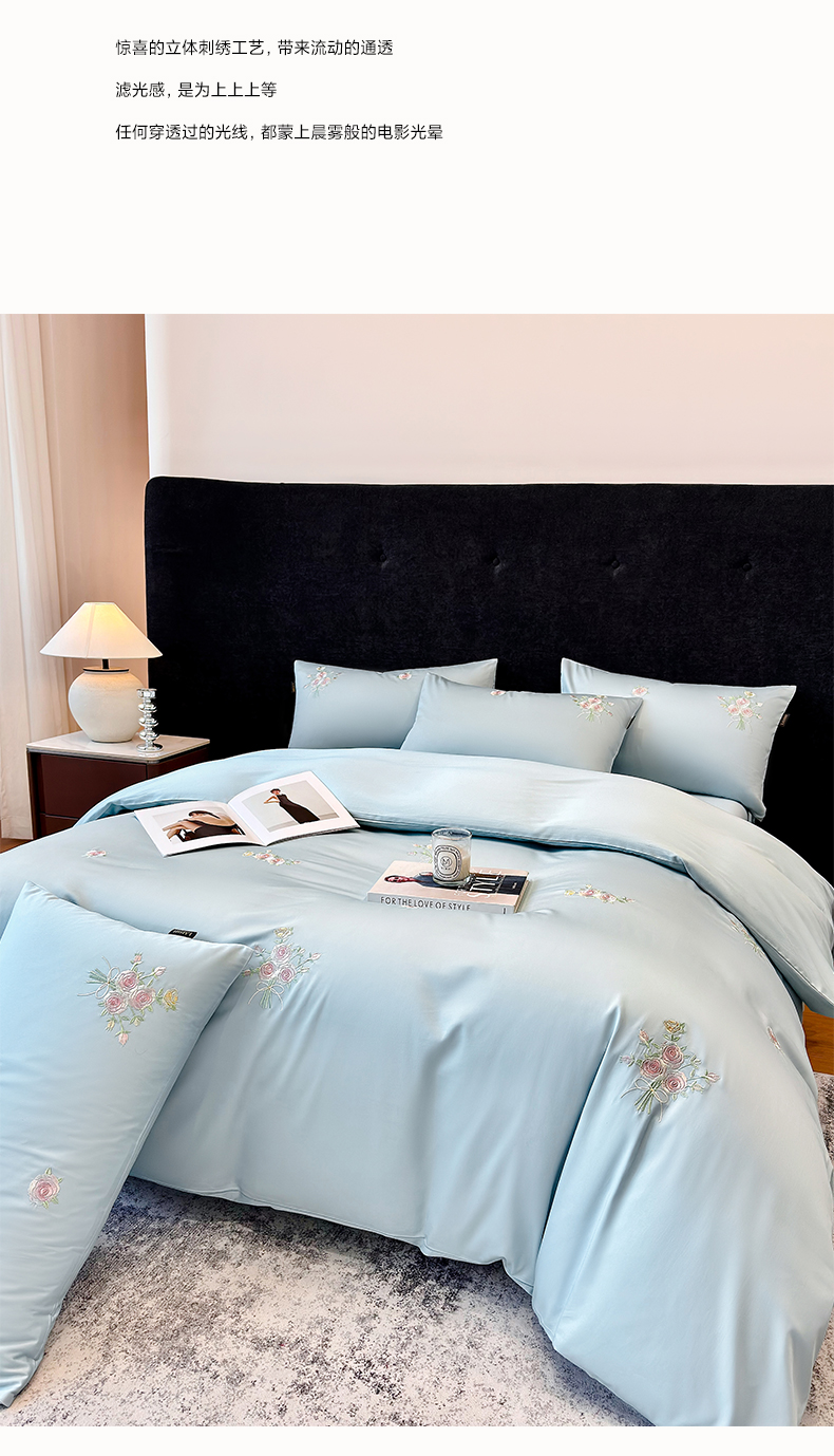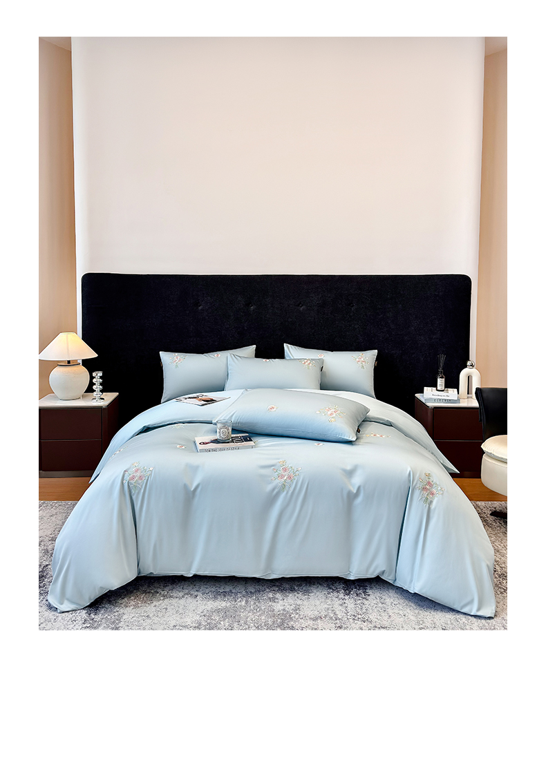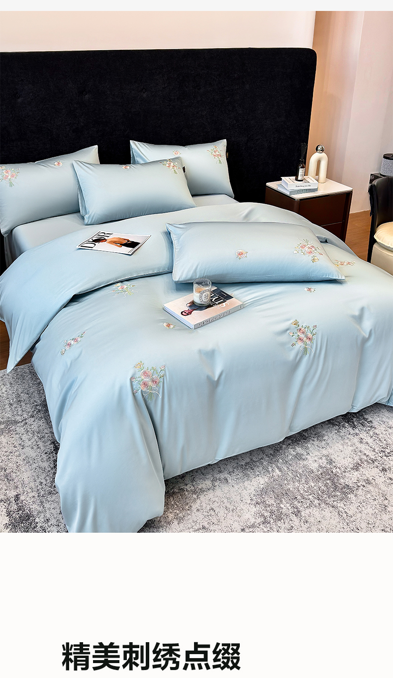 欣宜家纺 2026新款50s纯棉全棉贡缎长绒棉刺绣绣花床上四件套【含高端礼盒】-花影系列 花影-天空蓝