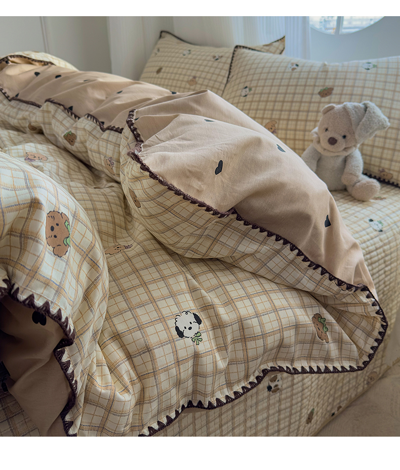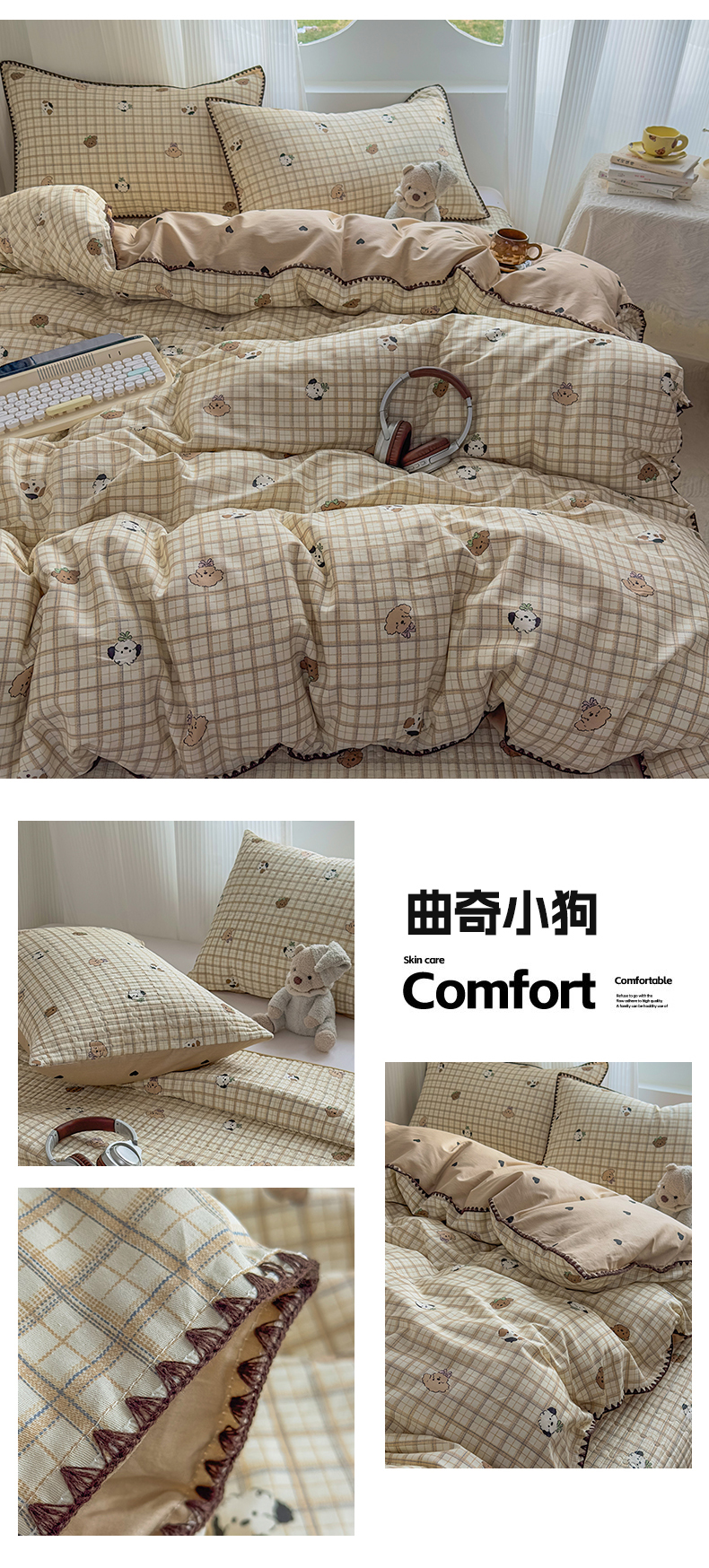 当前位置: 91家纺网 > 商品网购 > 床品套件 > 四件套 > 全棉普通四件套 > KA家纺 2026春夏新款全棉纯棉床盖款卡通印花贝壳边四件套 心心狗