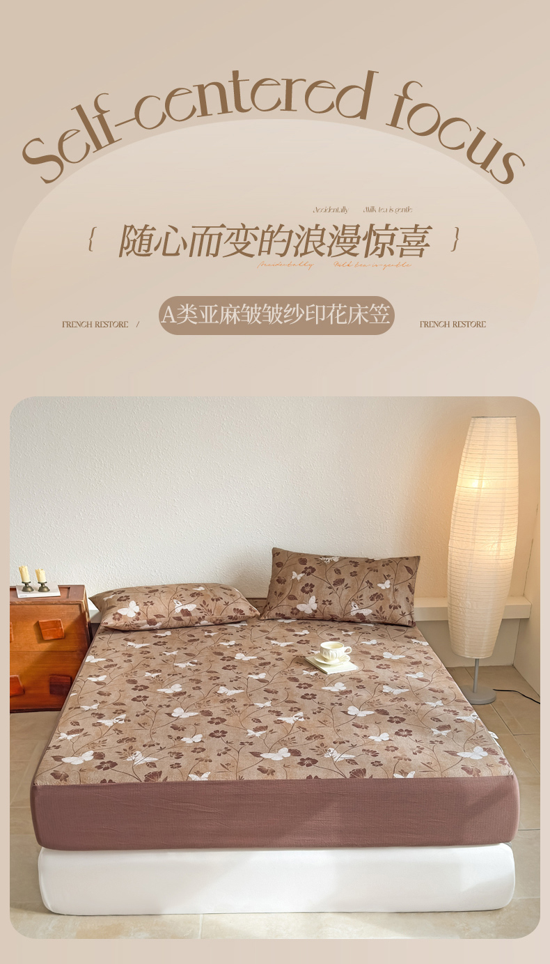 • 91家纺网 家纺一手货源 找家纺 三悦四季 2026新款A类亚麻皱皱纱床笠双层纱床笠三件套四季款 芋泥繁花