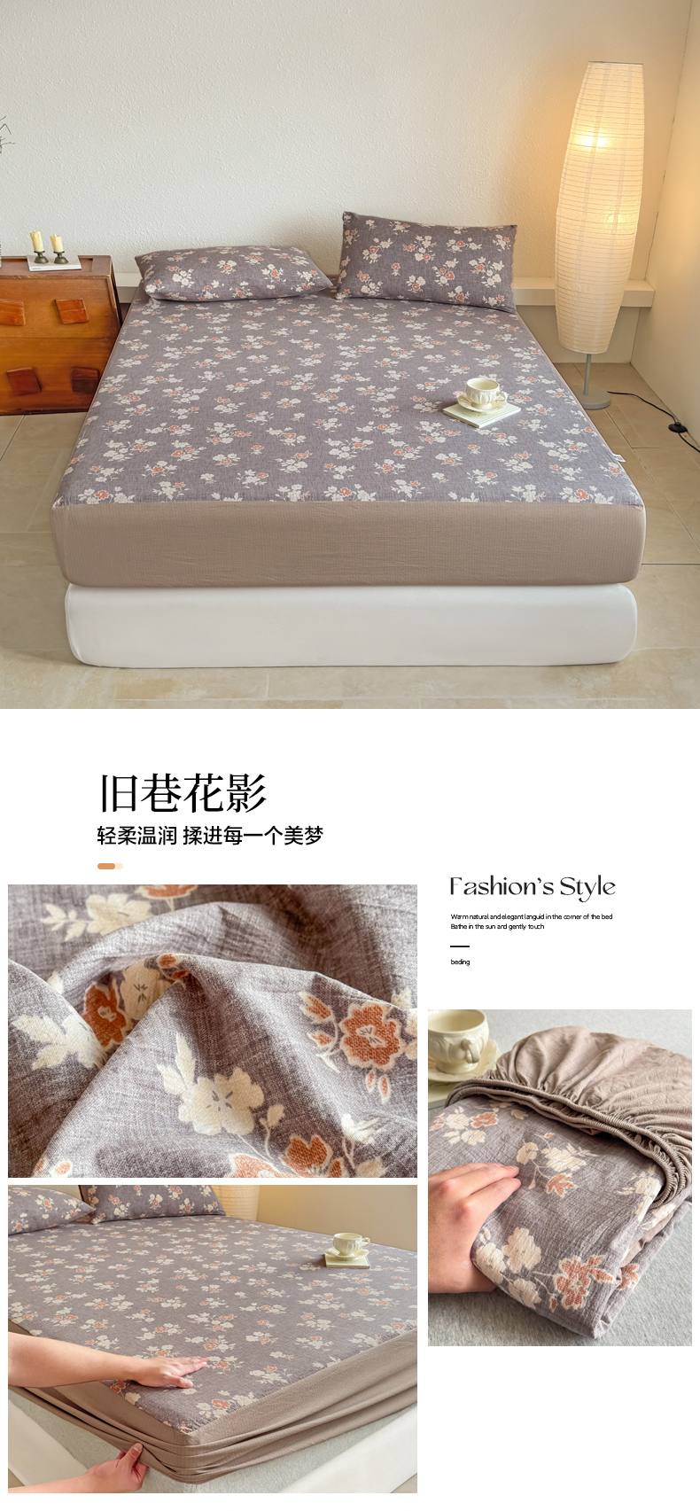 三悦四季 2026新款A类亚麻皱皱纱床笠双层纱床笠三件套四季款 芋泥繁花