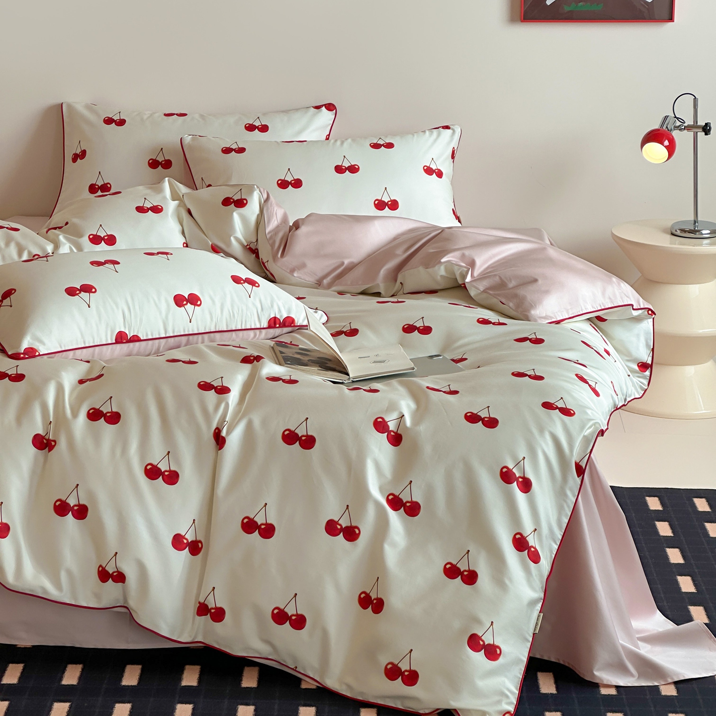 (总)桔子家纺 2026春夏新款100s全棉纯棉复古樱桃系列四件套-场景二,复古樱桃-粉,复古樱桃-米白