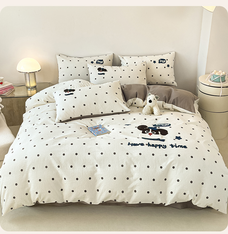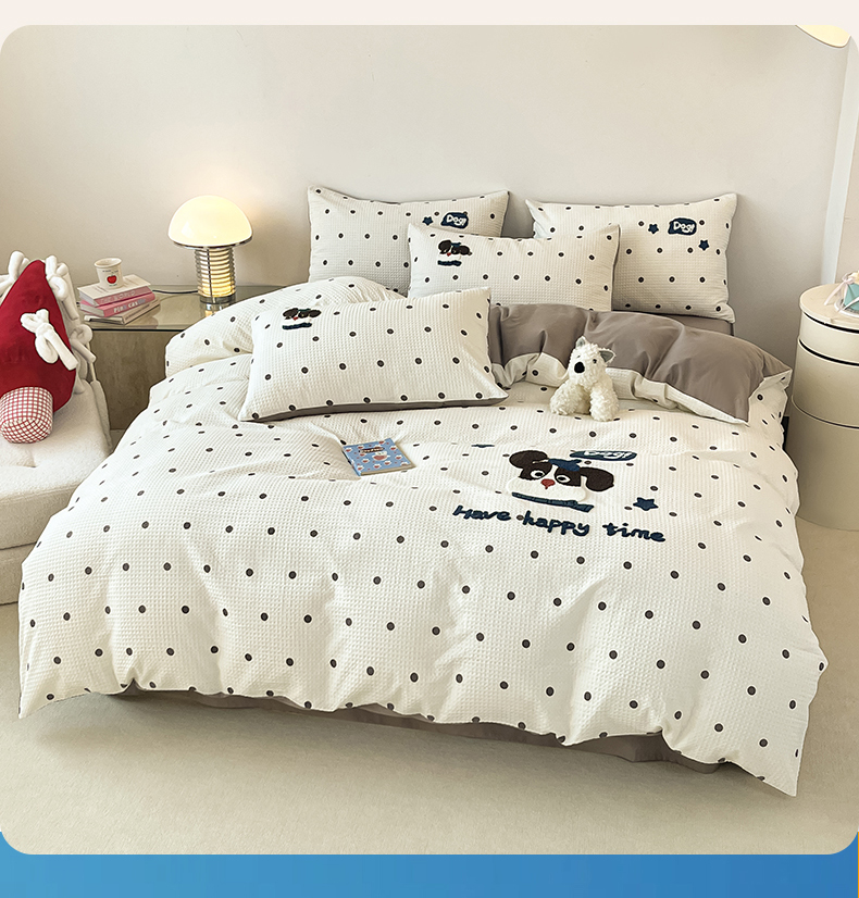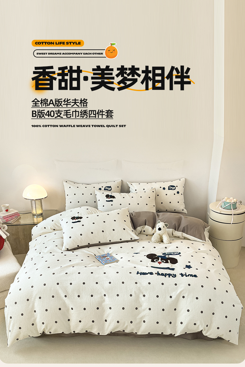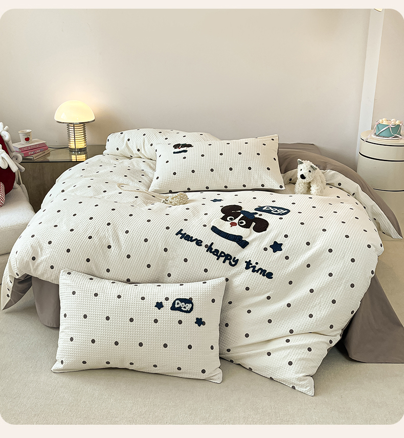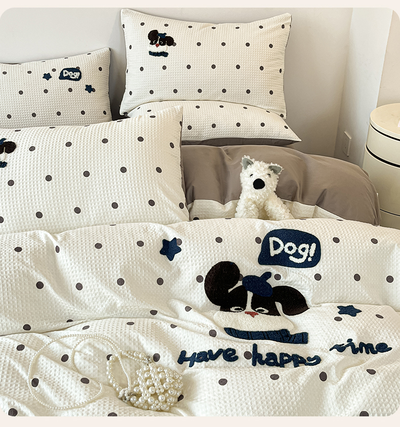 当前位置: 91家纺网 > 商品网购 > 床品套件 > 四件套 > 全棉普通四件套 > 眷恋家纺 2026新款全棉纯棉A版华夫格B版40支毛巾绣四件套 圆点小狗