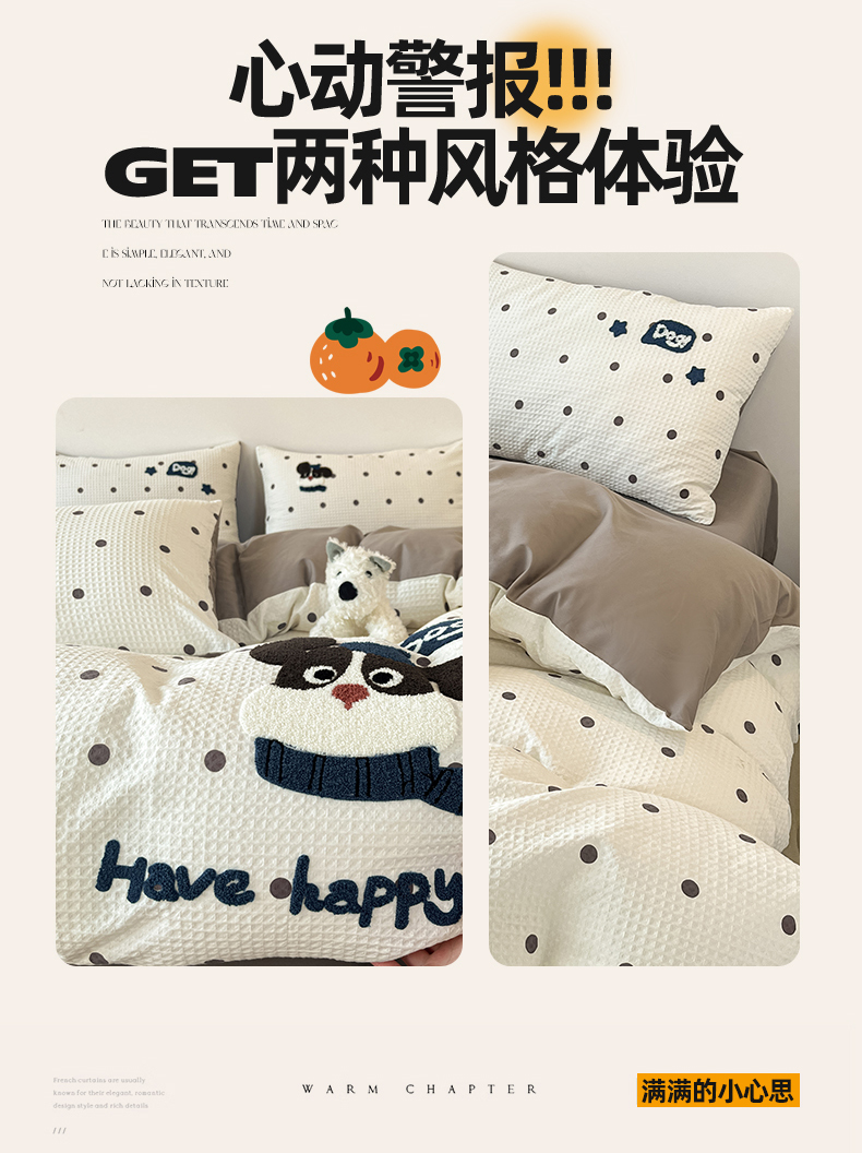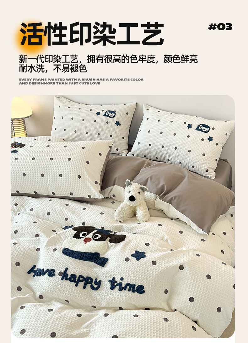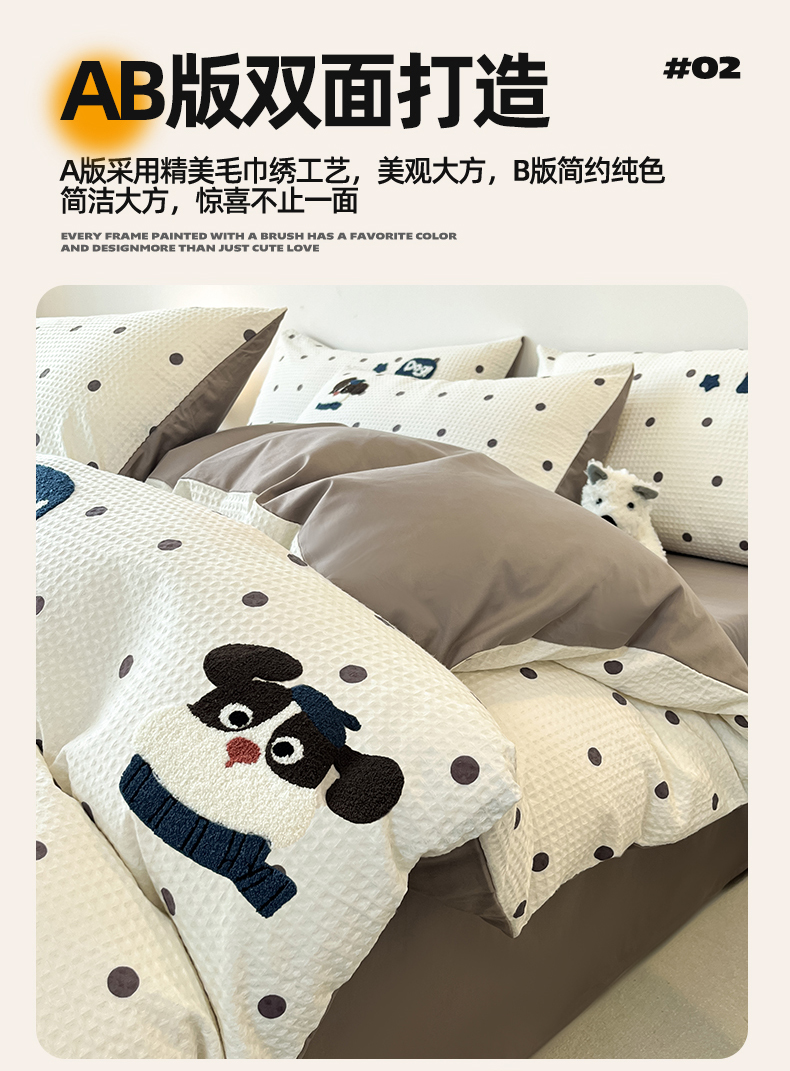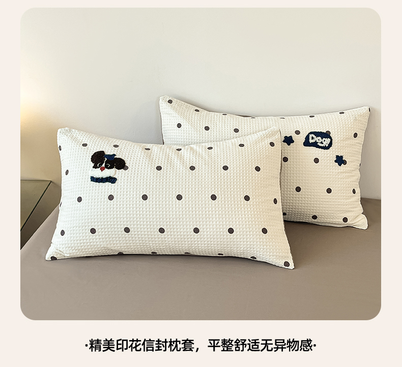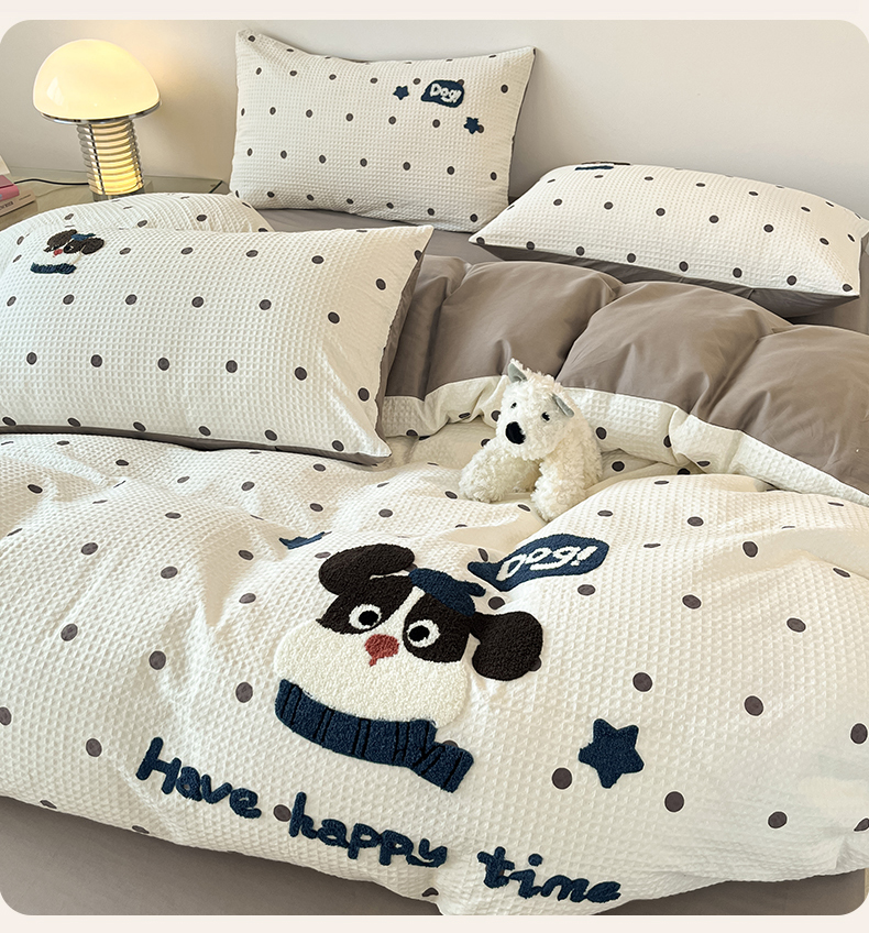 当前位置: 91家纺网 > 商品网购 > 床品套件 > 四件套 > 全棉普通四件套 > 眷恋家纺 2026新款全棉纯棉A版华夫格B版40支毛巾绣四件套 圆点小狗