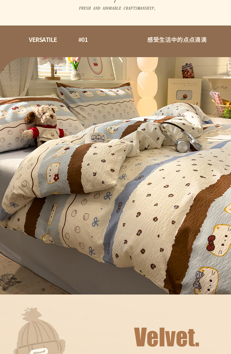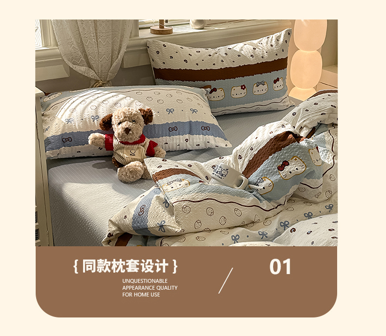 当前位置: 91家纺网 > 商品网购 > 床品套件 > 四件套 > 化纤普通四件套 > 老K (原美阁) 2026新款费尔岛泡芙棉四件套简约款单被套四件套 甜心凯特猫-蓝