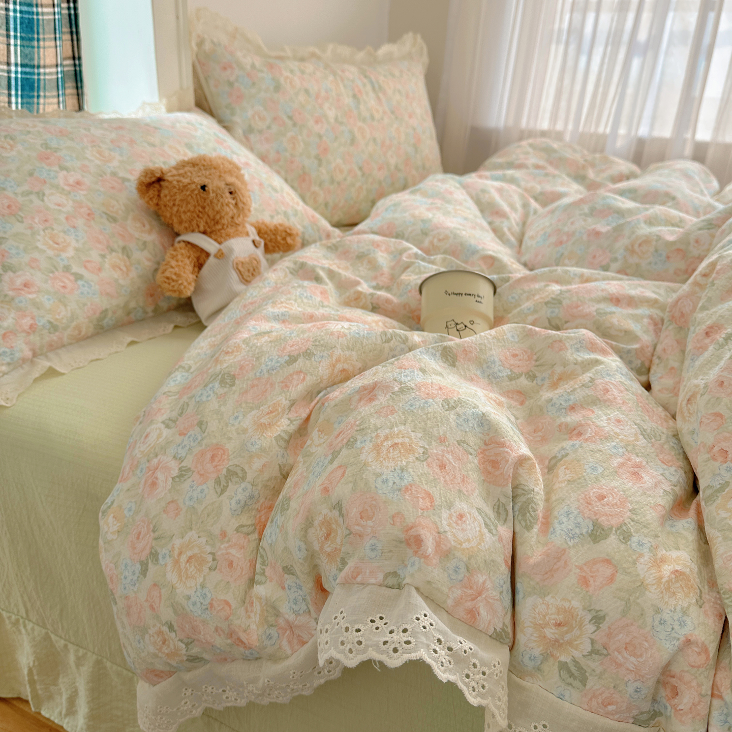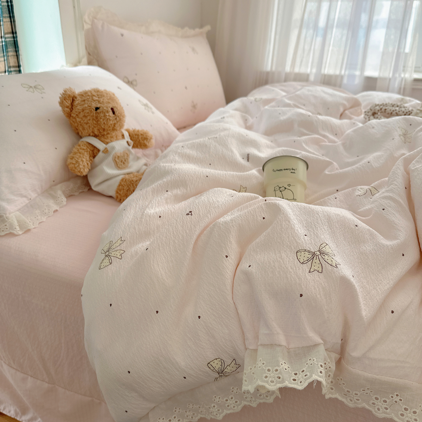 一比一家纺 2026新款彩色花边木棉皱皱纱四件套 野餐兔