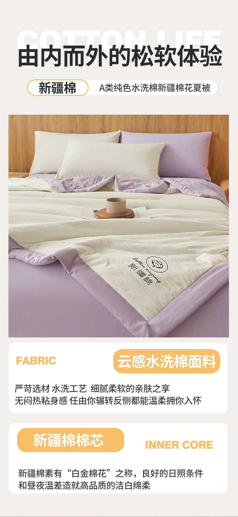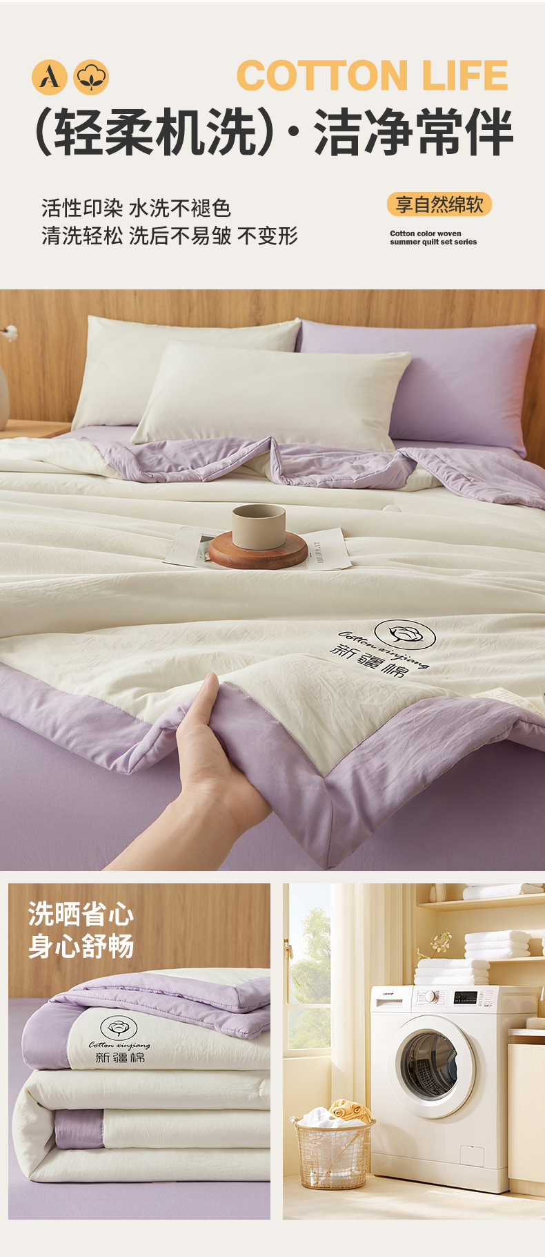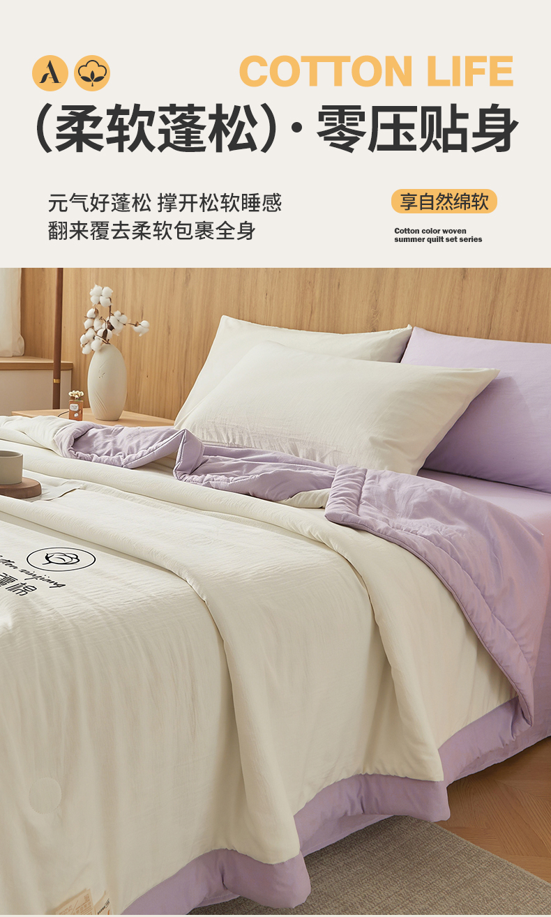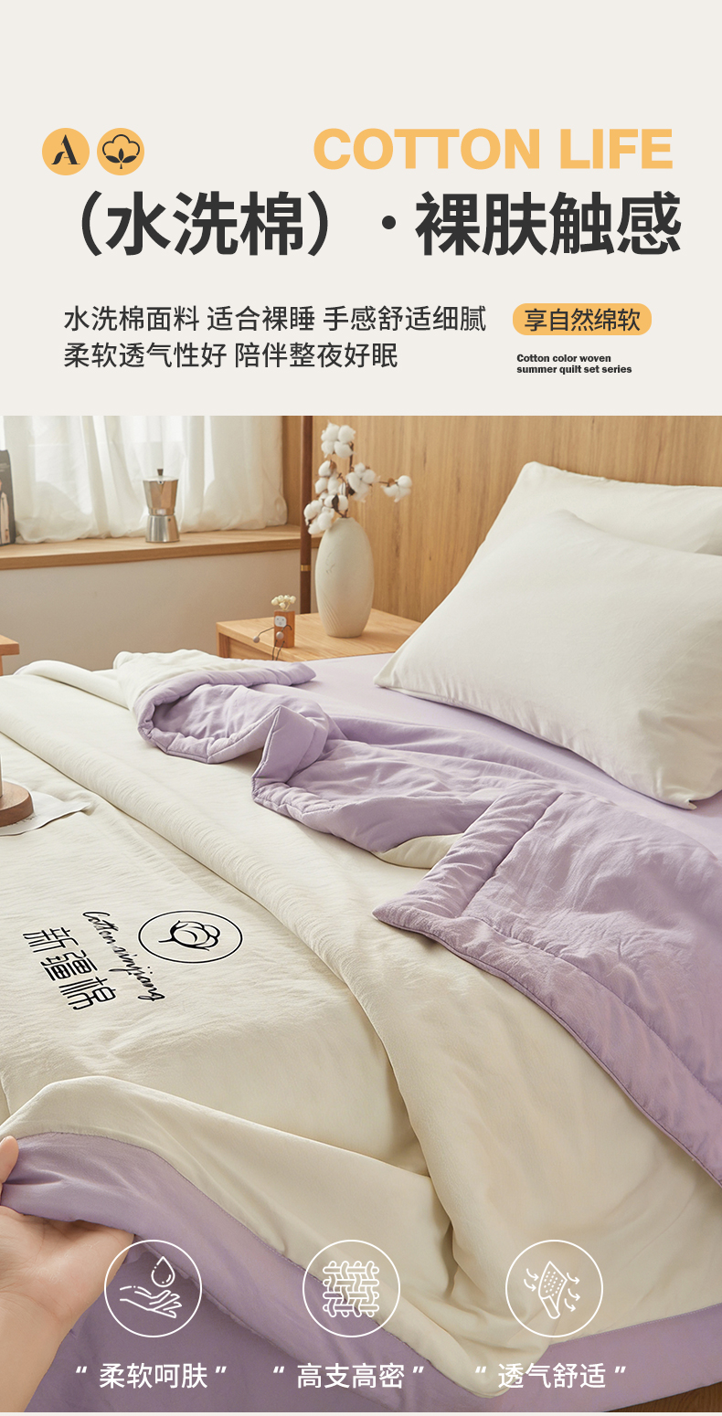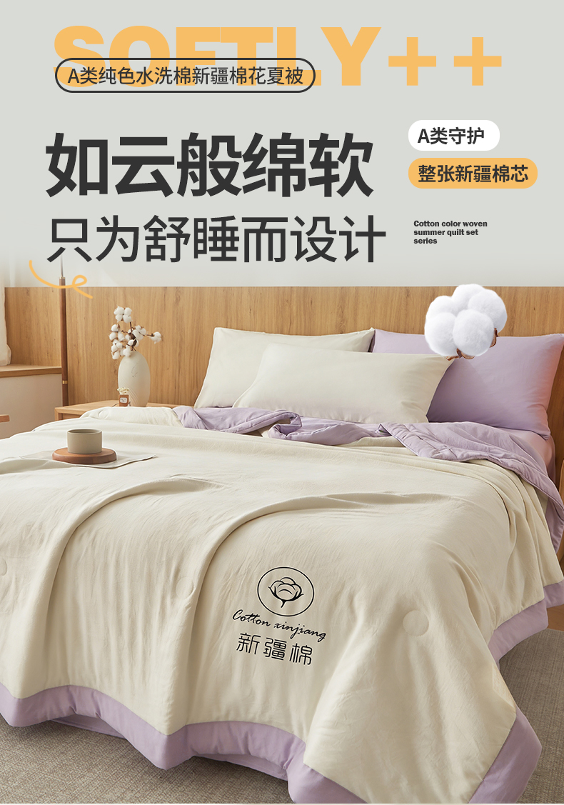 商品名称:晓时候 2026春夏新款纯色水洗棉双拼夏被新疆棉花被夏凉被空调被被子被芯-素夏 素夏-白紫