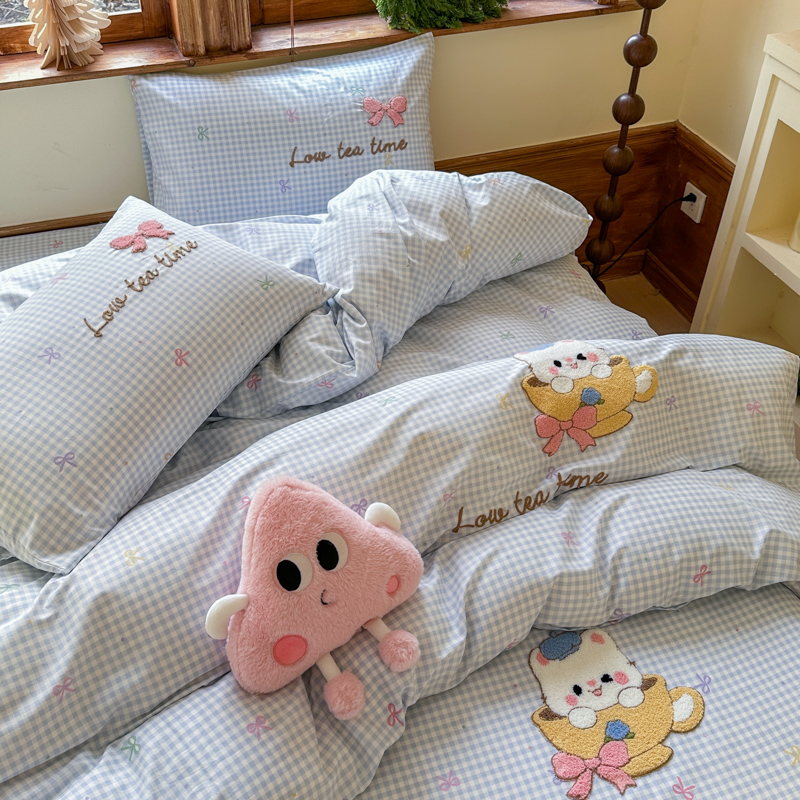 商品名称:布柔 2026春夏新款13070纯棉全棉印花绣花床笠三件套四件套 曲奇蓝